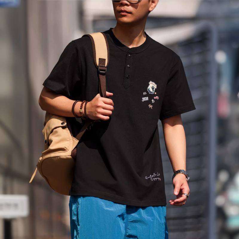 American casual 250g Henley collar short-sleeved T-shirt for men, loose fit, fun print, pure cotton base layer.