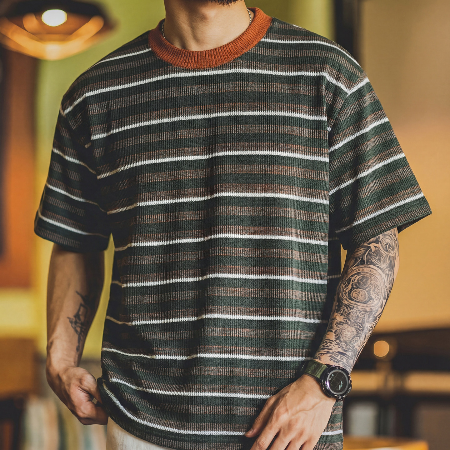 American retro color-blocked striped knit short-sleeved t-shirt for men, 2026 summer, loose fit, plus size, casual round neck top.