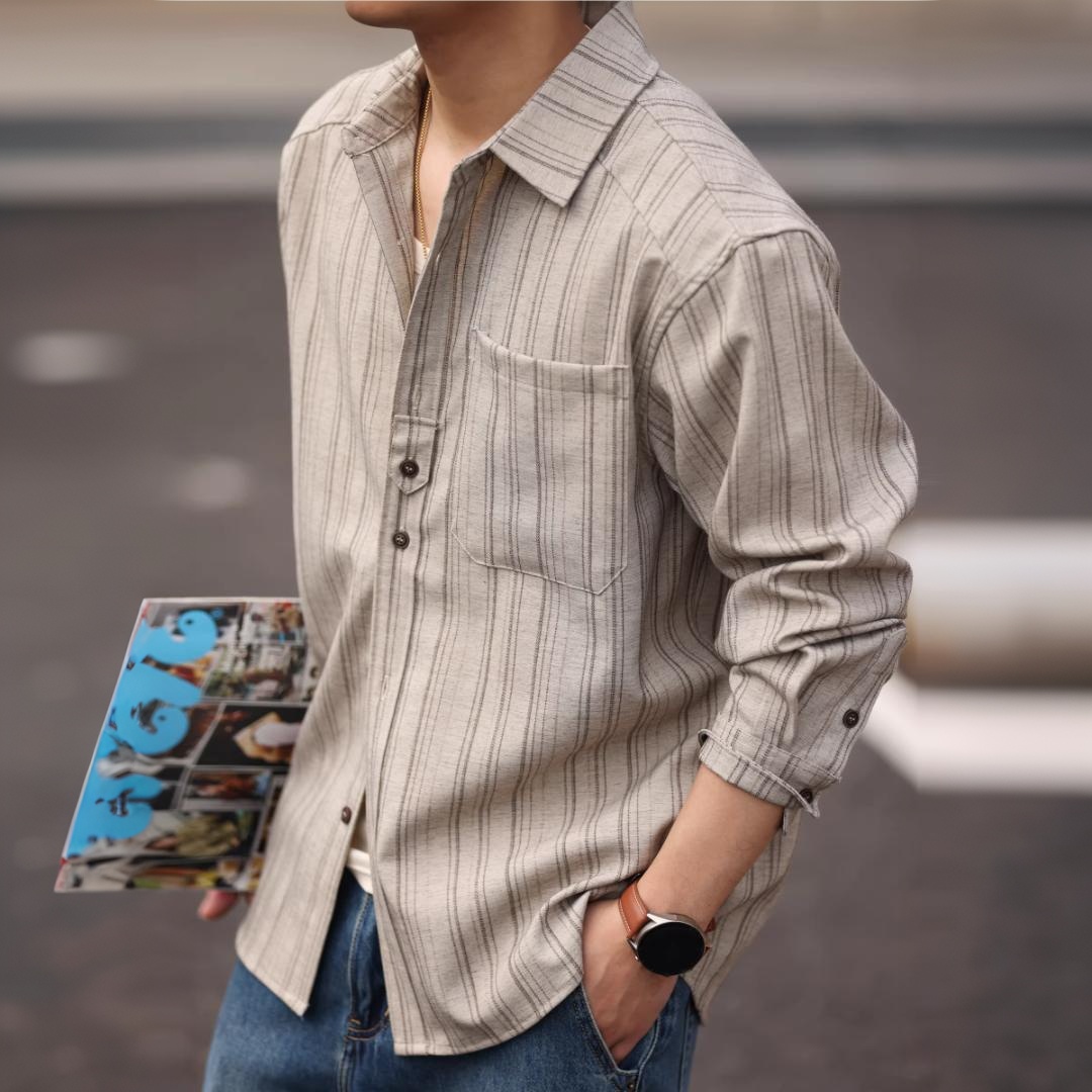 American retro striped workwear long-sleeved shirt for men, crisp and structured, perfect as an outer layer for spring.