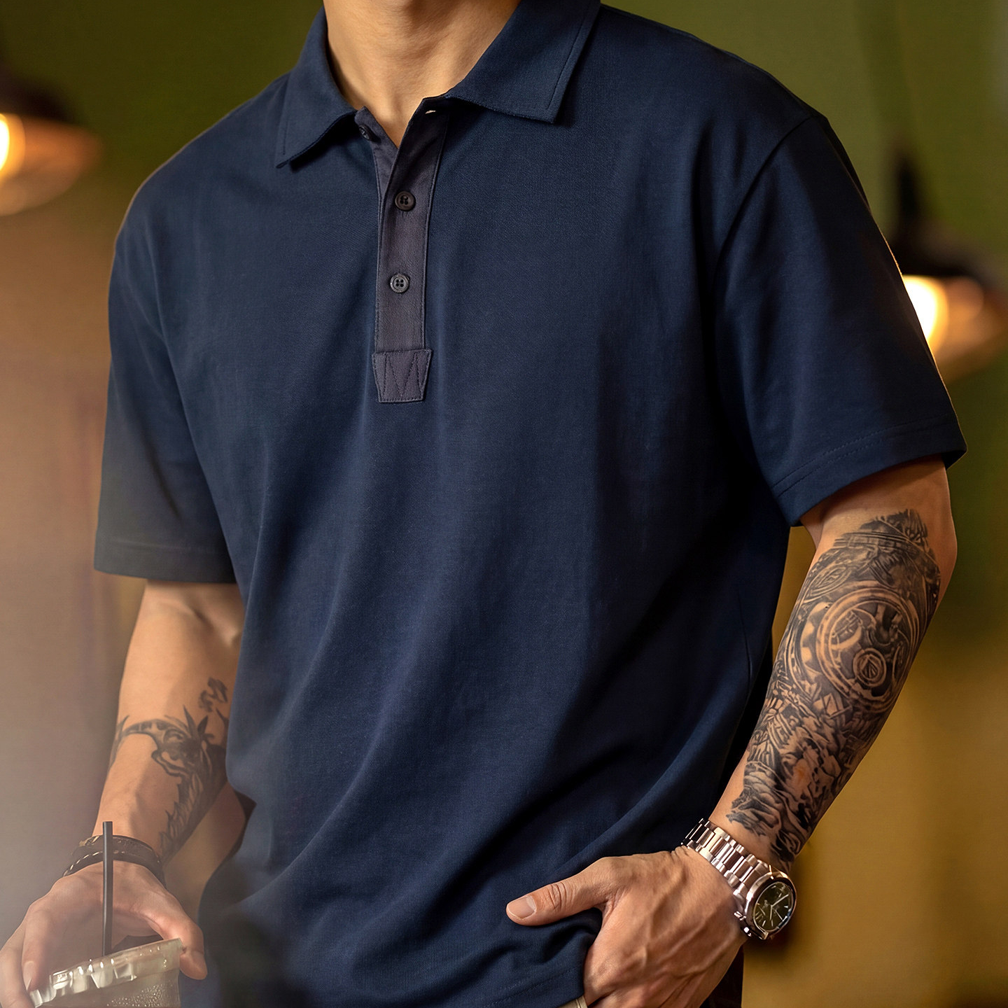 American retro polo shirt, short sleeve, men's summer new style, loose fit, breathable navy blue top, business commuting T-shirt