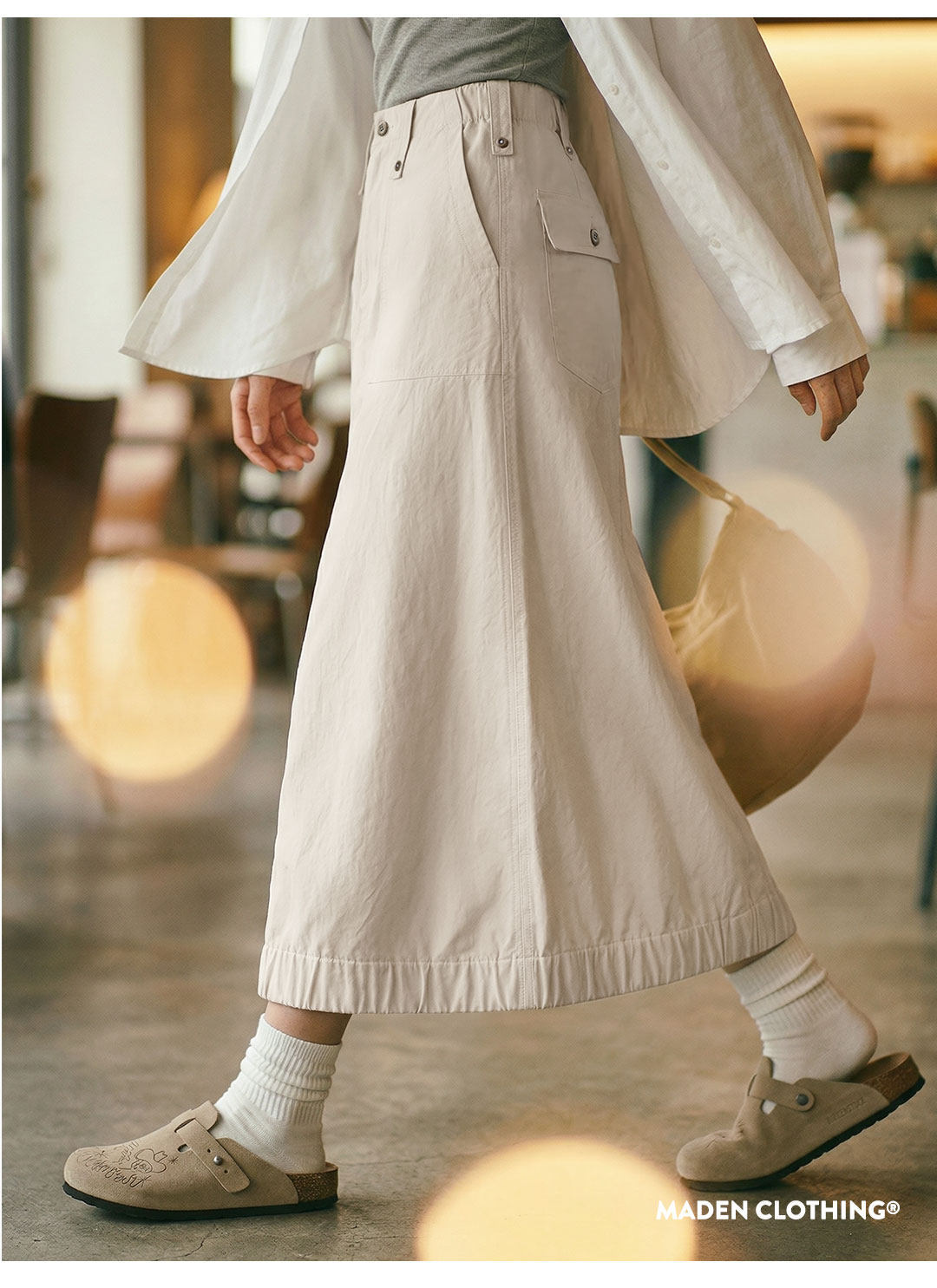 復古米白色高腰垂感顯瘦休閒A字版後開叉直筒工裝半身裙女