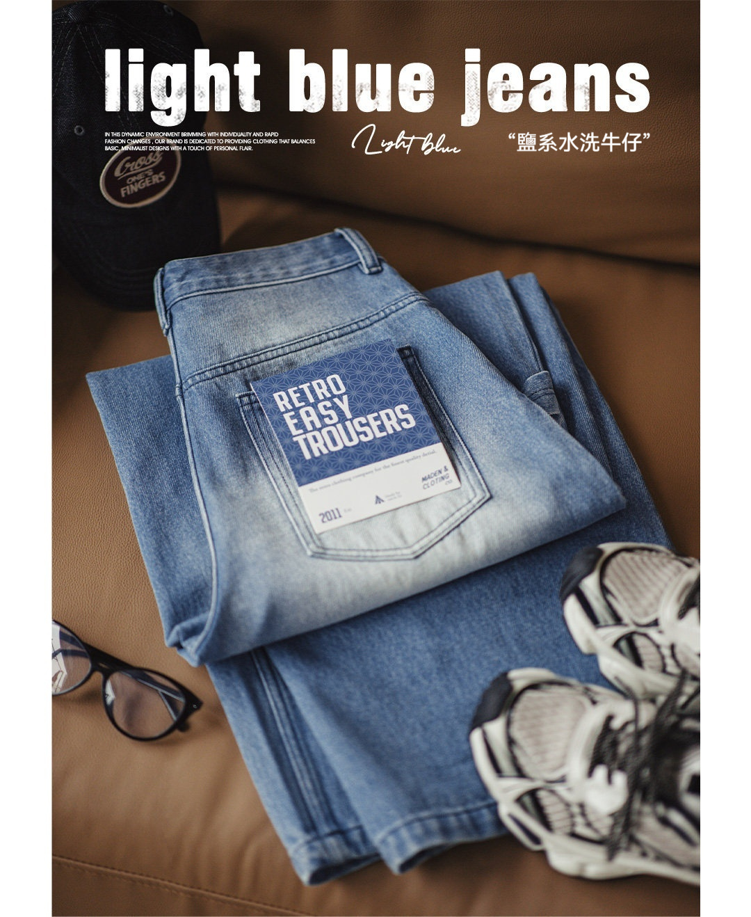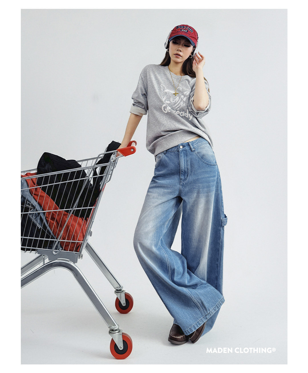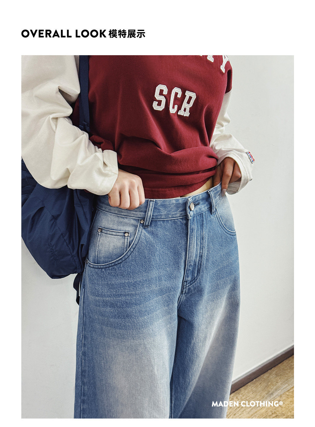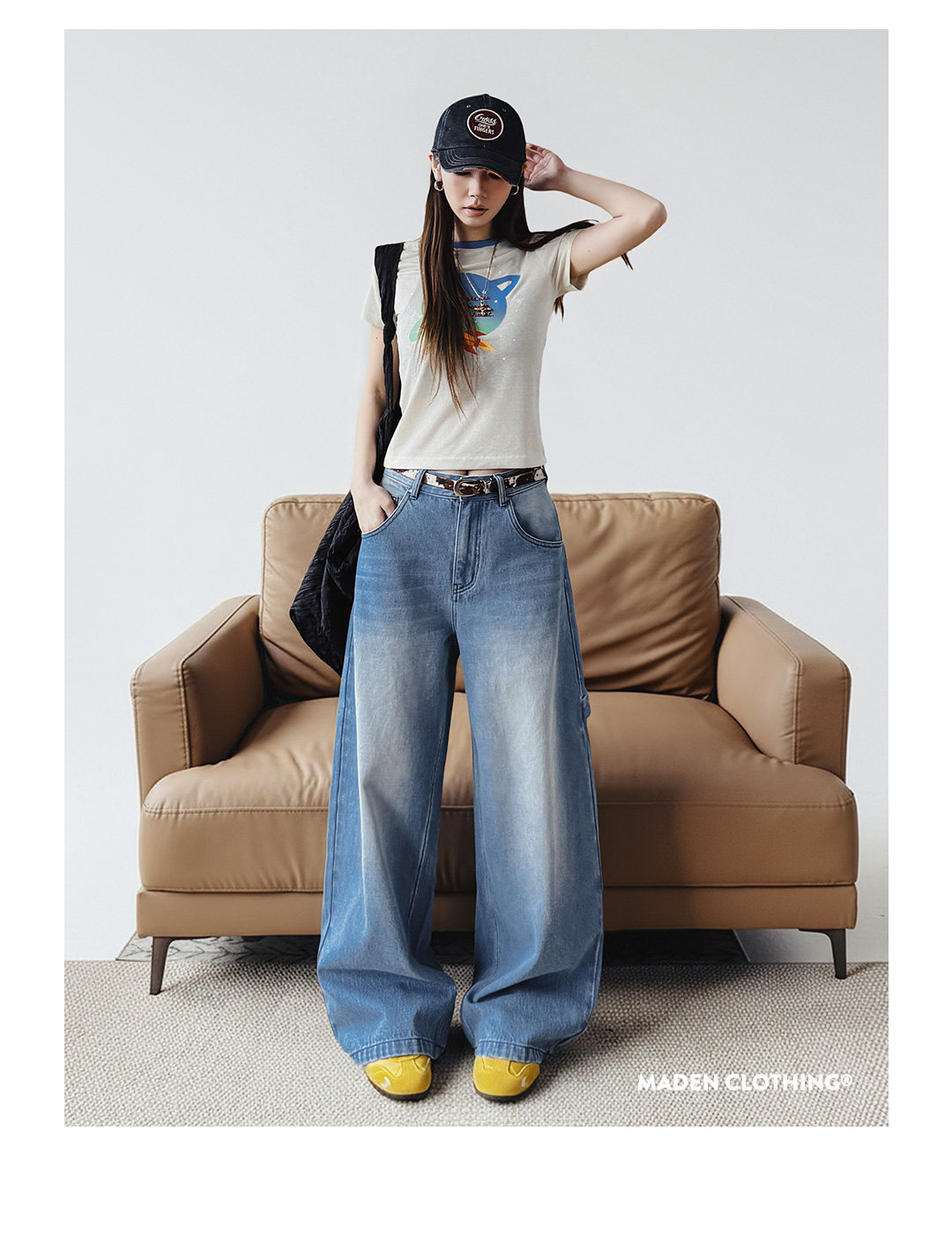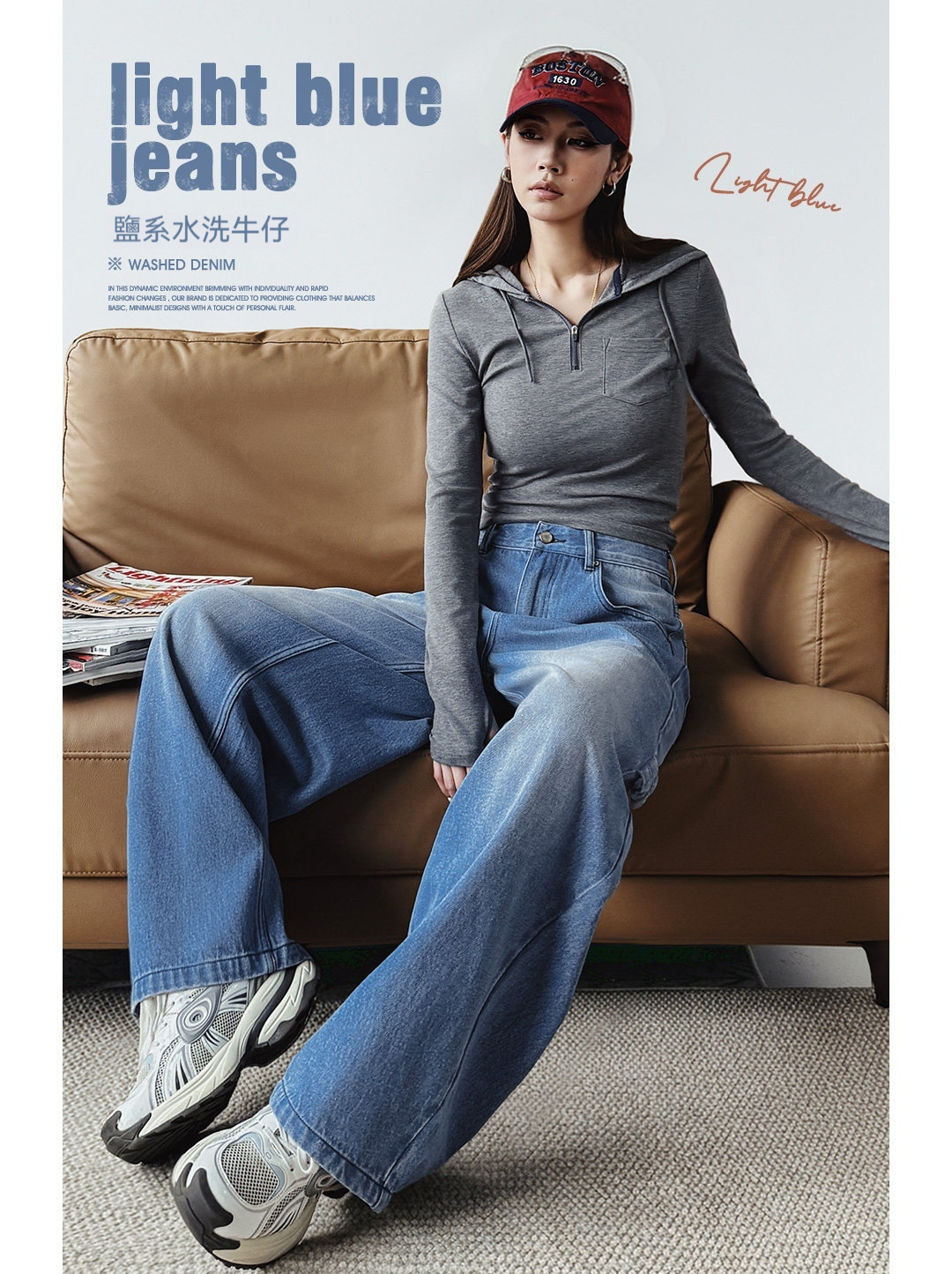 Light blue American retro washed distressed loose wide-leg straight leg denim jeans for women, floor-length trousers, spring style.