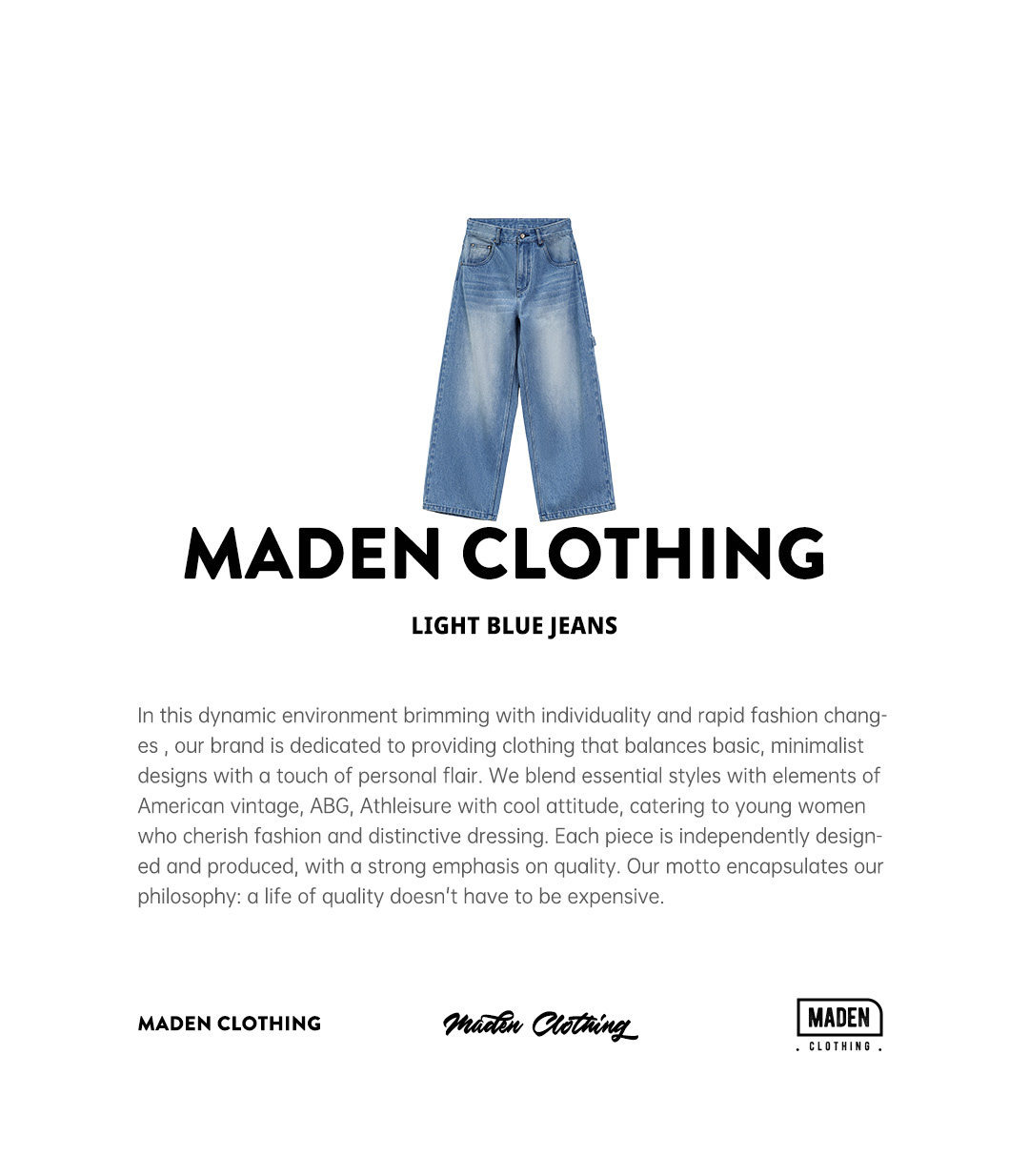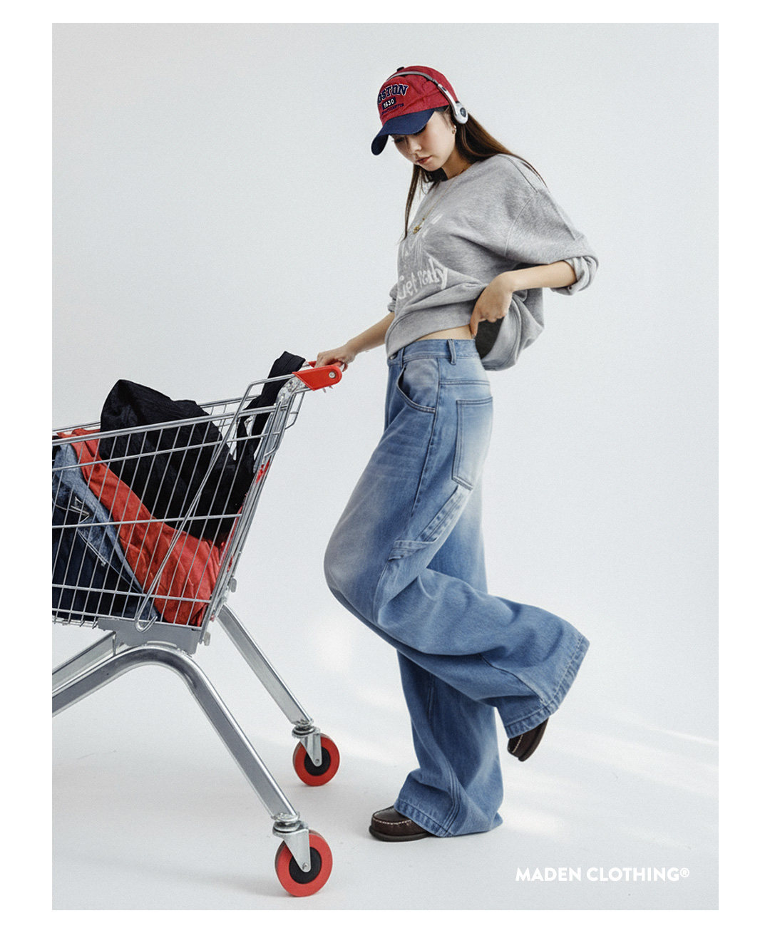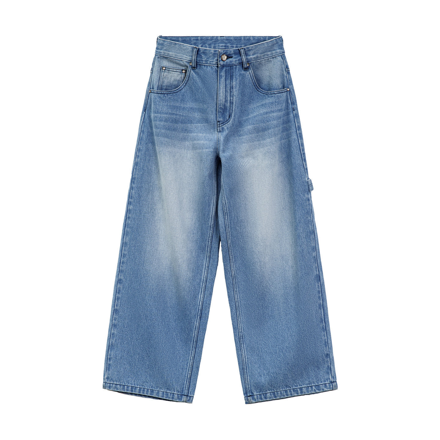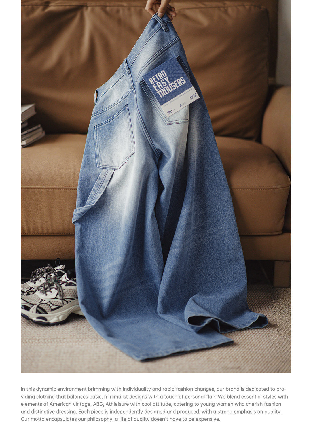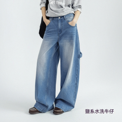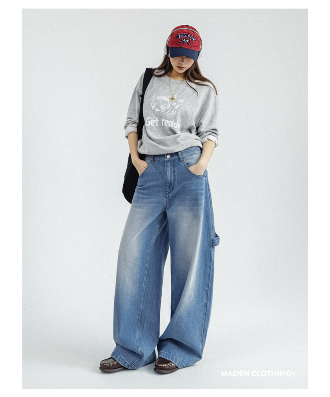 Light blue American retro washed distressed loose wide-leg straight leg denim jeans for women, floor-length trousers, spring style.