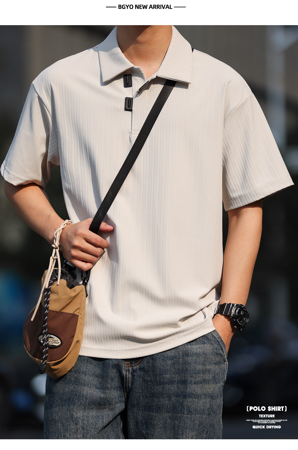American-style casual cool quick-drying polo shirt men's loose wrinkle-resistant vertical stripe textured collar short-sleeved T-shirt