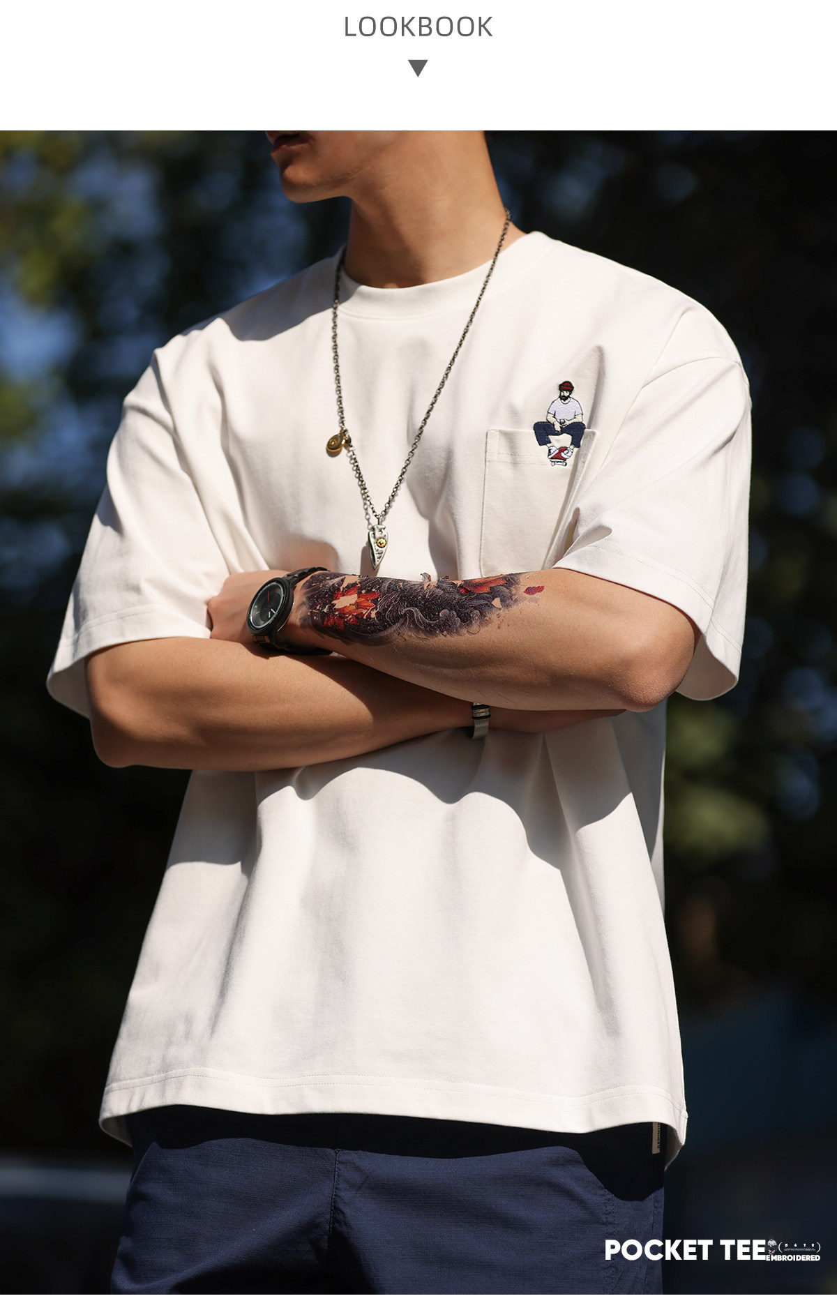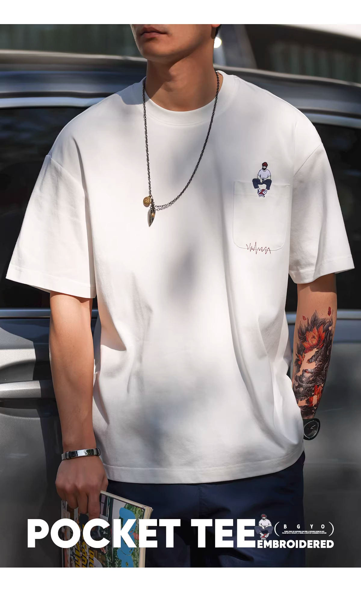 American casual heavyweight embroidered short-sleeved T-shirt for men, with pocket design, white drop shoulder sleeve base layer.