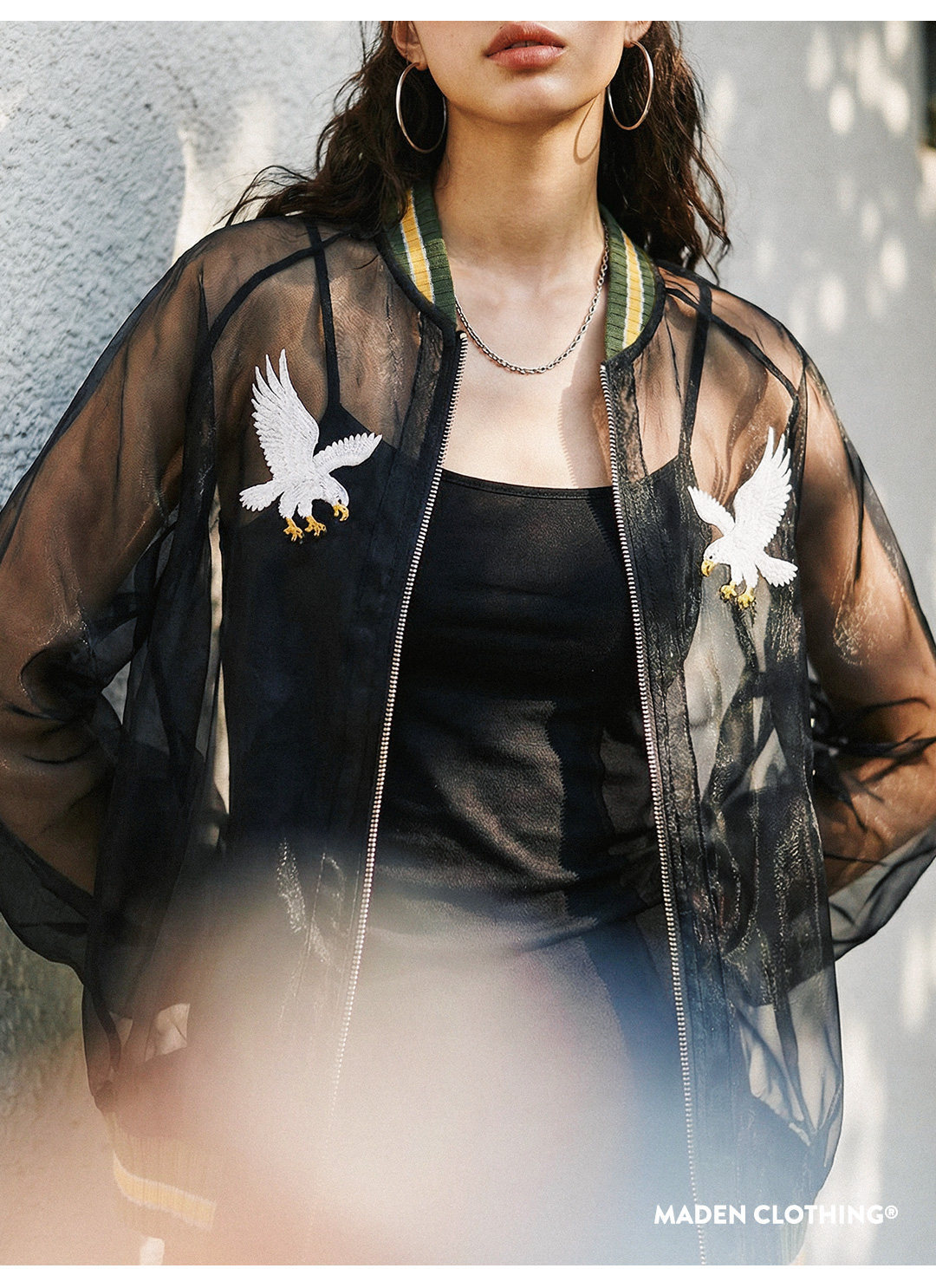 American retro organza embroidered baseball jacket, semi-transparent coat, cover-up top, women's spring style