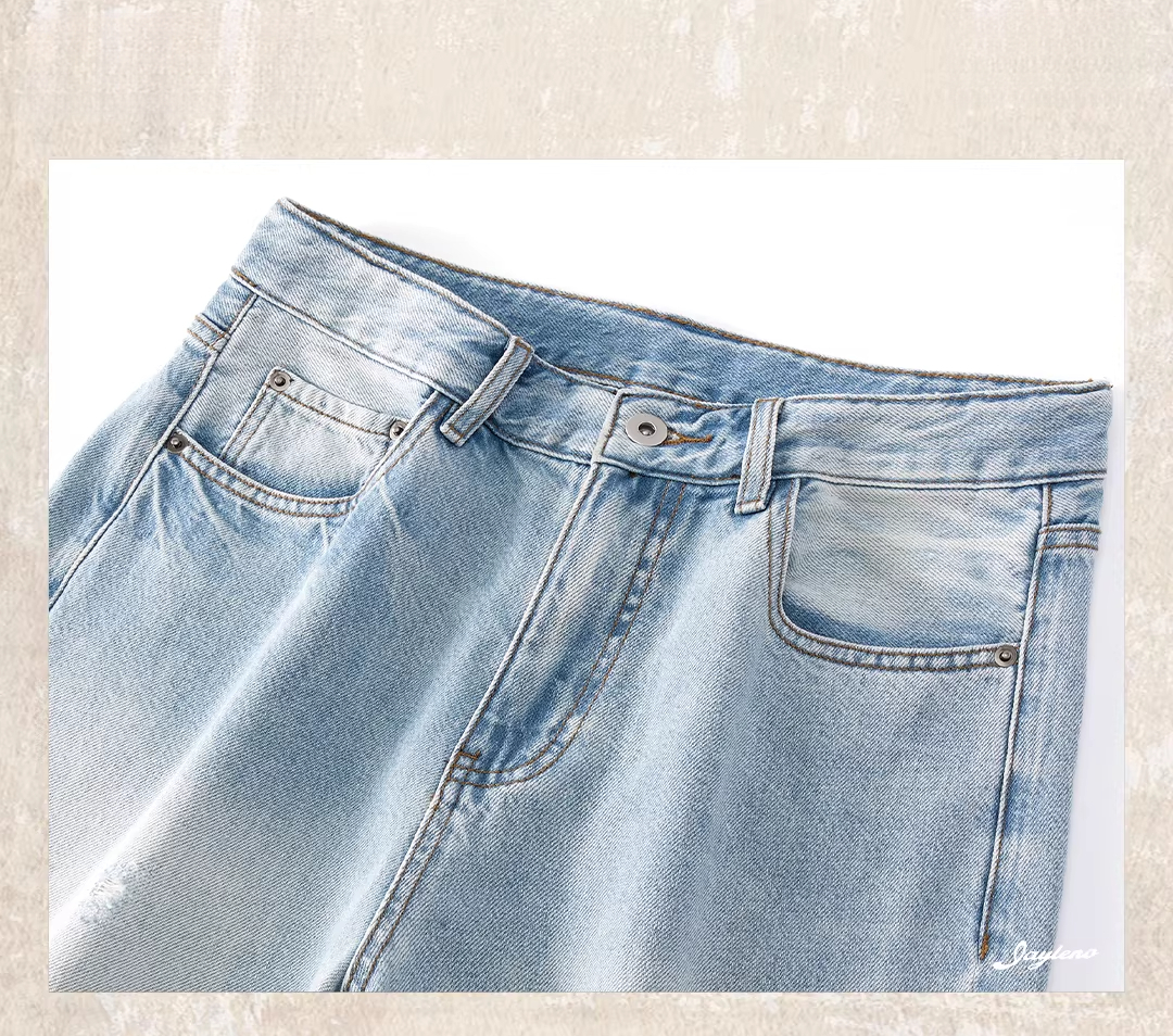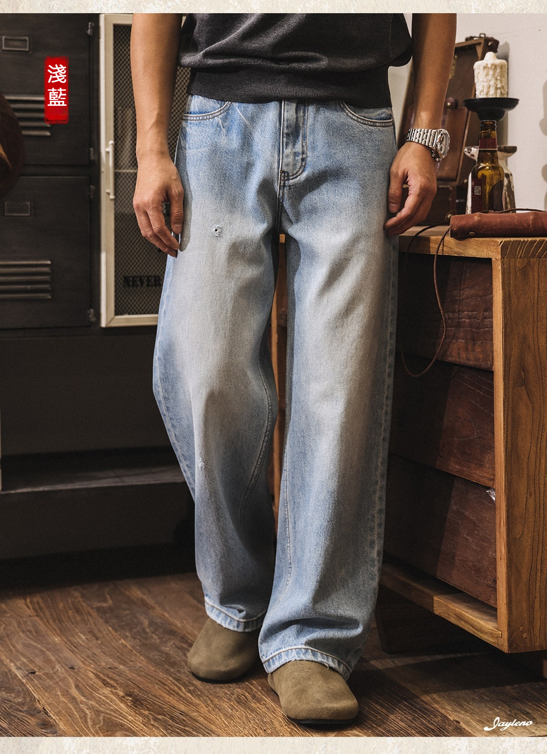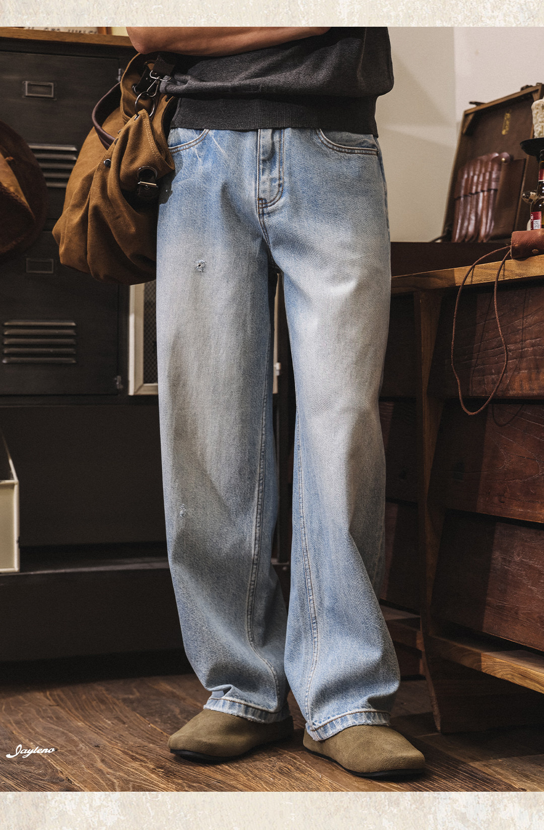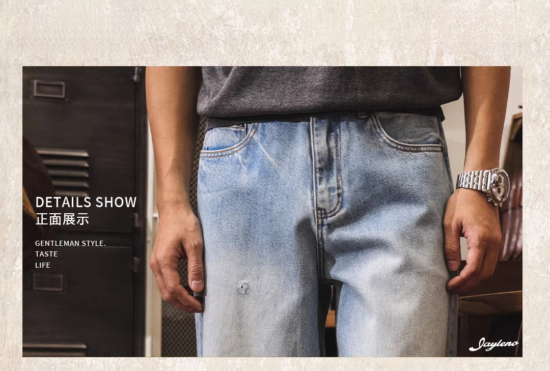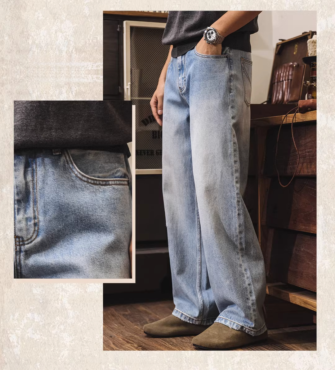 American retro washed and distressed wide-leg jeans for men, new spring 2026 style, trendy loose casual straight leg pants.