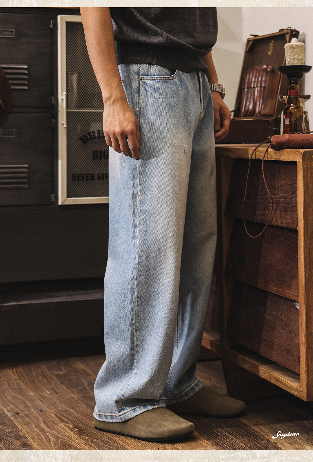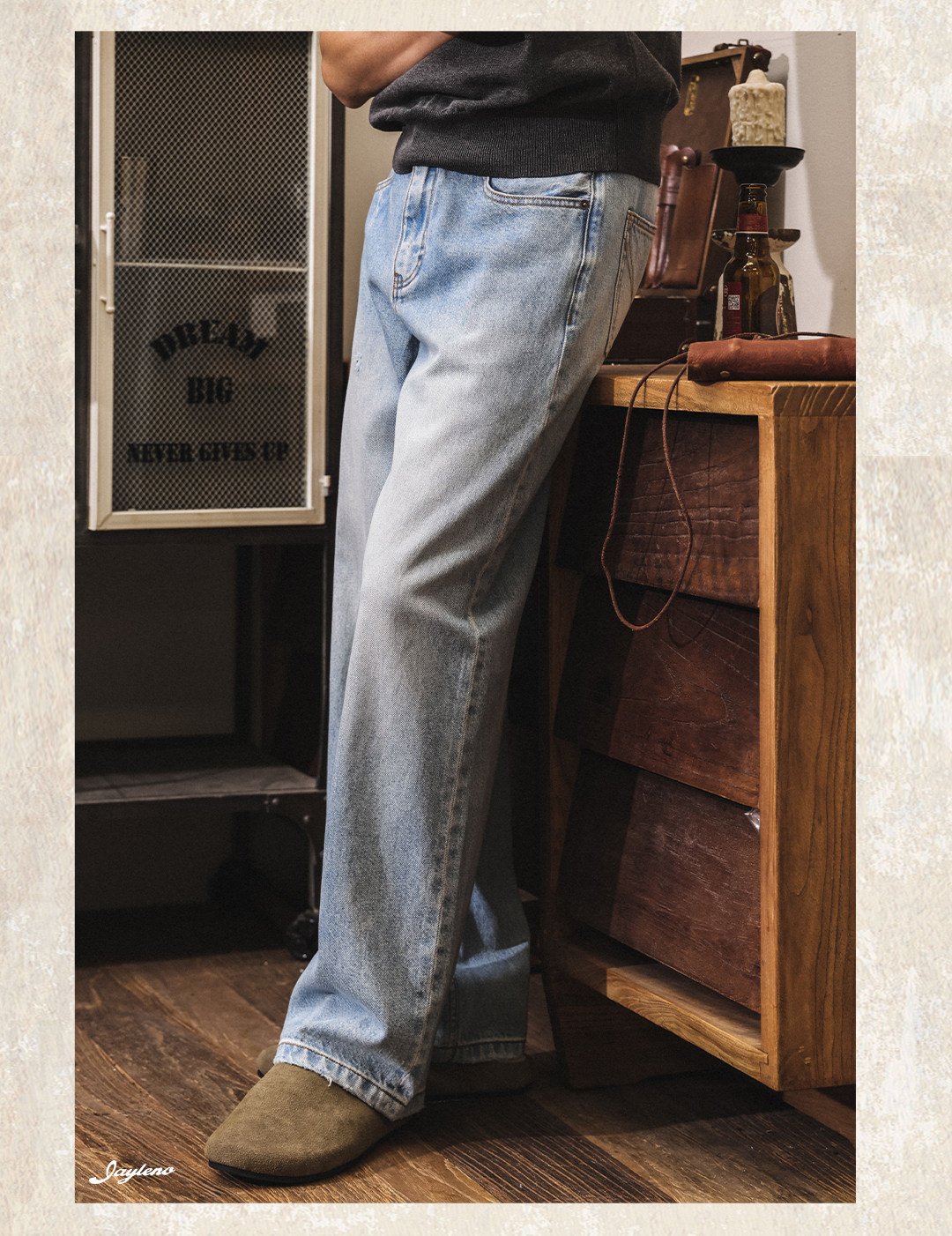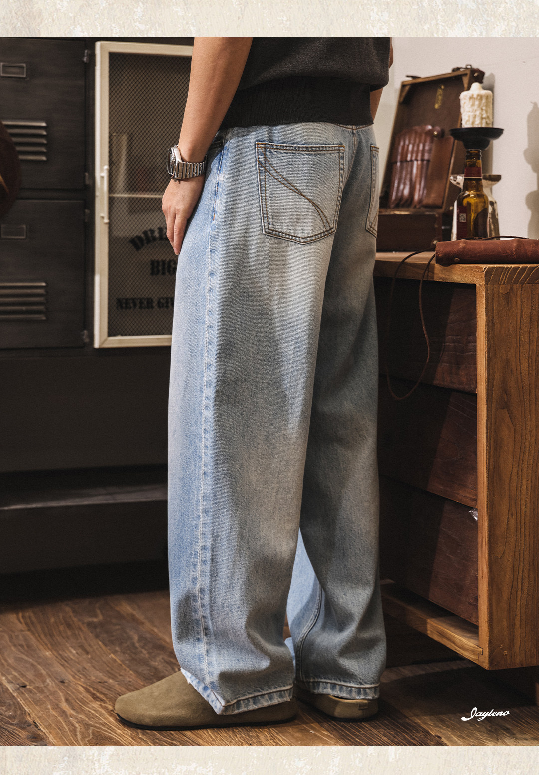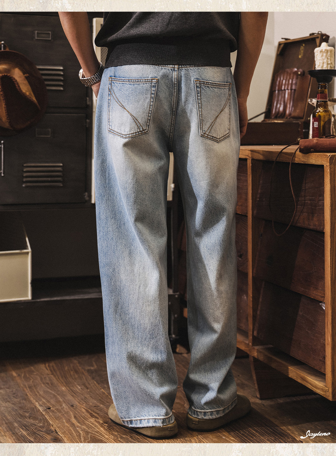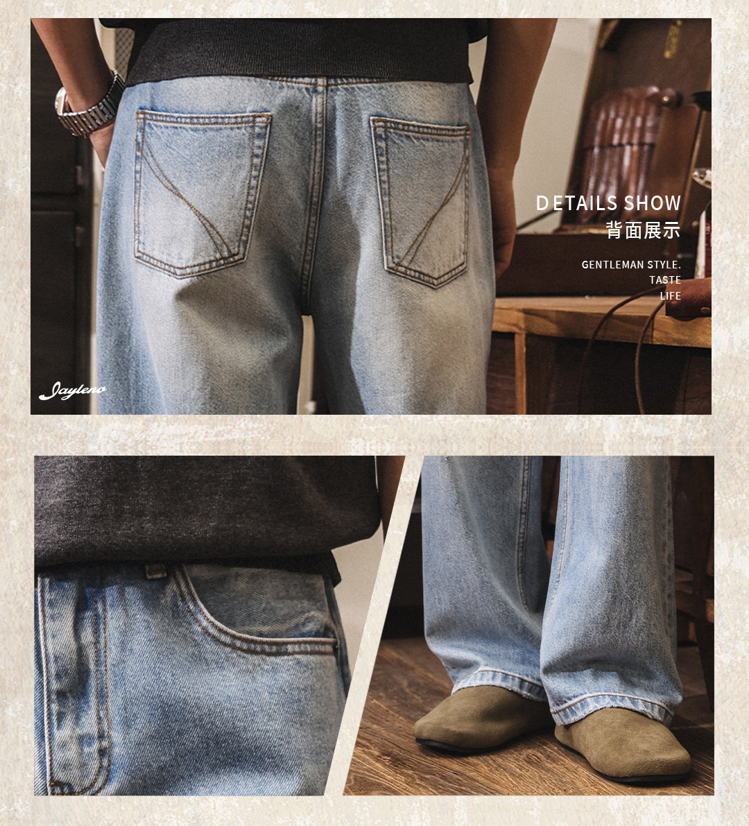 American retro washed and distressed wide-leg jeans for men, new spring 2026 style, trendy loose casual straight leg pants.