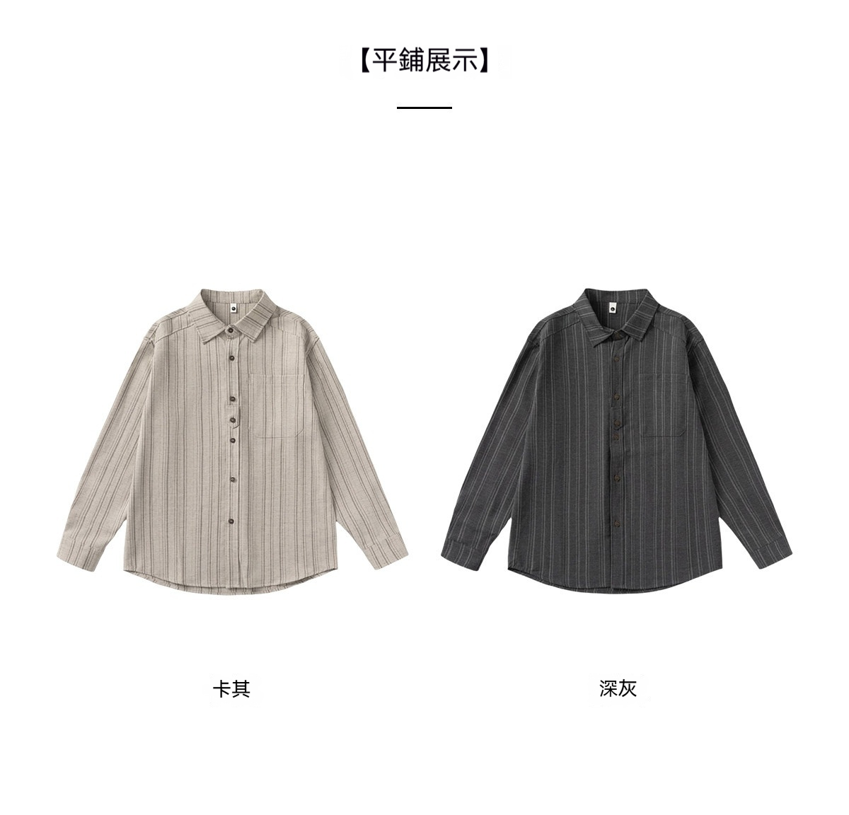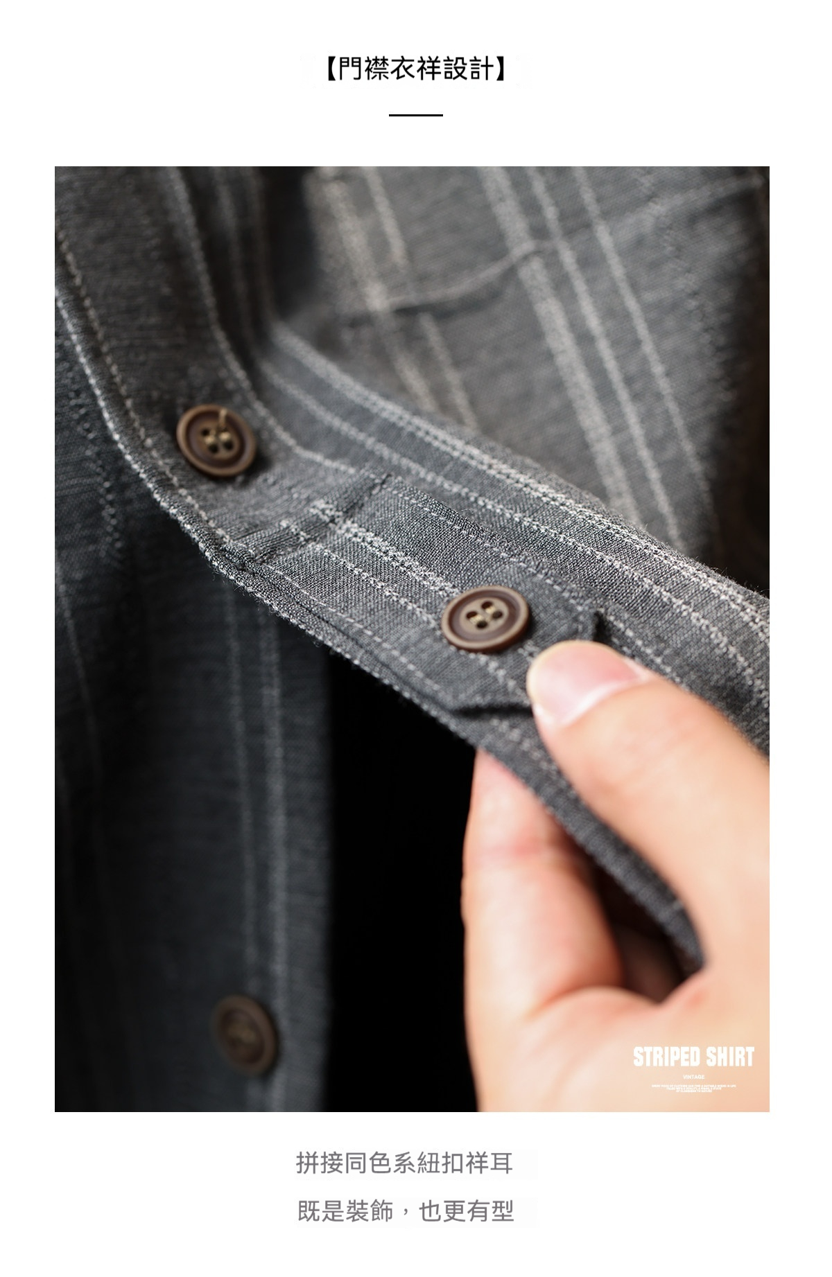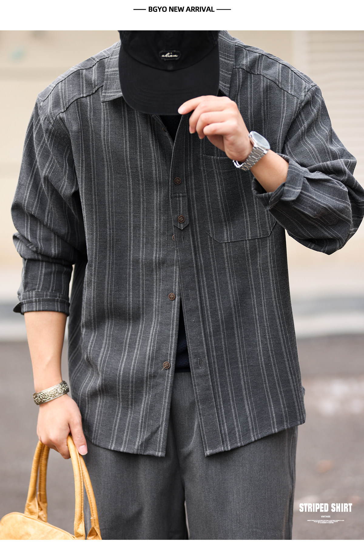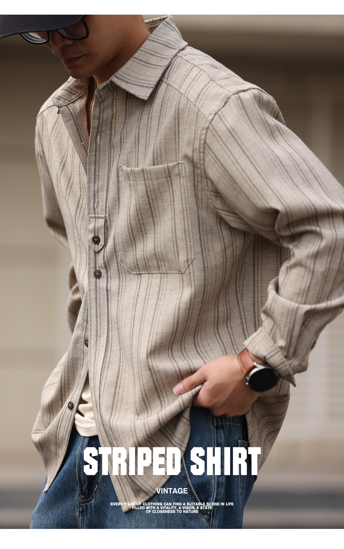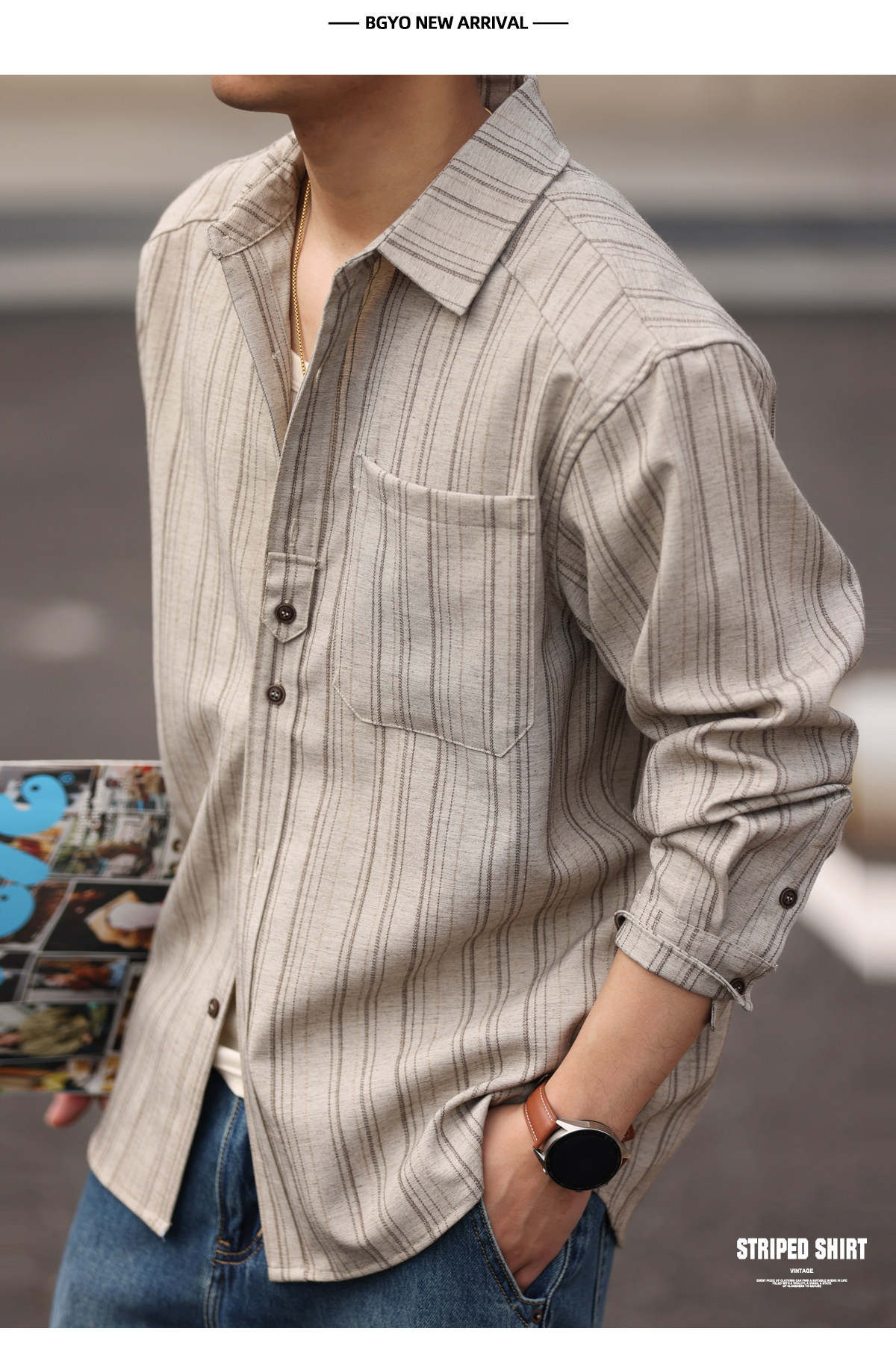 American retro striped workwear long-sleeved shirt for men, crisp and structured, perfect as an outer layer for spring.