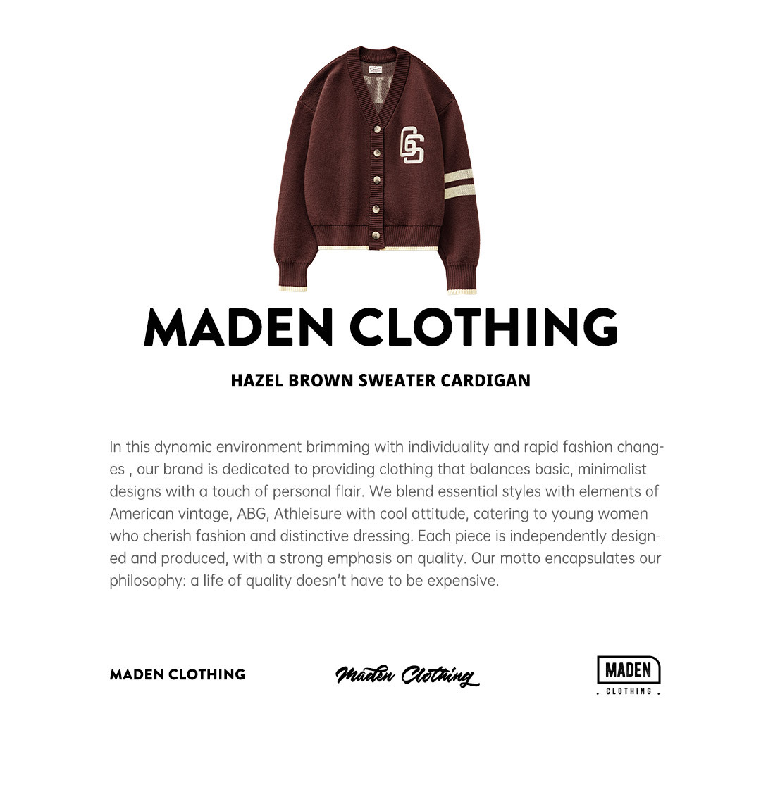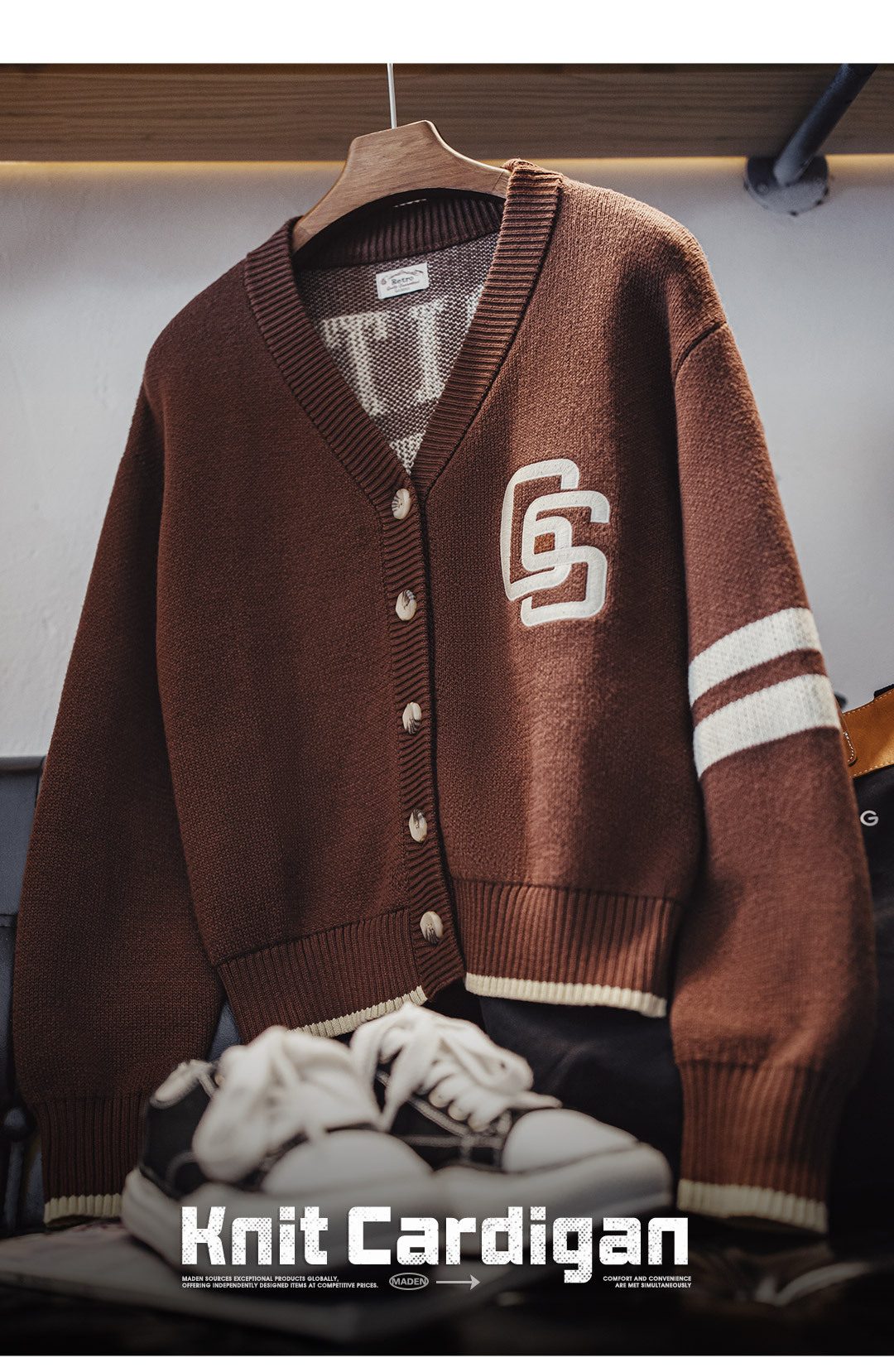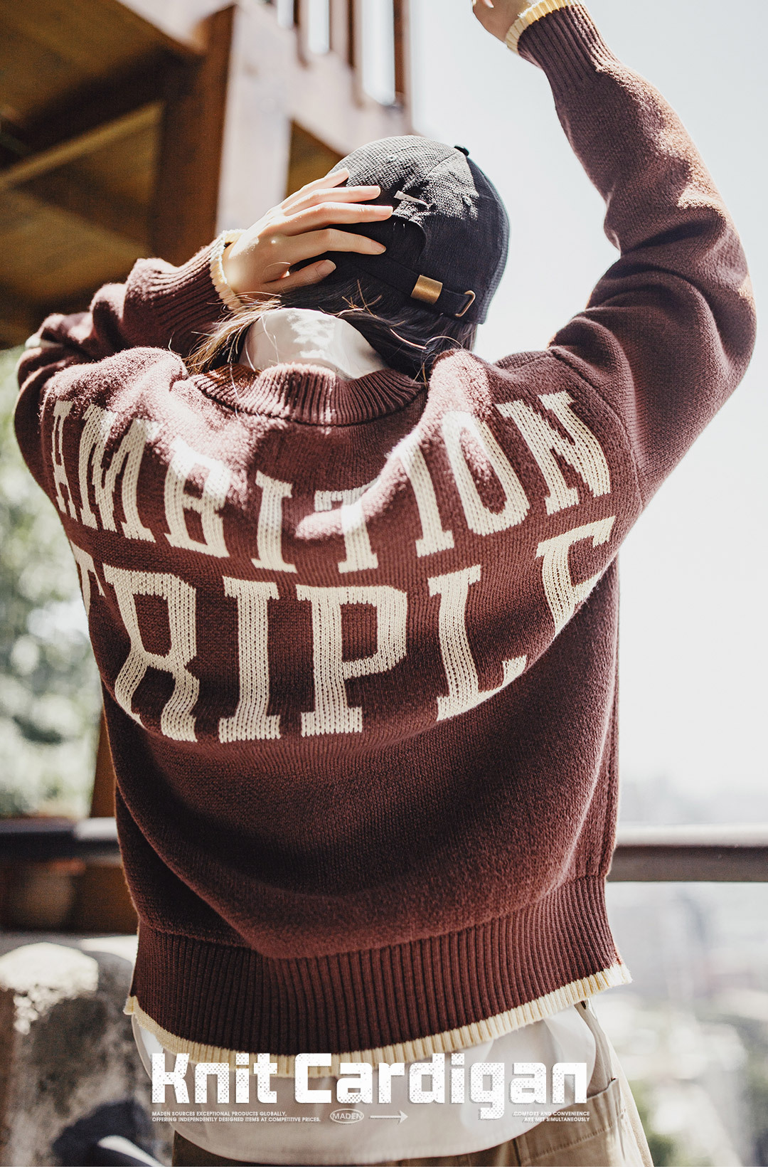 American retro long-sleeved brown V-neck knitted cardigan jacket top loose contrast color sweater ladies autumn and winter