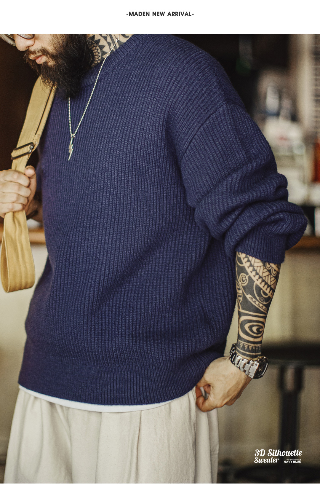 American-style blue ribbed sweater, crew neck, pullover, drape, striped knit cardigan, men's winter style.