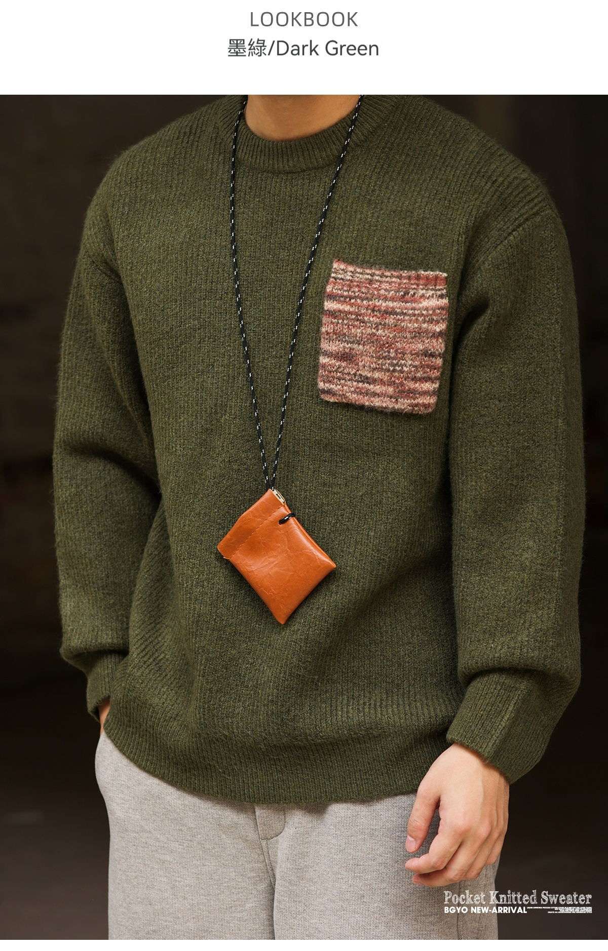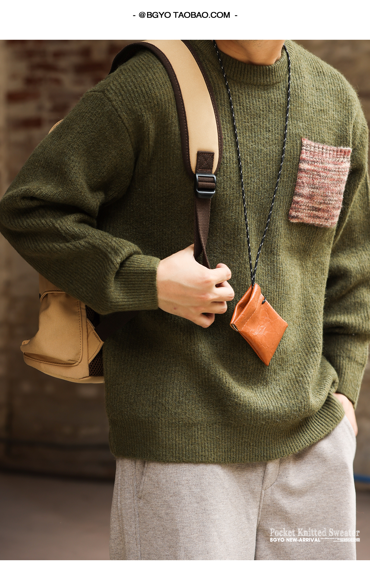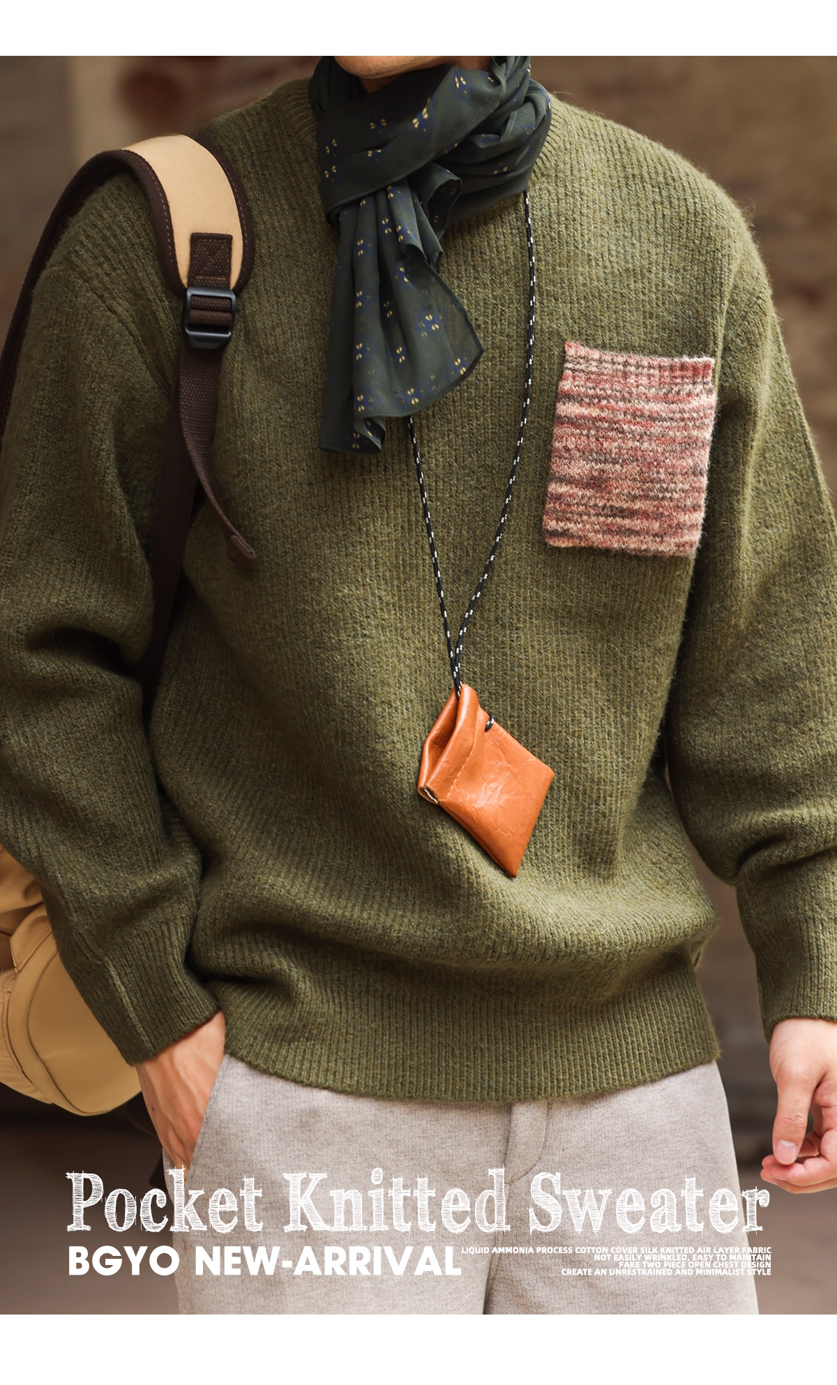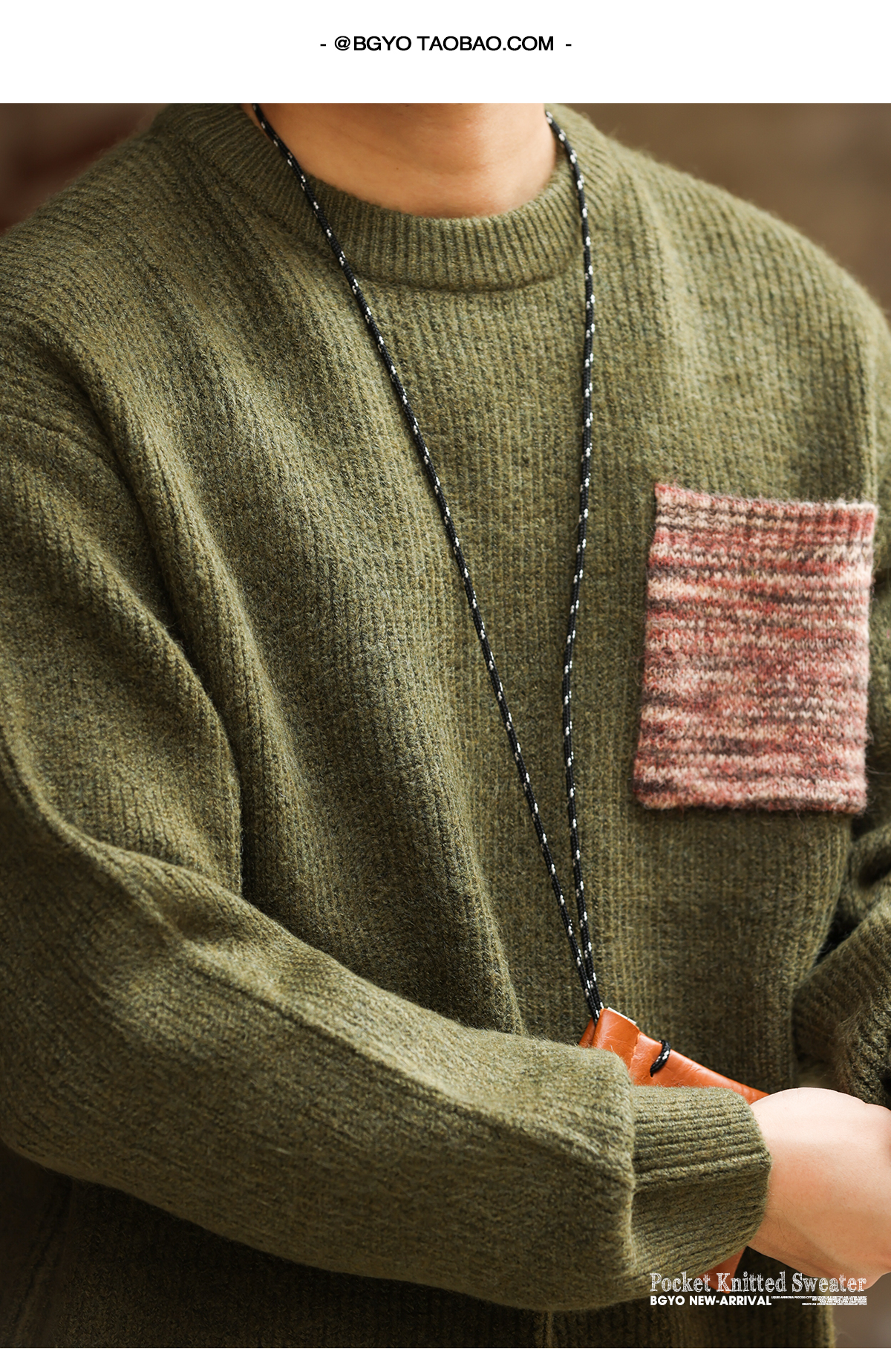 Men's Heavyweight Imitation Cow Wool Crewneck Sweater Knitted Texture Contrast Pocket Lazy Style Sweater Winter