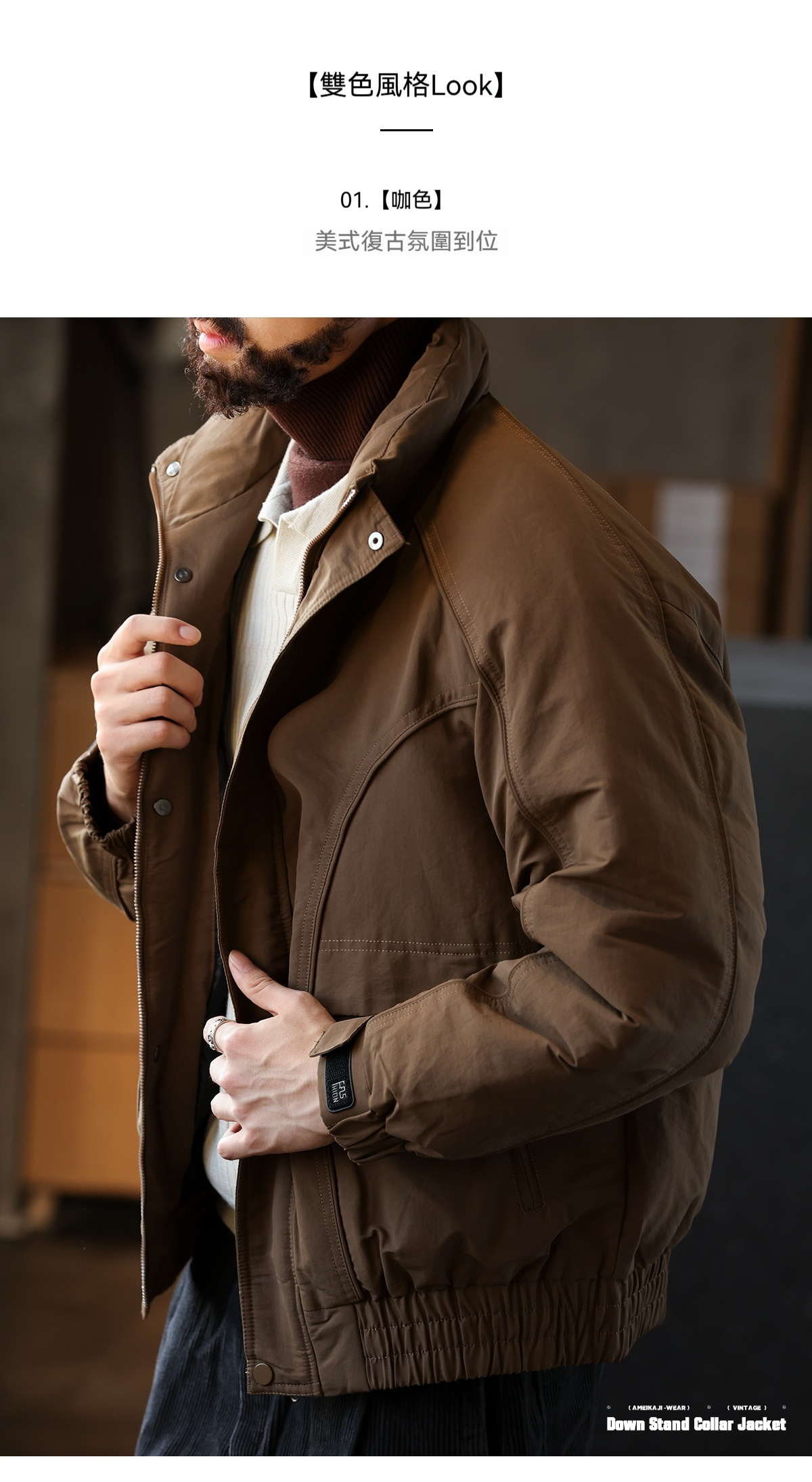 Amejo retro workwear down jacket for men, outdoor short hunting style, warm down coat.