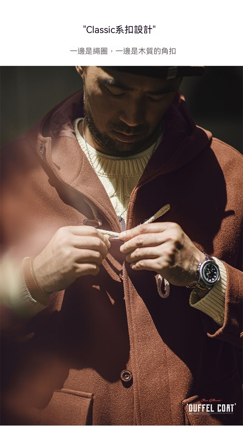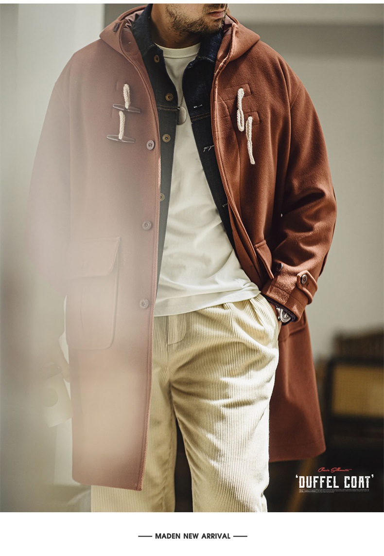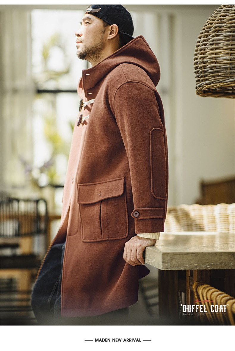 American retro horn button hooded woolen coat college style loose long coat for men and women autumn and winter