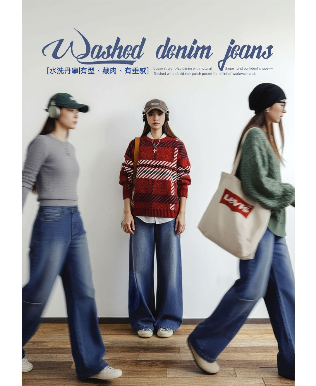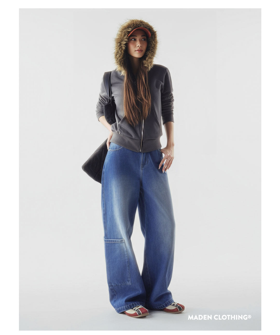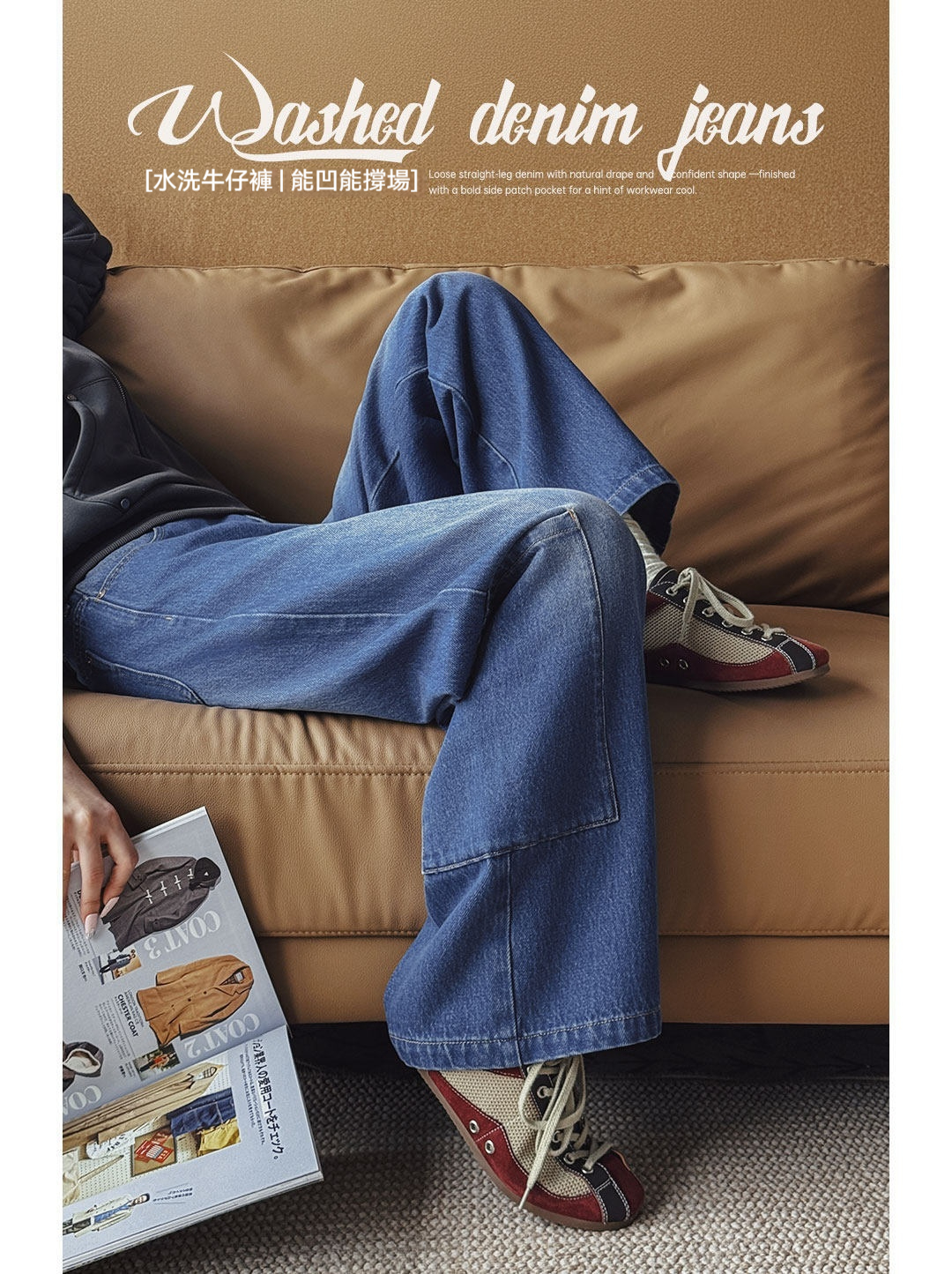 大きなポケットが付いたデニムブルーのストレートレッグ パッチワーク ジーンズ、レディース用オールコットン ワイドレッグ カーゴ パンツ、秋冬用。