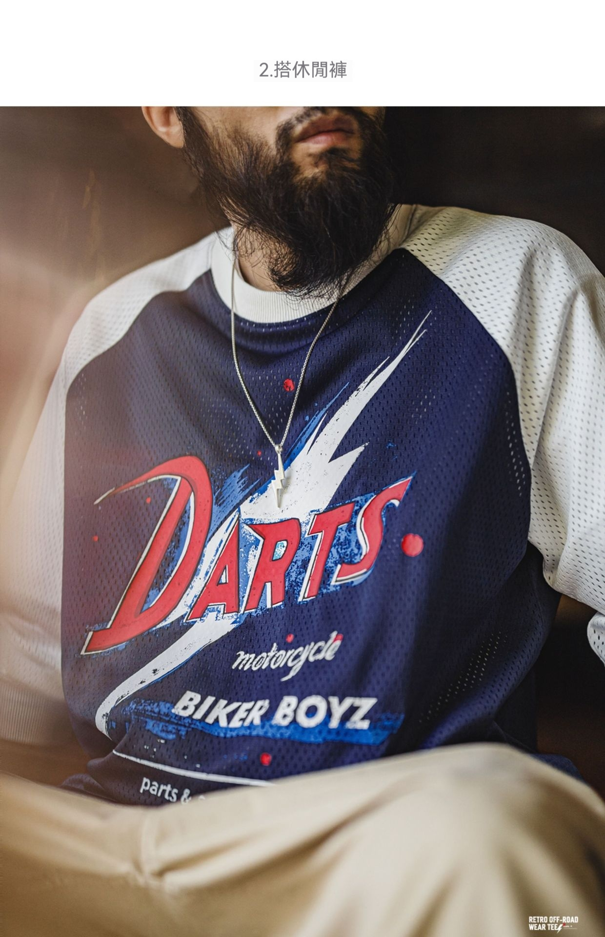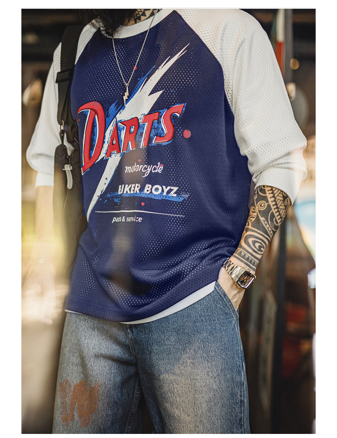 アメリカンスタイルのプリント長袖Tシャツ中空コントラストカラーニットラグランスリーブドレーププルオーバースウェットシャツメンズ夏秋