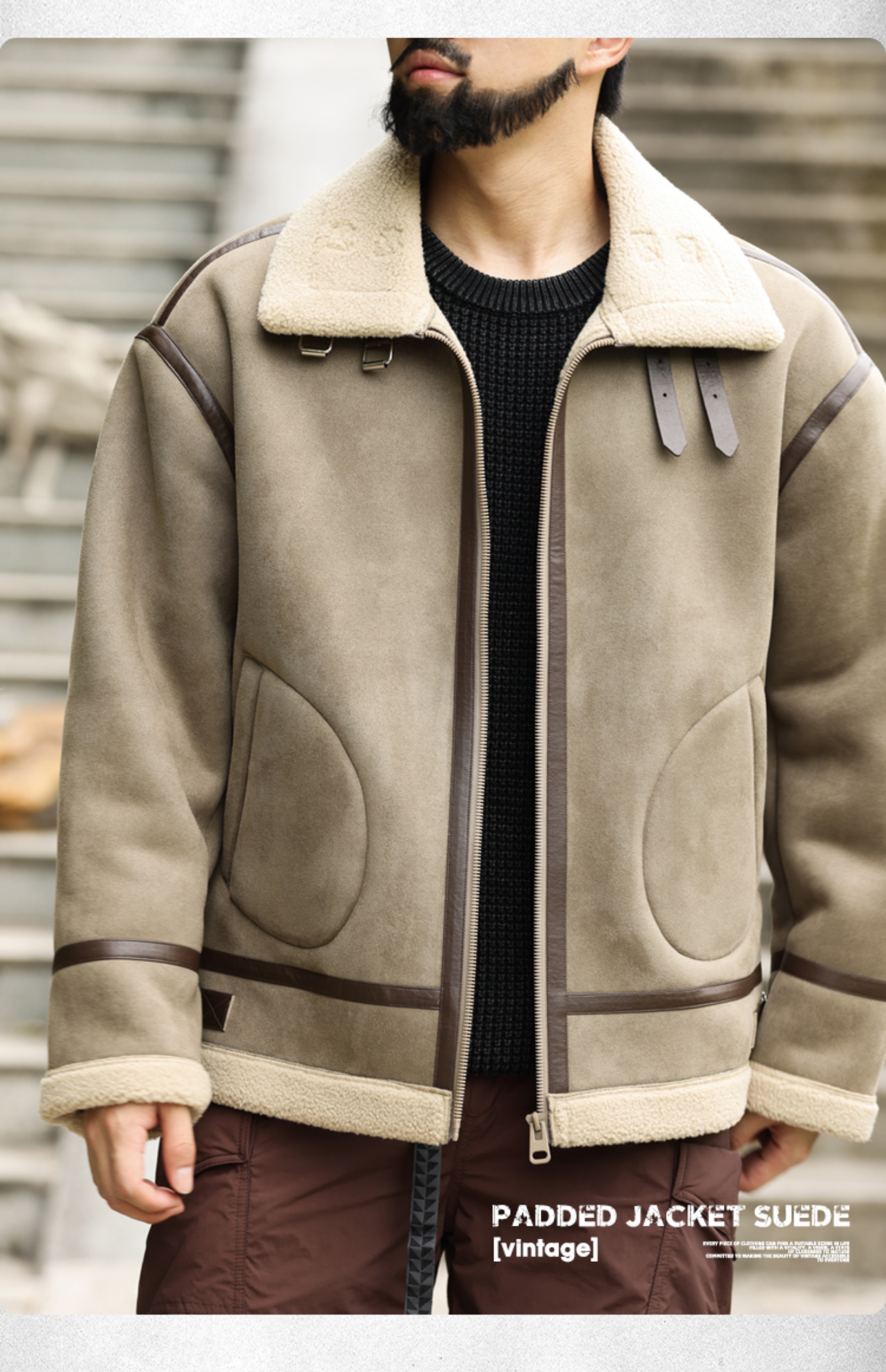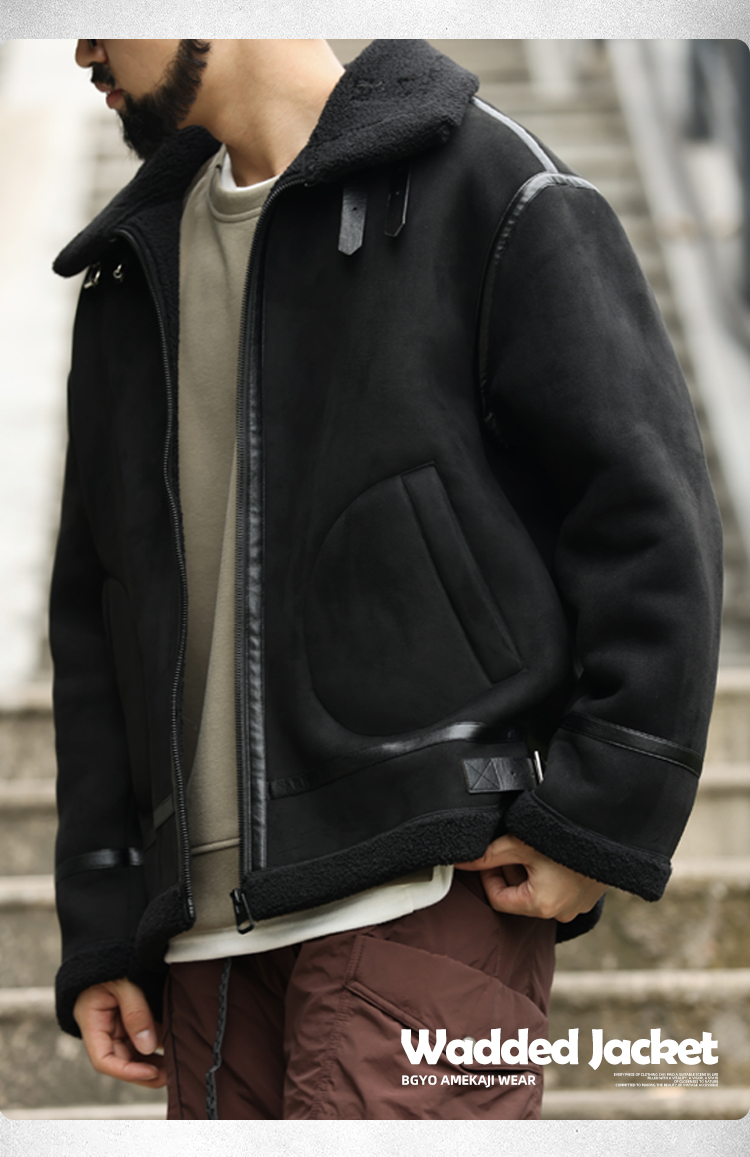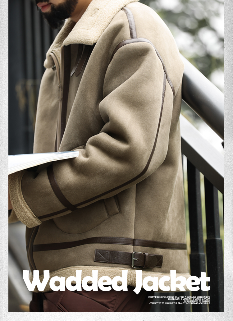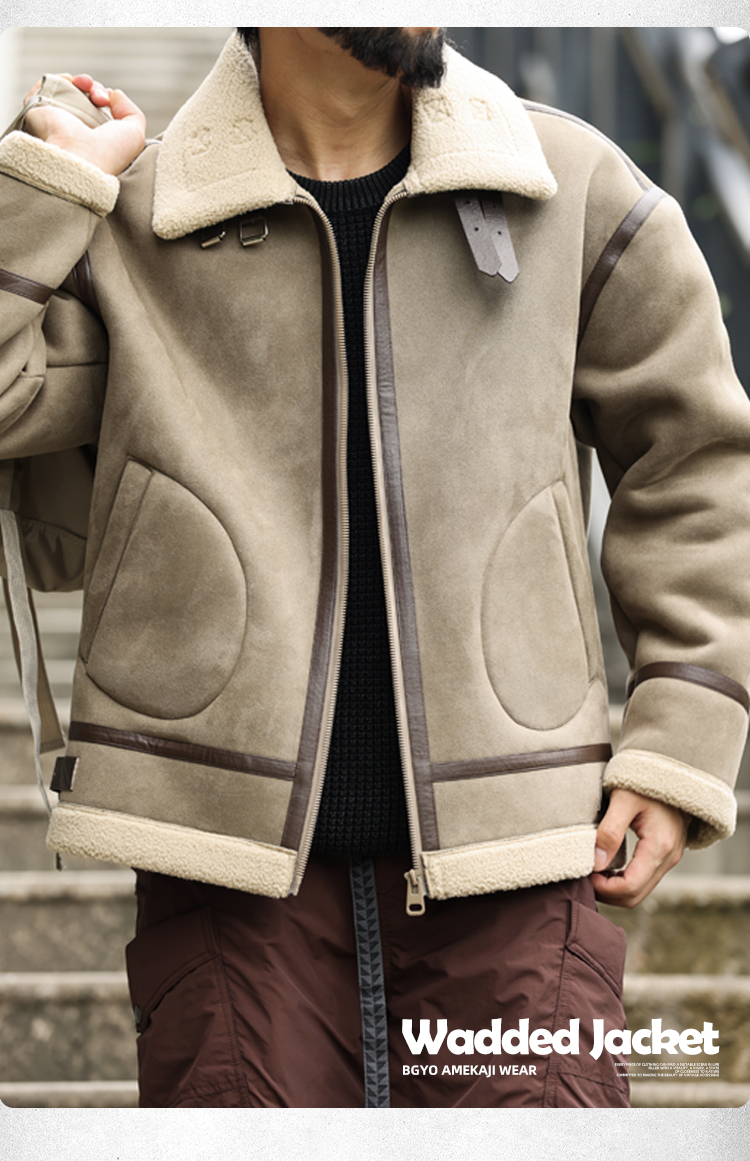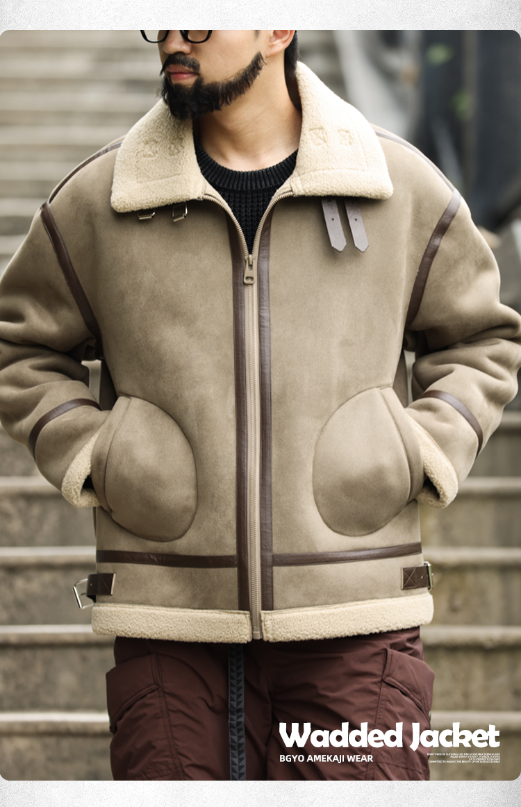 アメリカンレトロパッチワークスエードコットンコートメンズ厚手暖かいラムスキンモーターサイクルジャケット