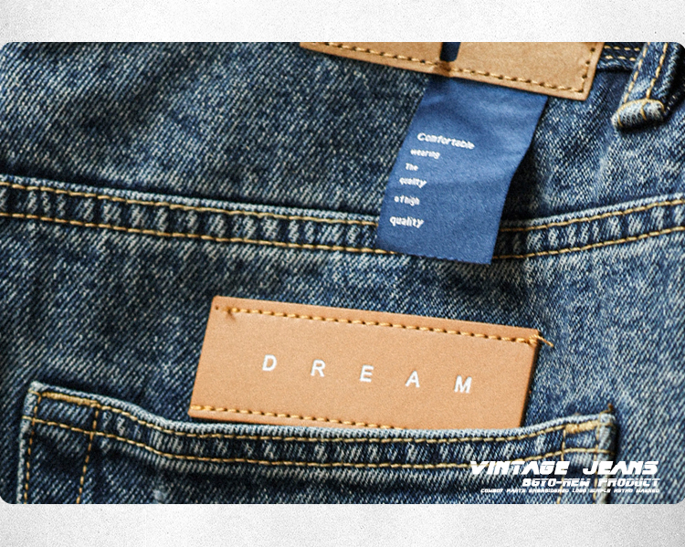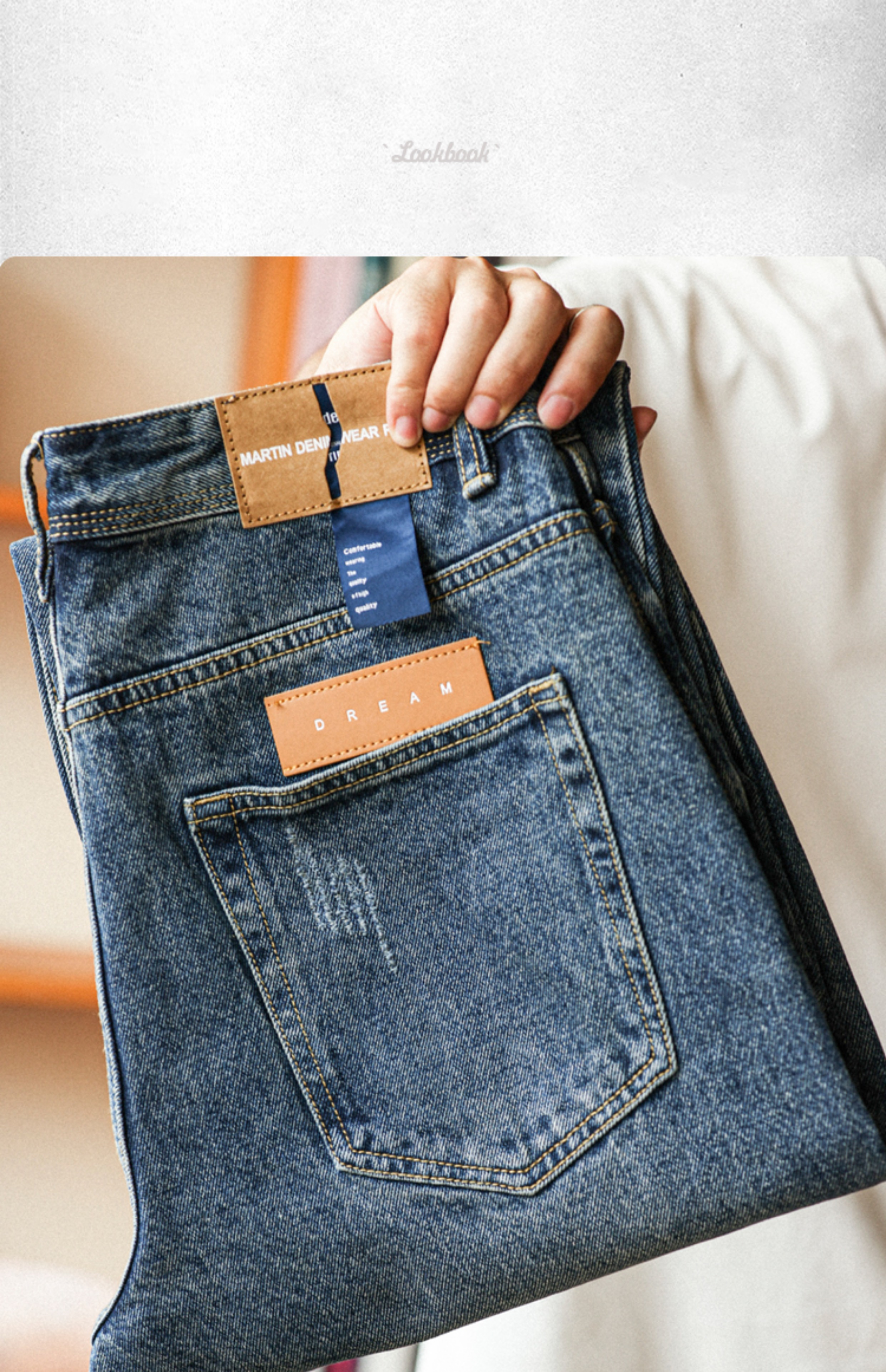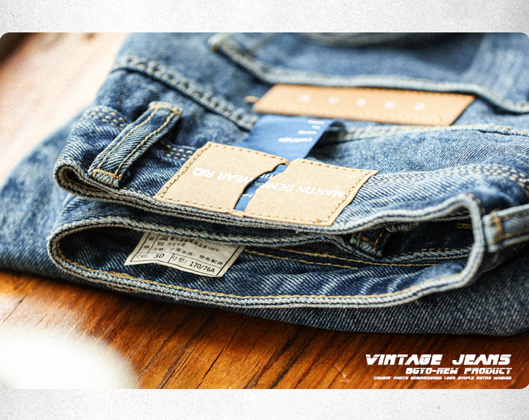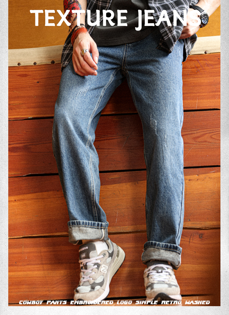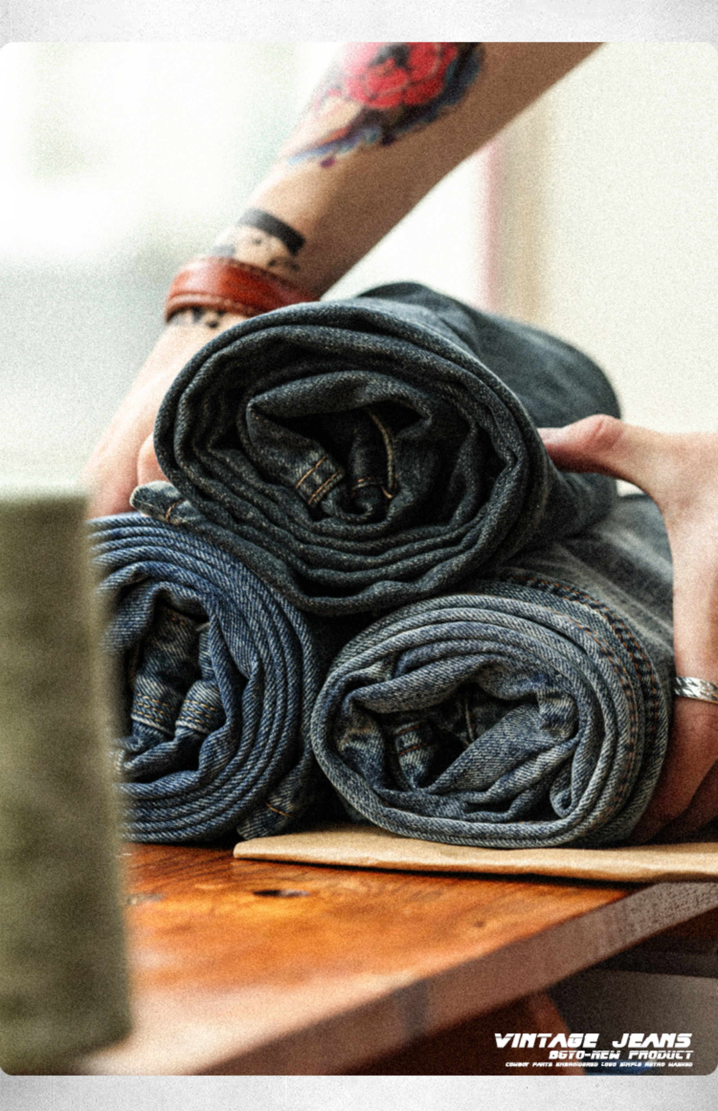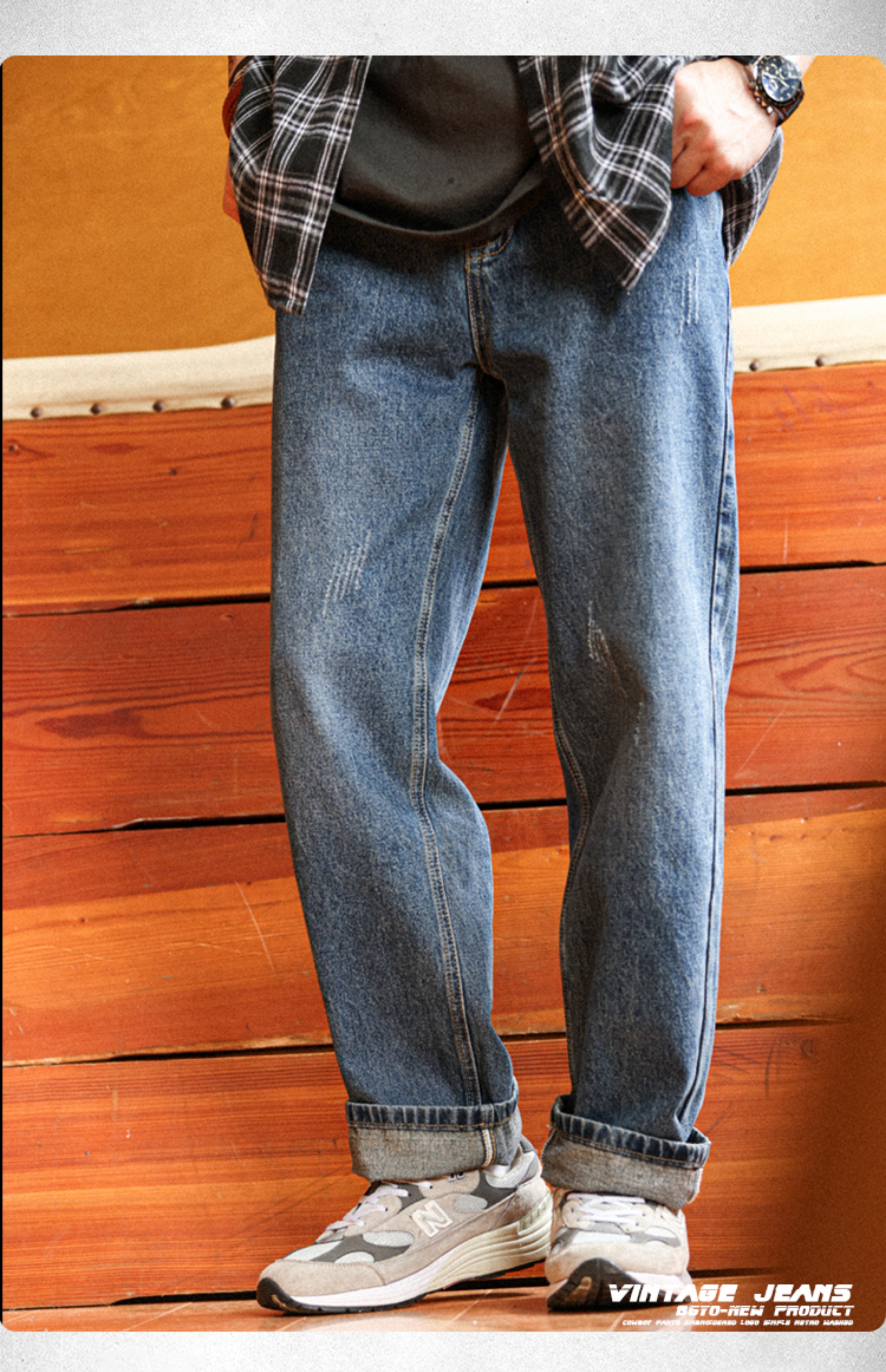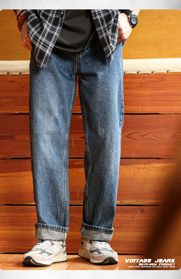 アメリカンレトロ 12.8オンス ウォッシュドブルージーンズ メンズ 猫のひげ 着用済み ゆったり ストレート カジュアル トラウザーズ
