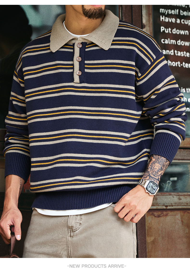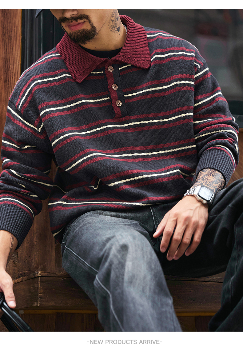 アメリカンレトロPOLOカラーストライプセーター、メンズ、2025年冬新作、ゆったりとした怠惰なスタイル、カラーブロックニットトップス