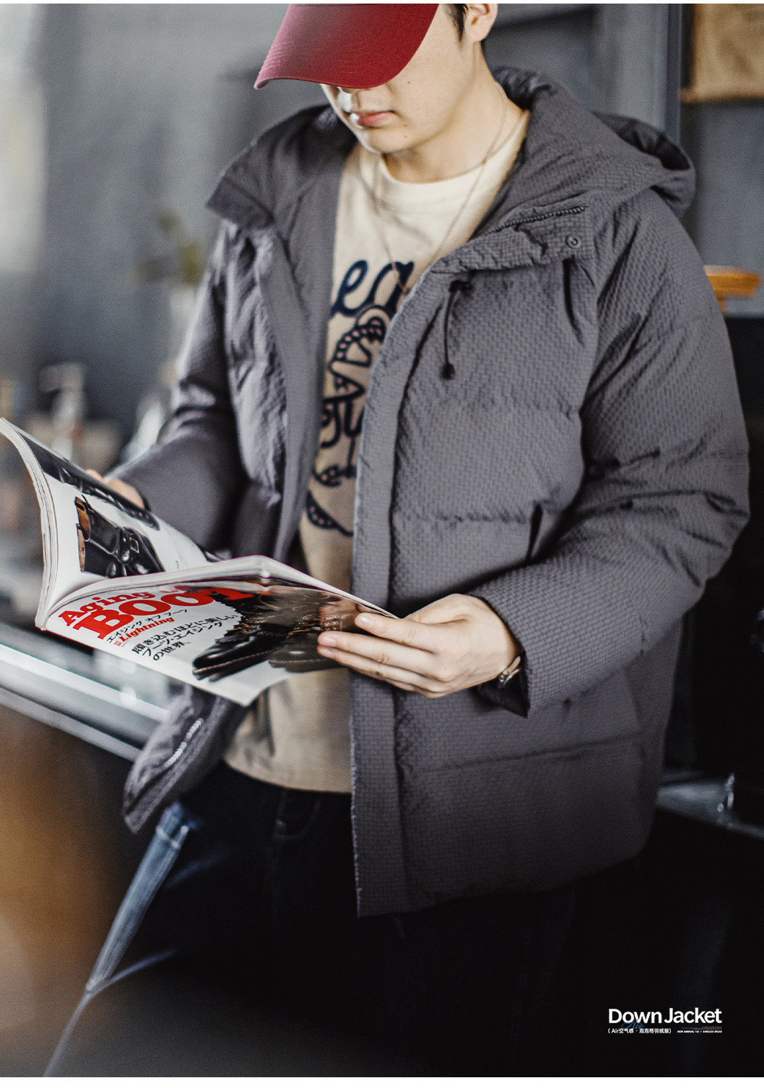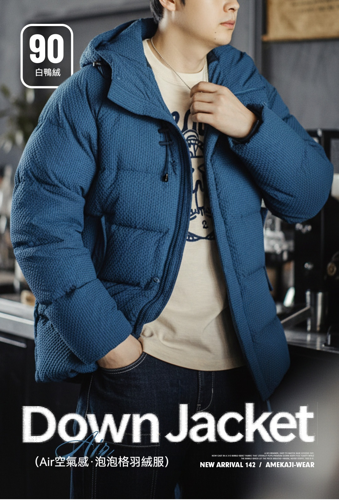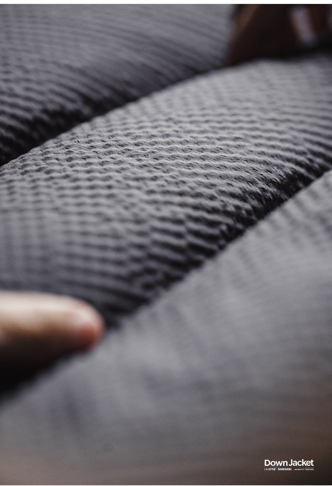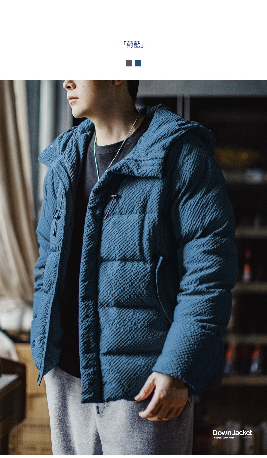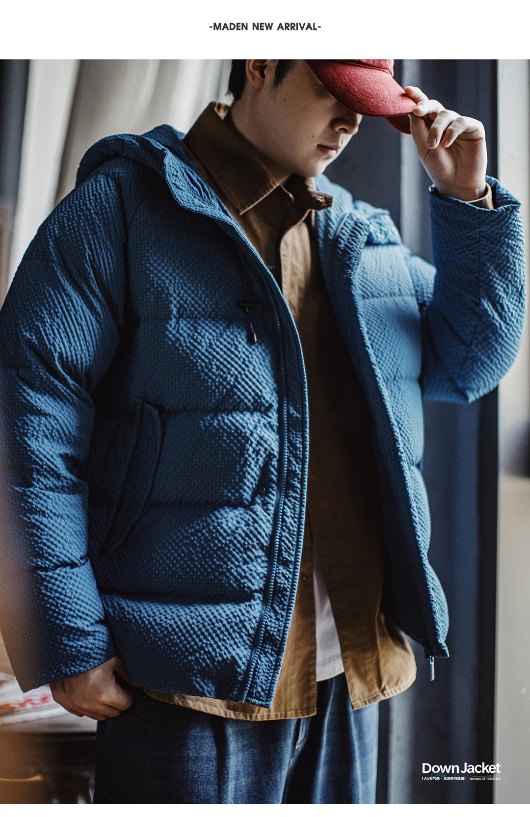 アメリカンスタイルのシアサッカーダウンジャケット、ホワイトダックダウン 90%、ハイロフト、テクスチャードフード付きコート、メンズ、秋冬用。
