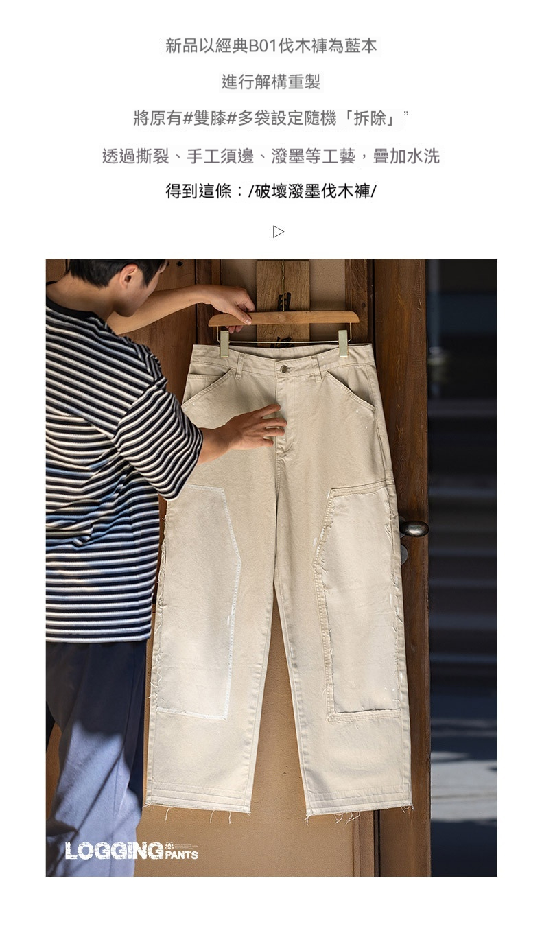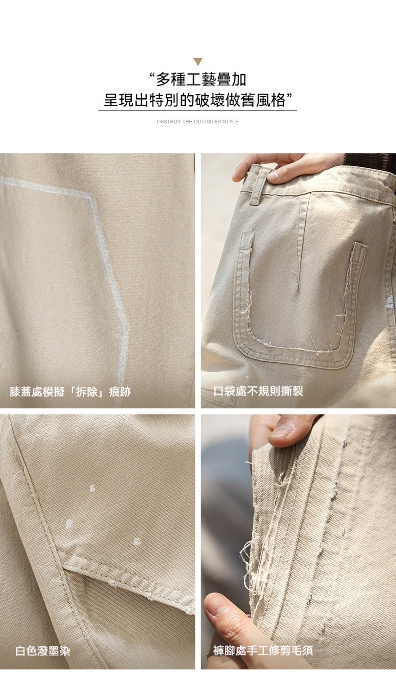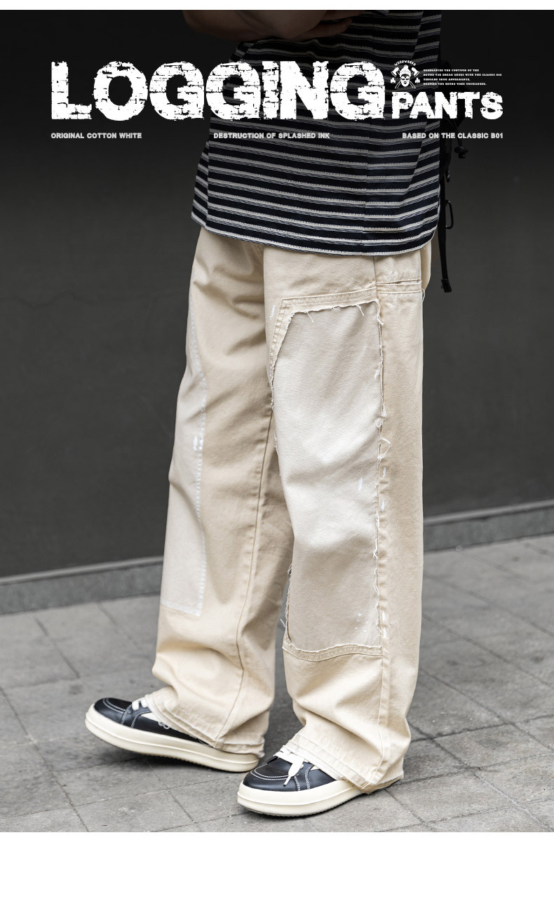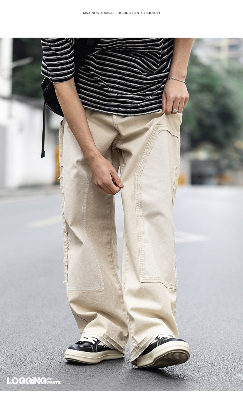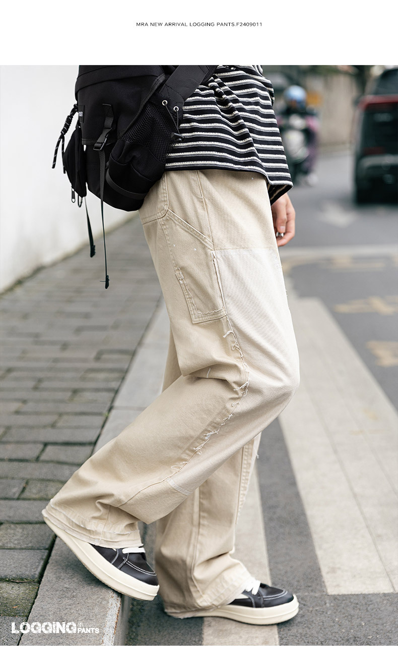 MRA 破壊インク ルーズベージュ ジーンズ レトロ カジュアル ストレート マルチポケット ランバージャックパンツ メンズ 夏