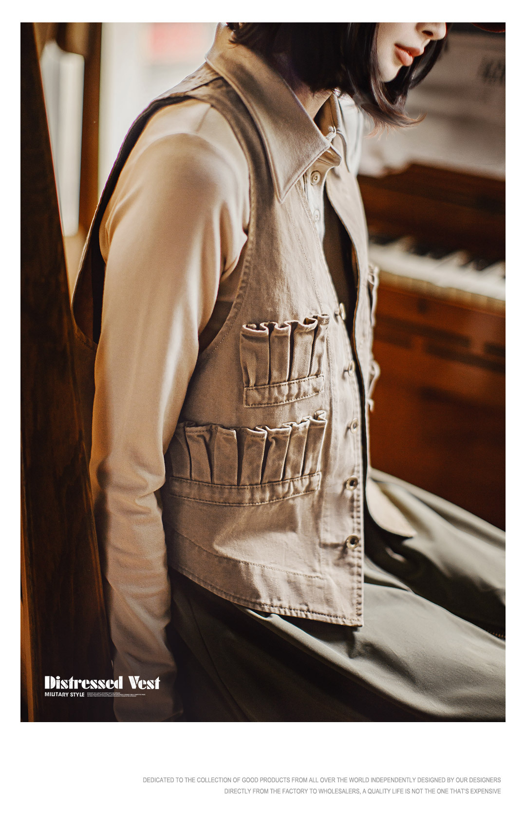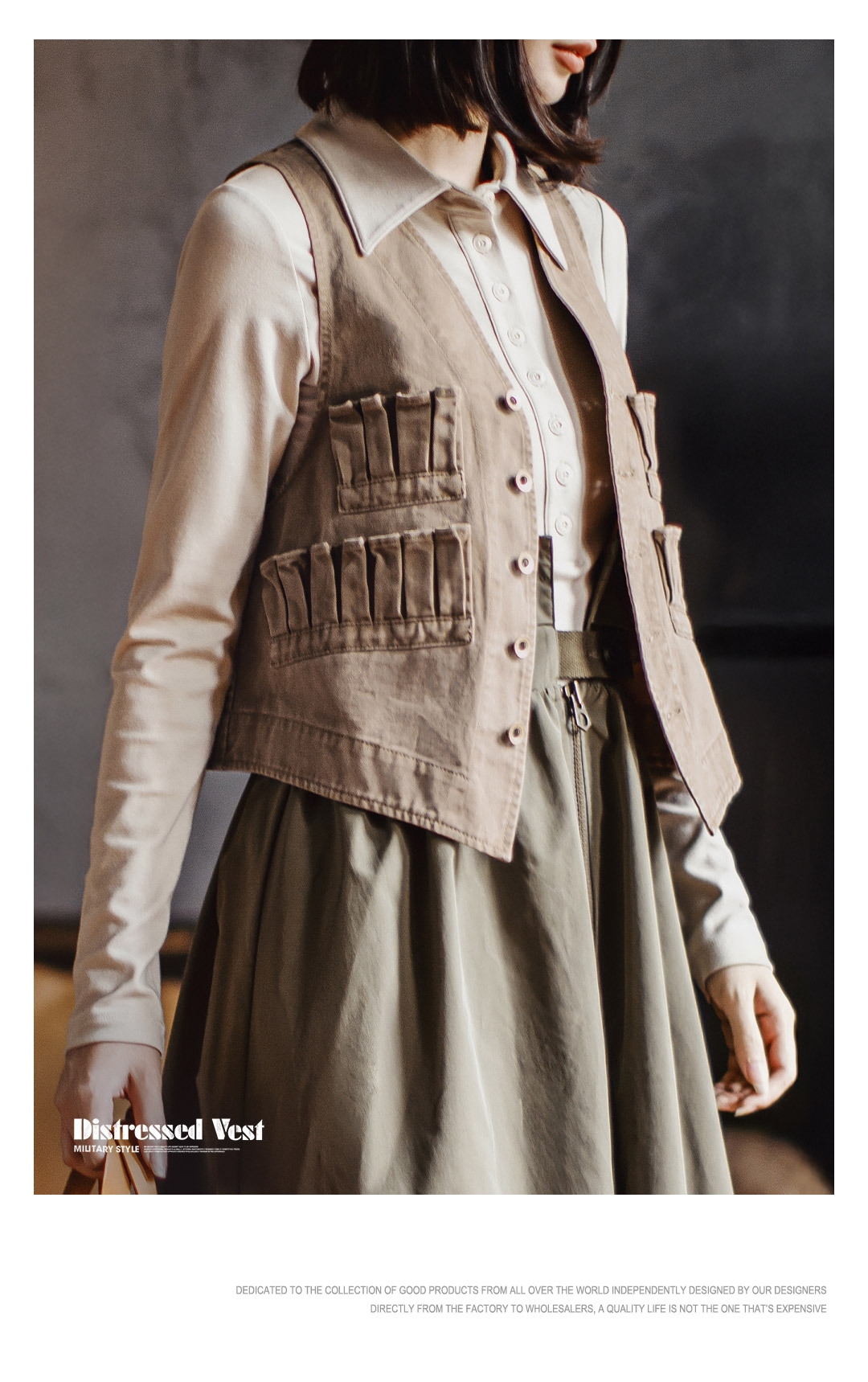 復古多口袋V領無袖工裝外搭套疊穿馬甲夾坎肩心上衣女士秋季