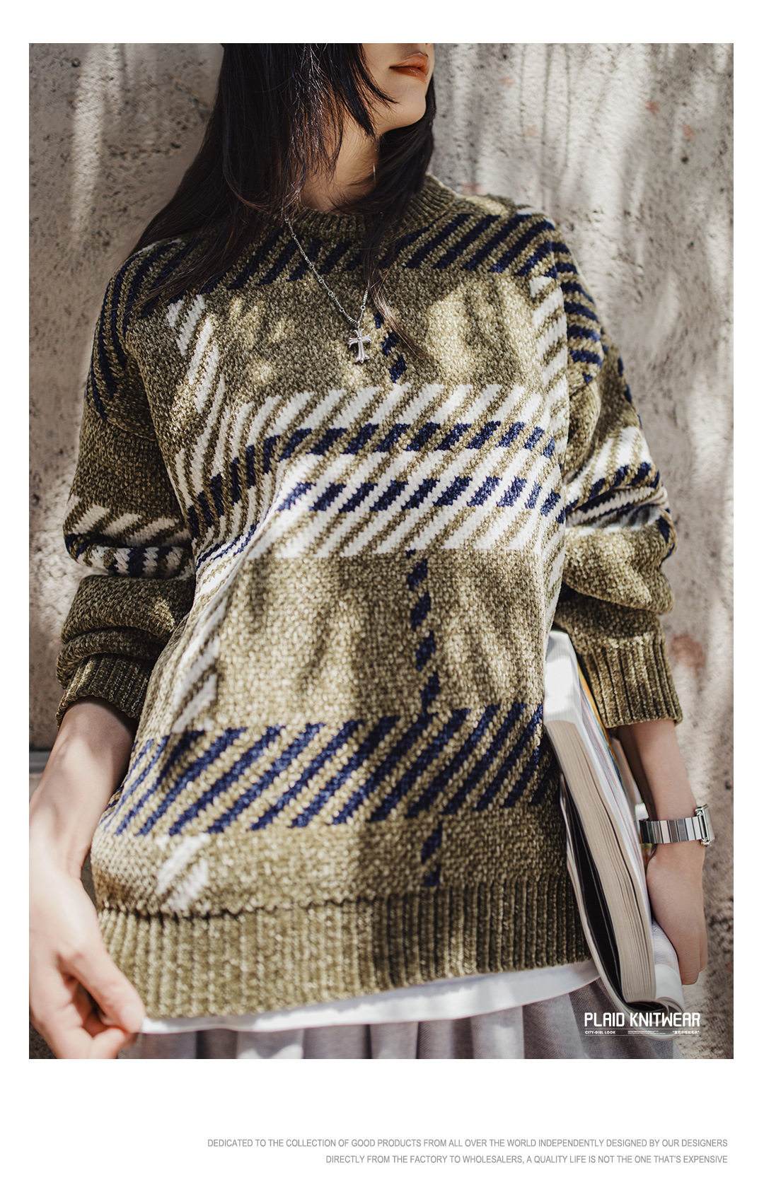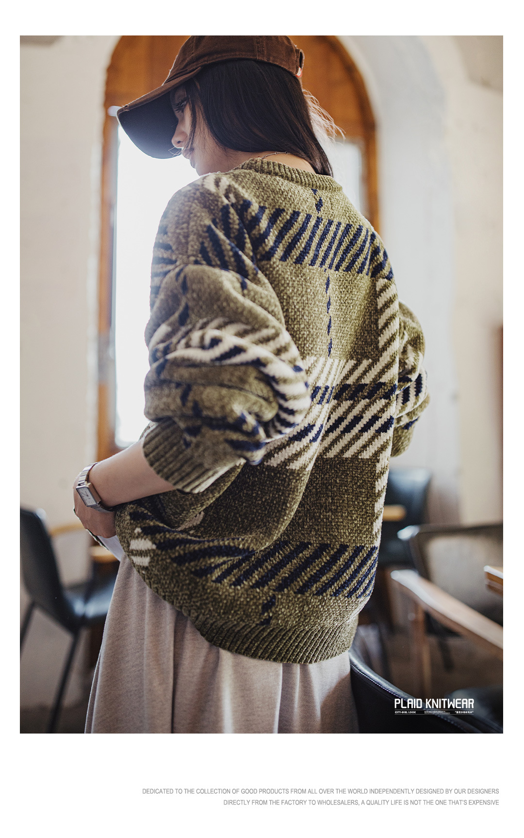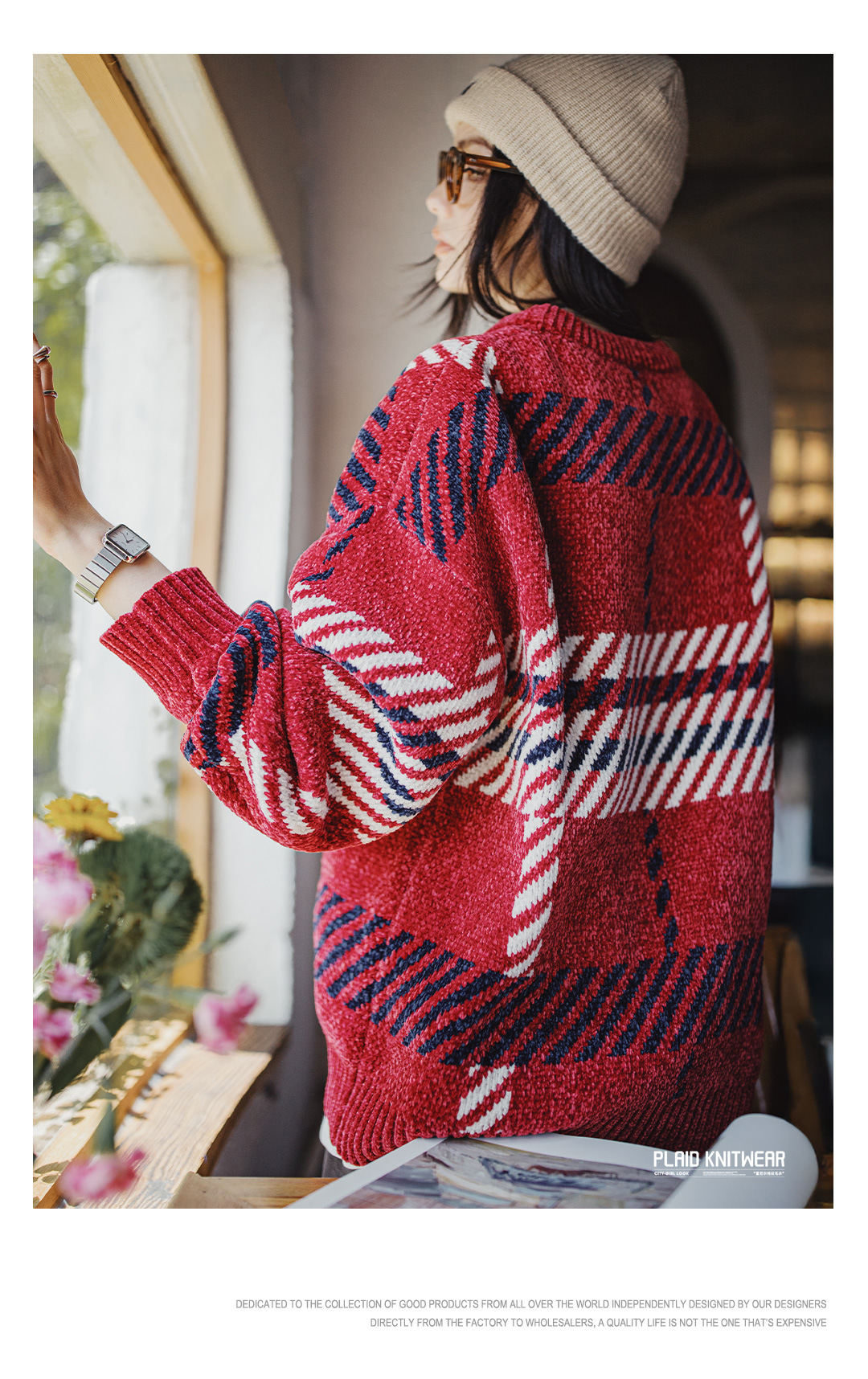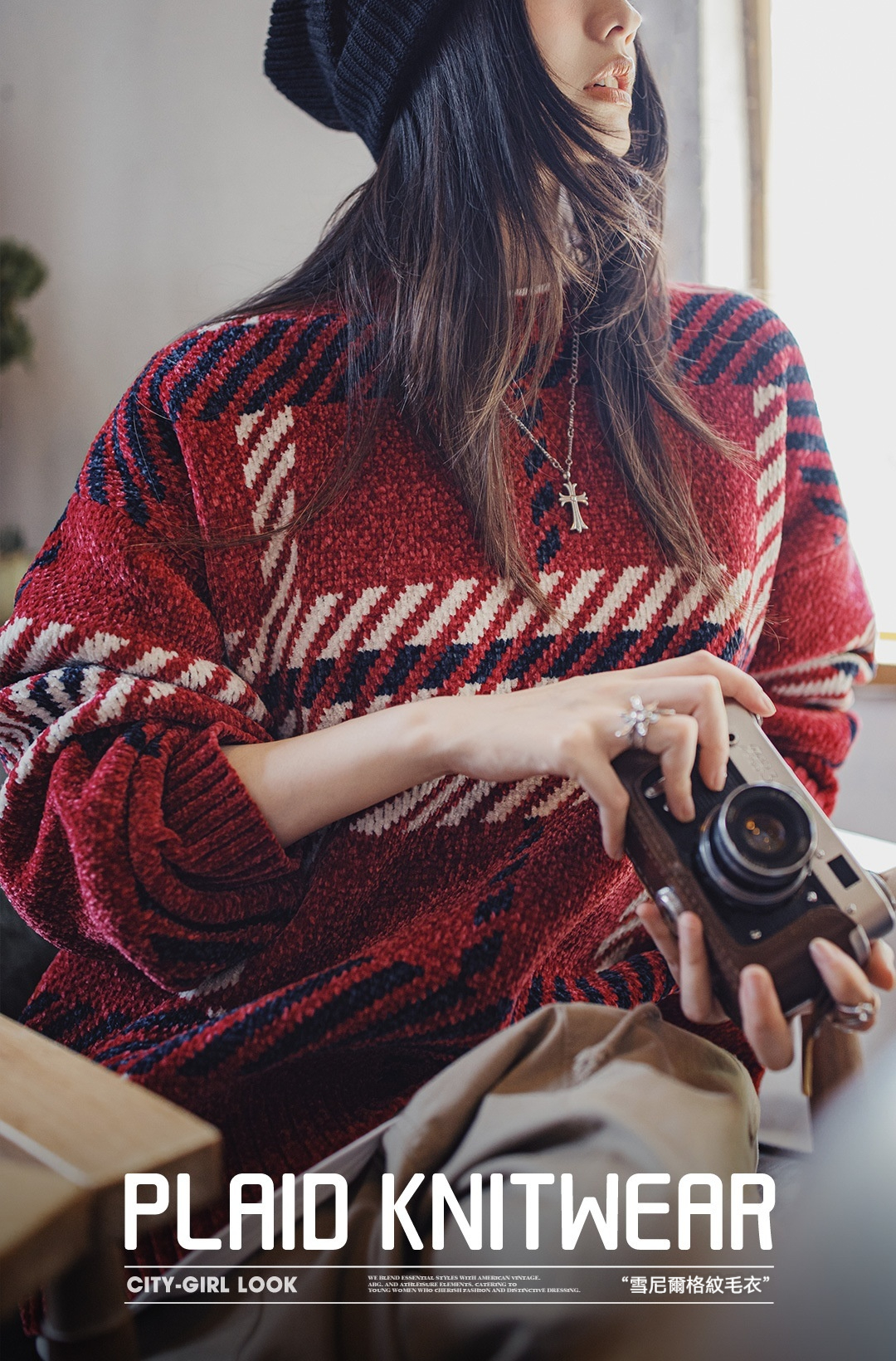 復古雪尼爾格紋寬鬆聖誕套頭保暖加厚實毛衣軟糯針織衫女秋冬