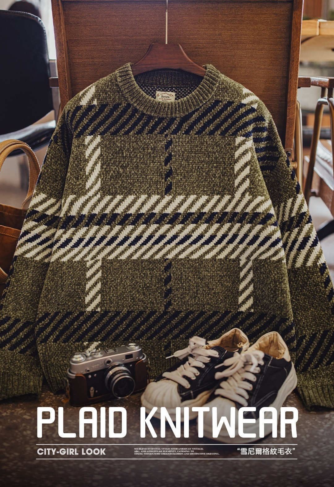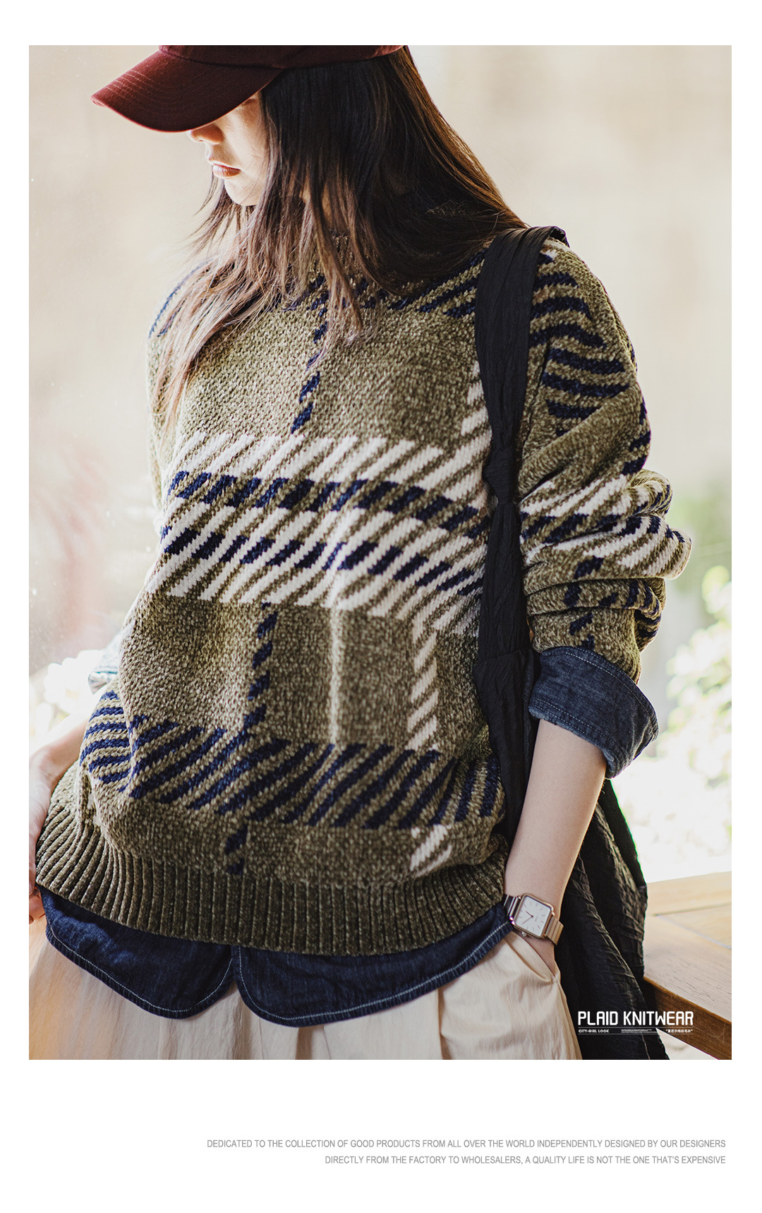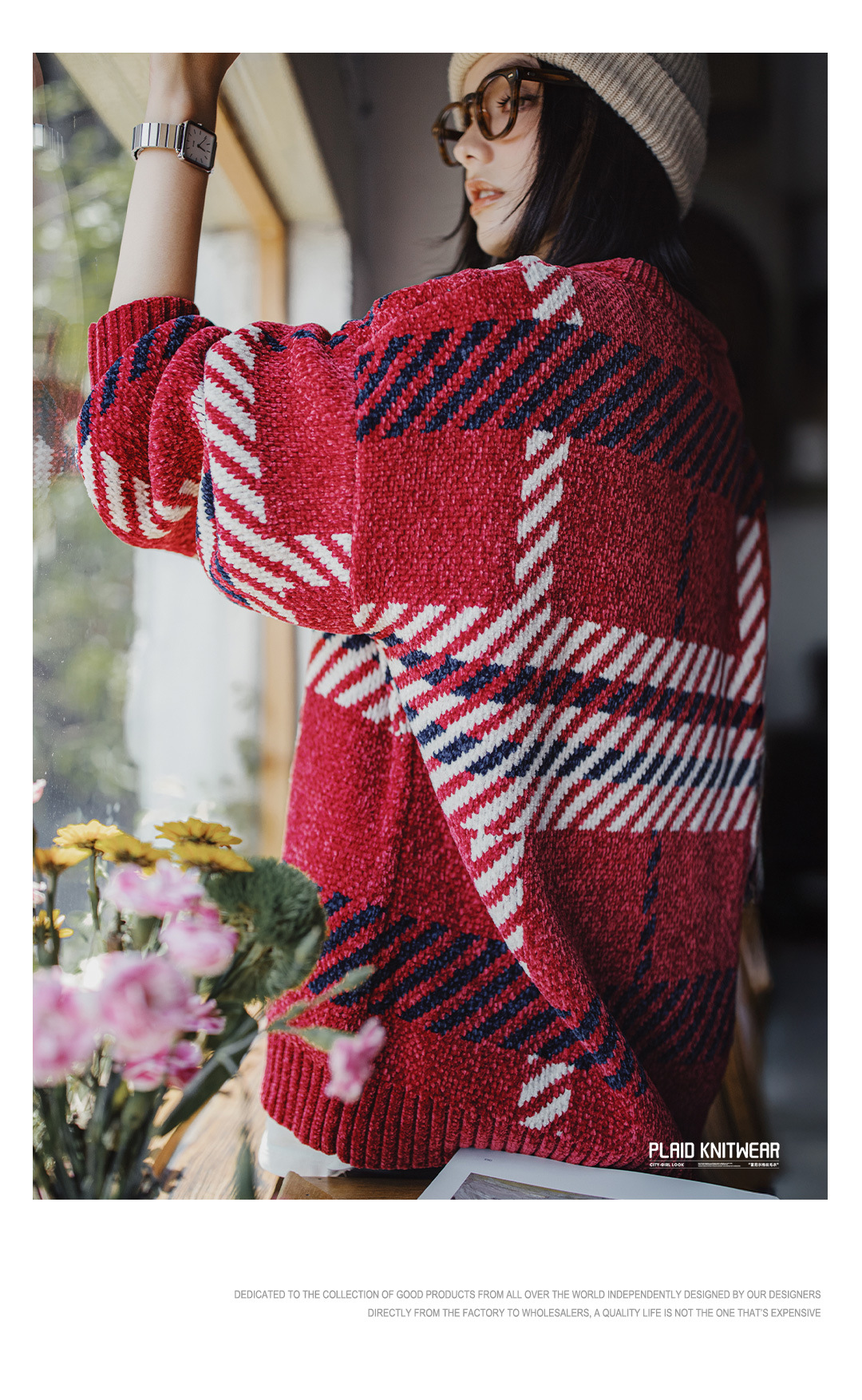 復古雪尼爾格紋寬鬆聖誕套頭保暖加厚實毛衣軟糯針織衫女秋冬