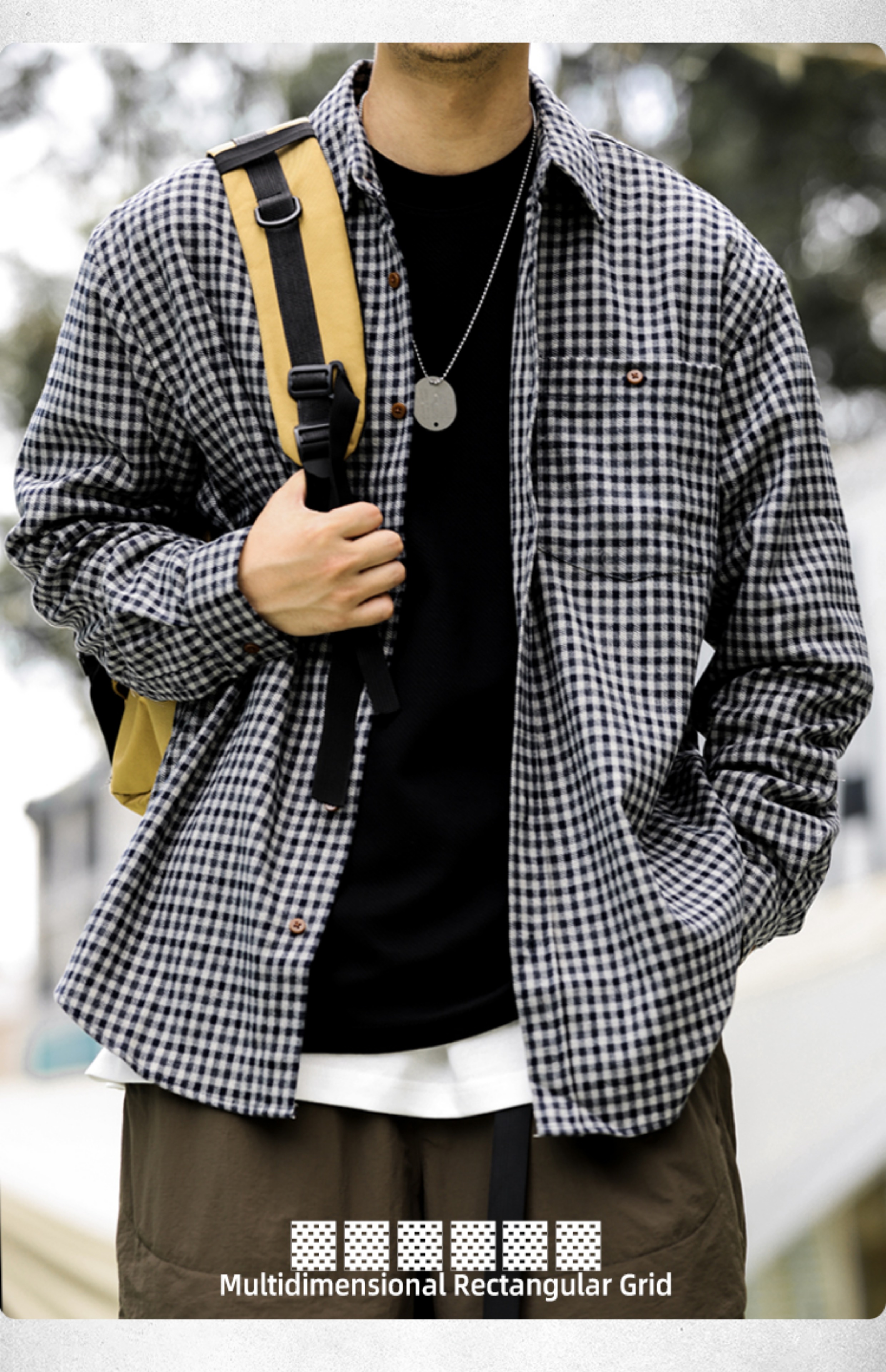 法式復古磨毛小格子長袖襯衫男寬鬆休閒口袋高級感襯衣外套
