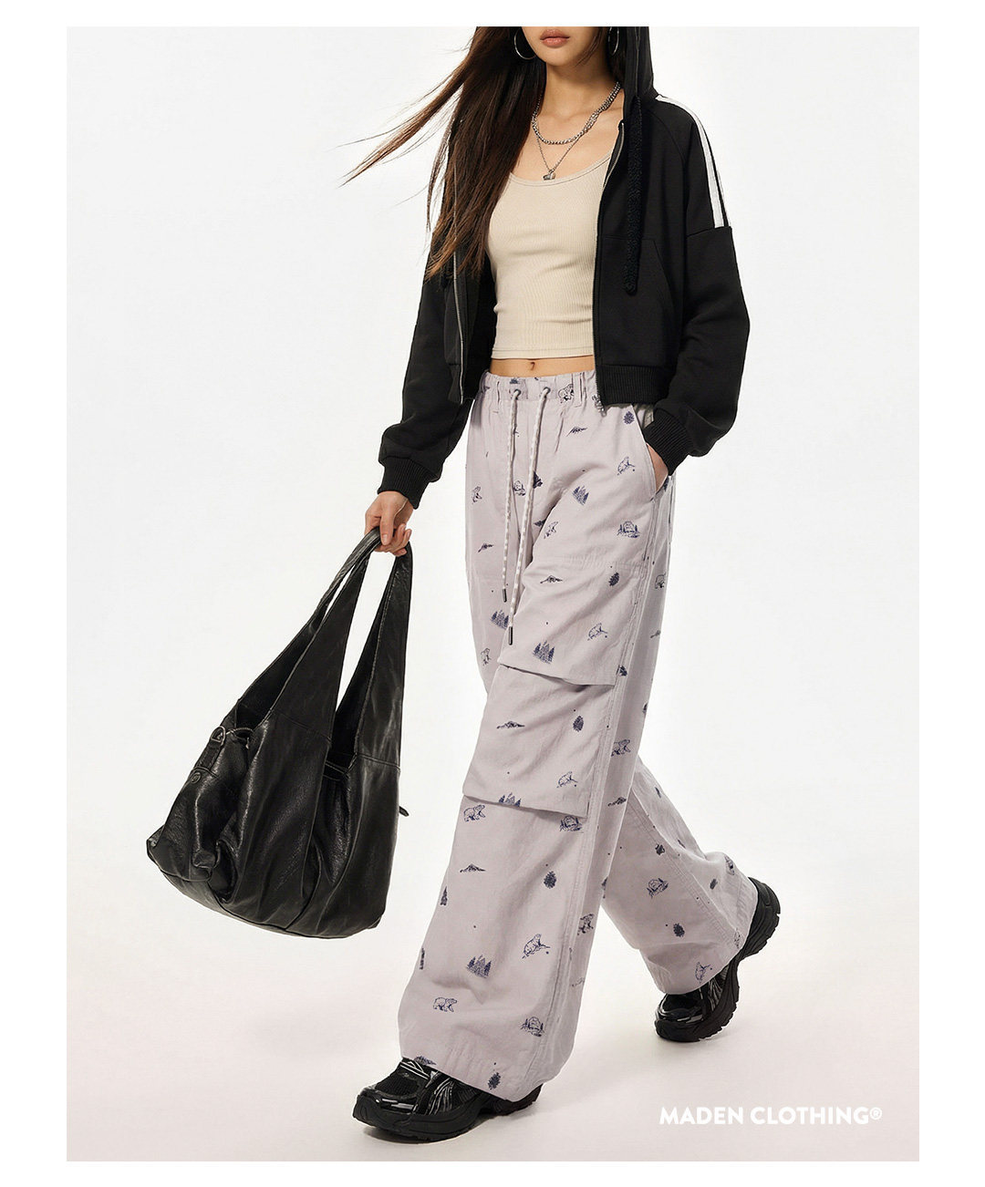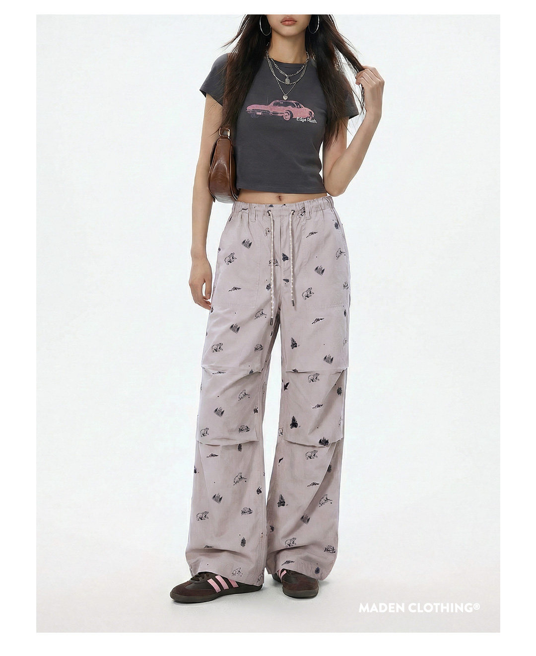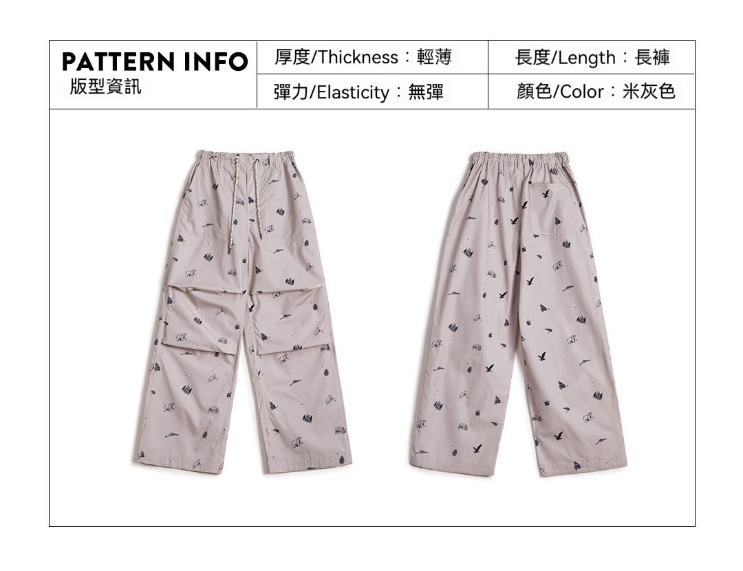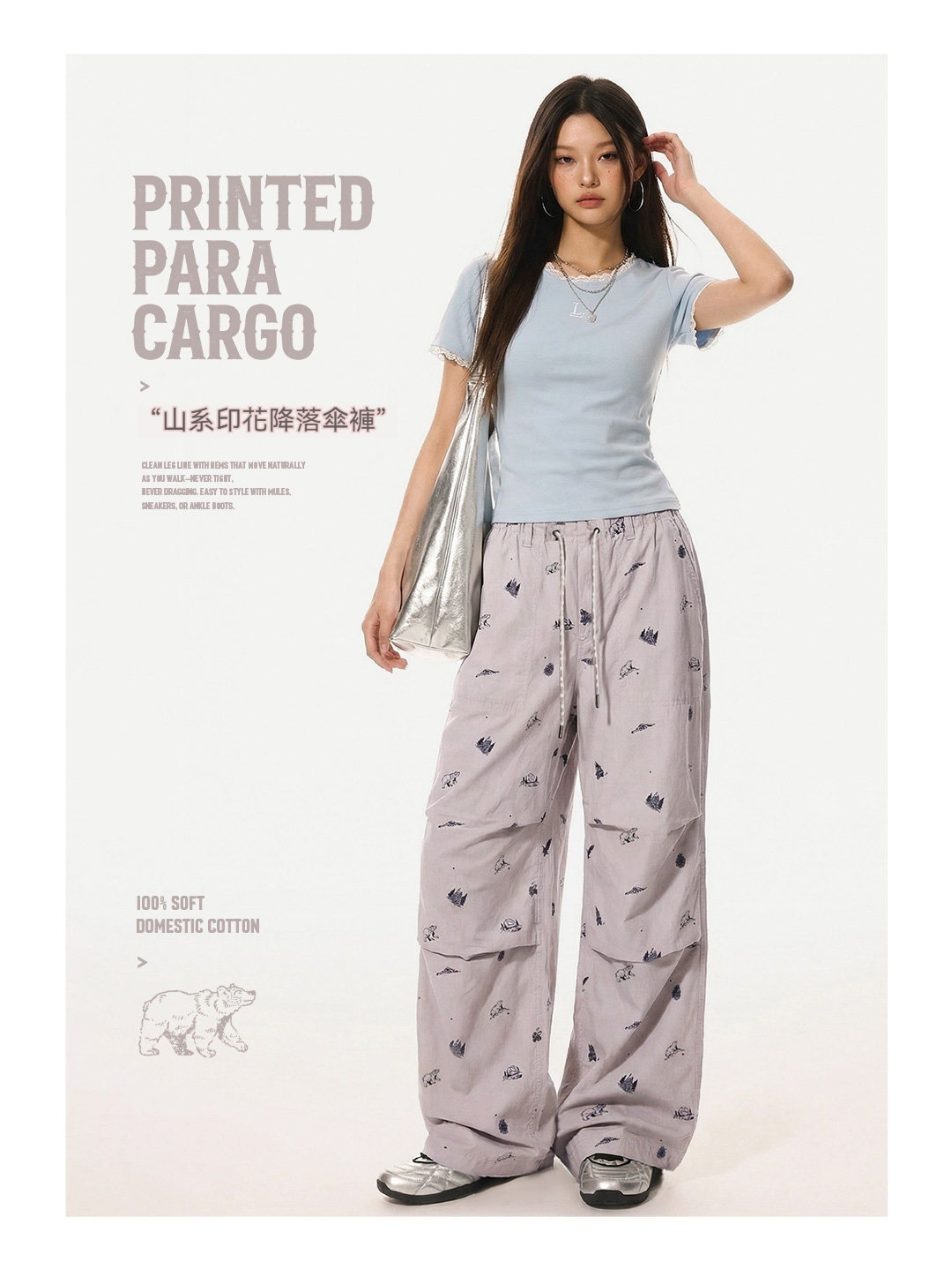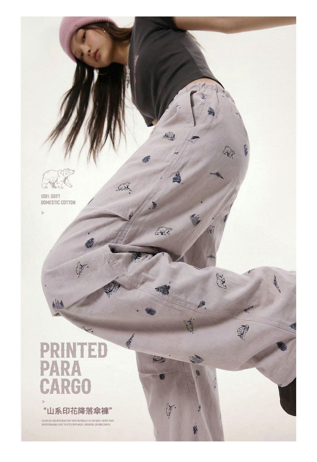 純棉薄款直筒闊腿山系傘兵褲鬆緊腰印花休閒工裝長褲子女士春