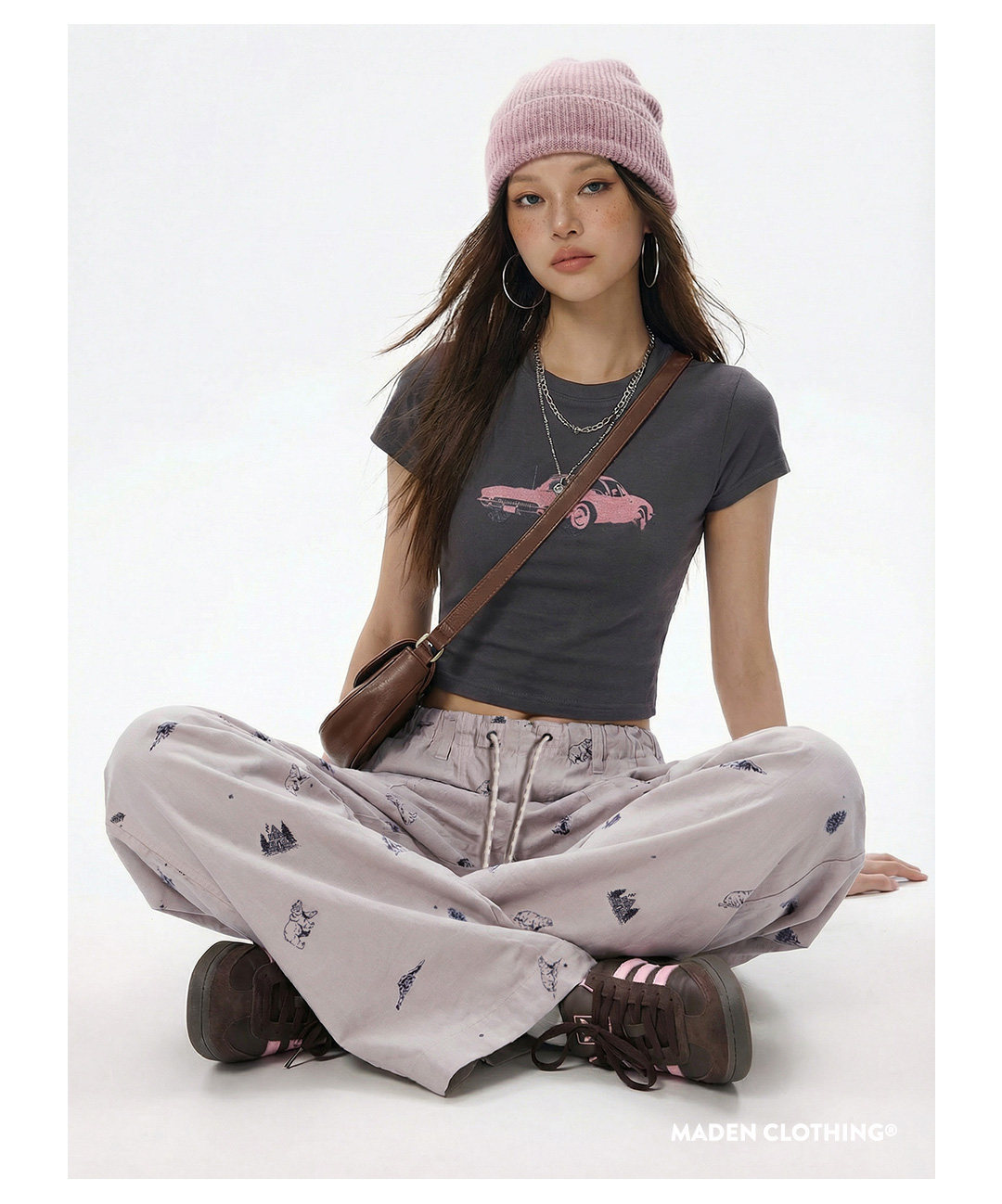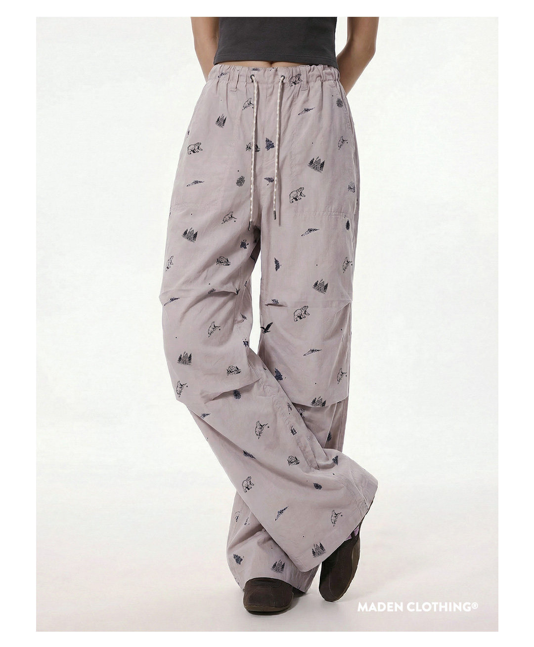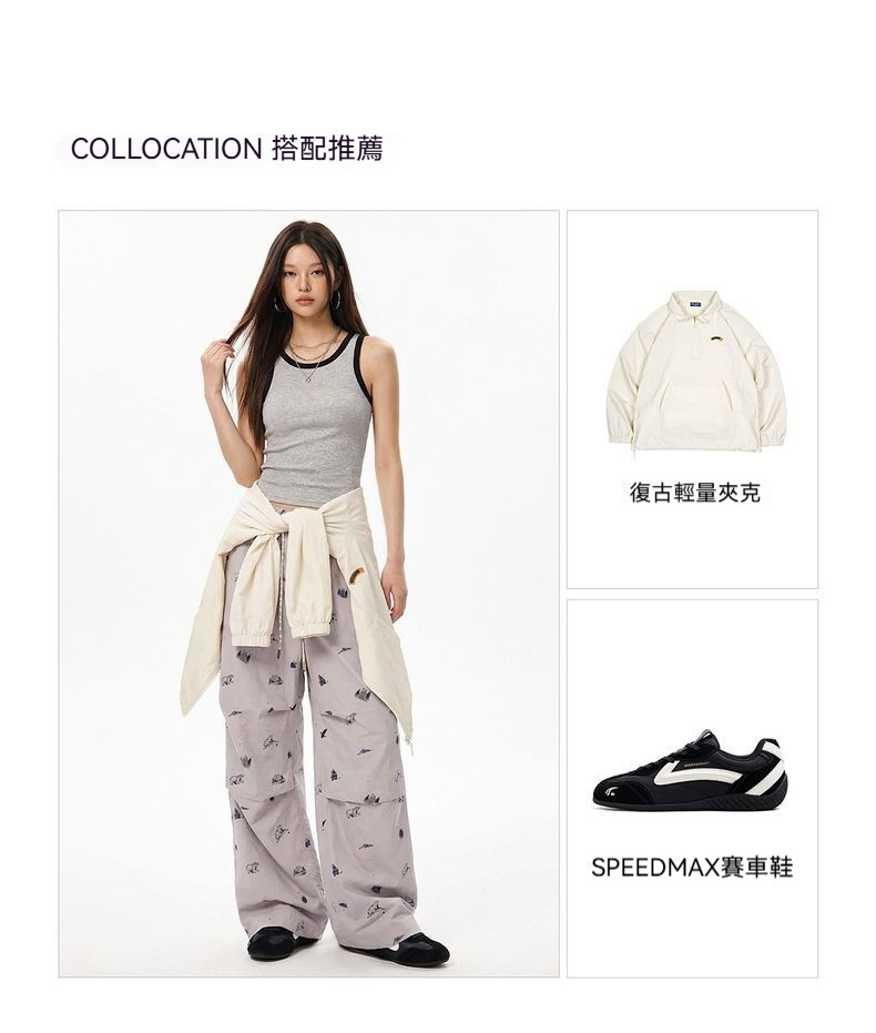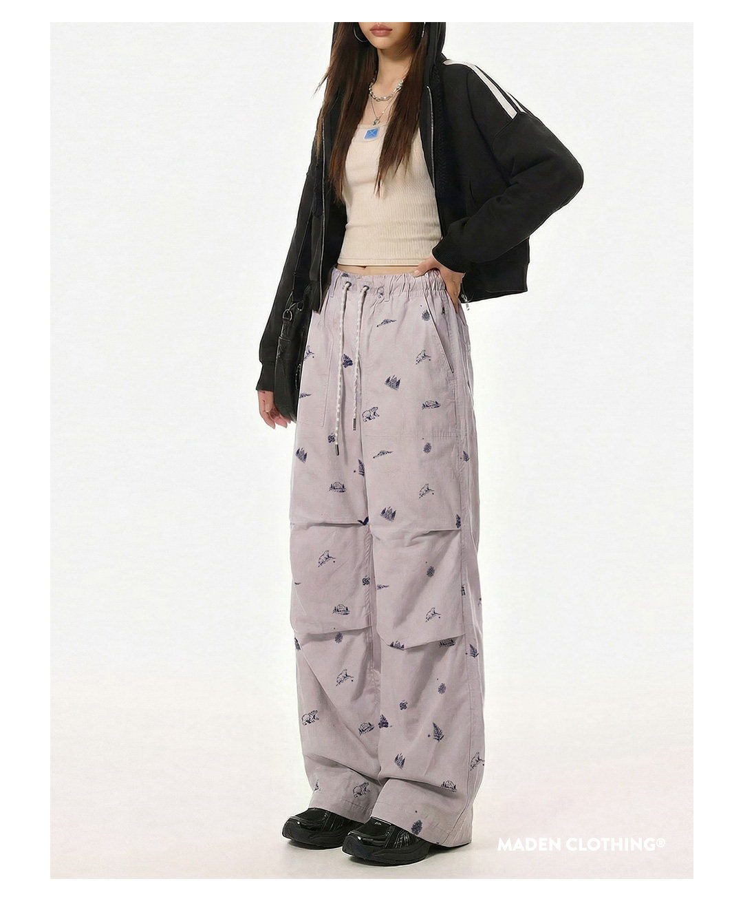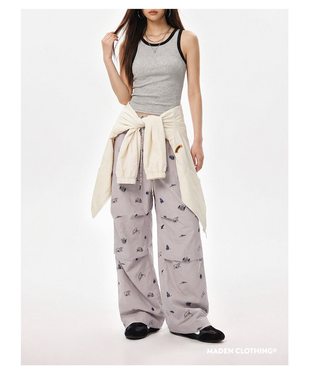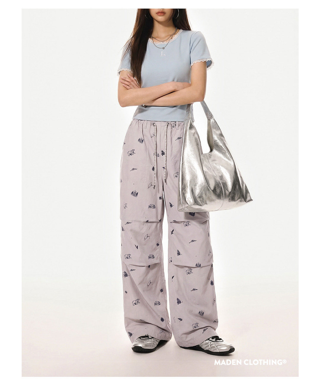 純棉薄款直筒闊腿山系傘兵褲鬆緊腰印花休閒工裝長褲子女士春