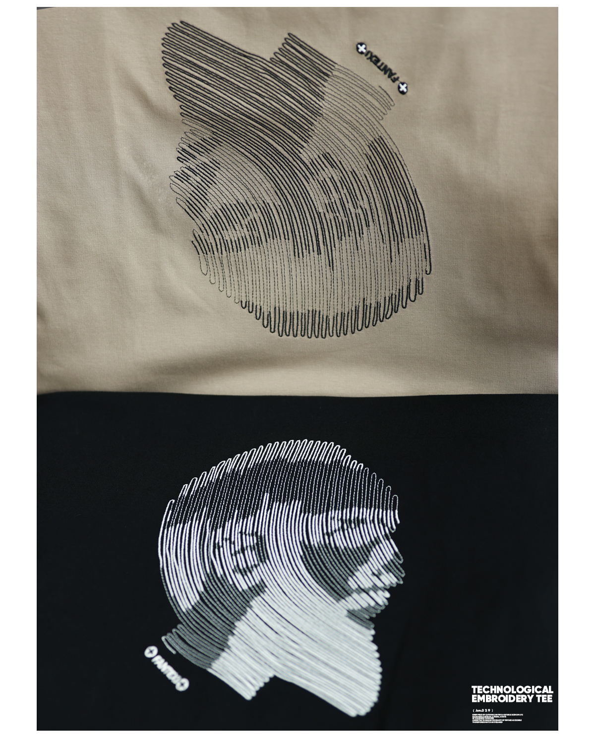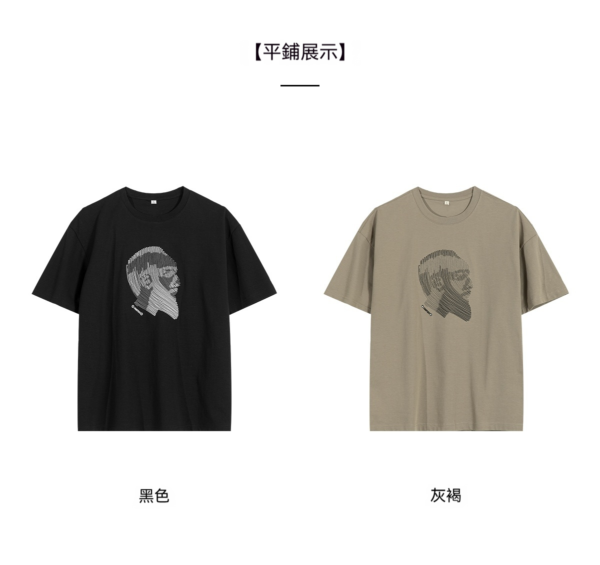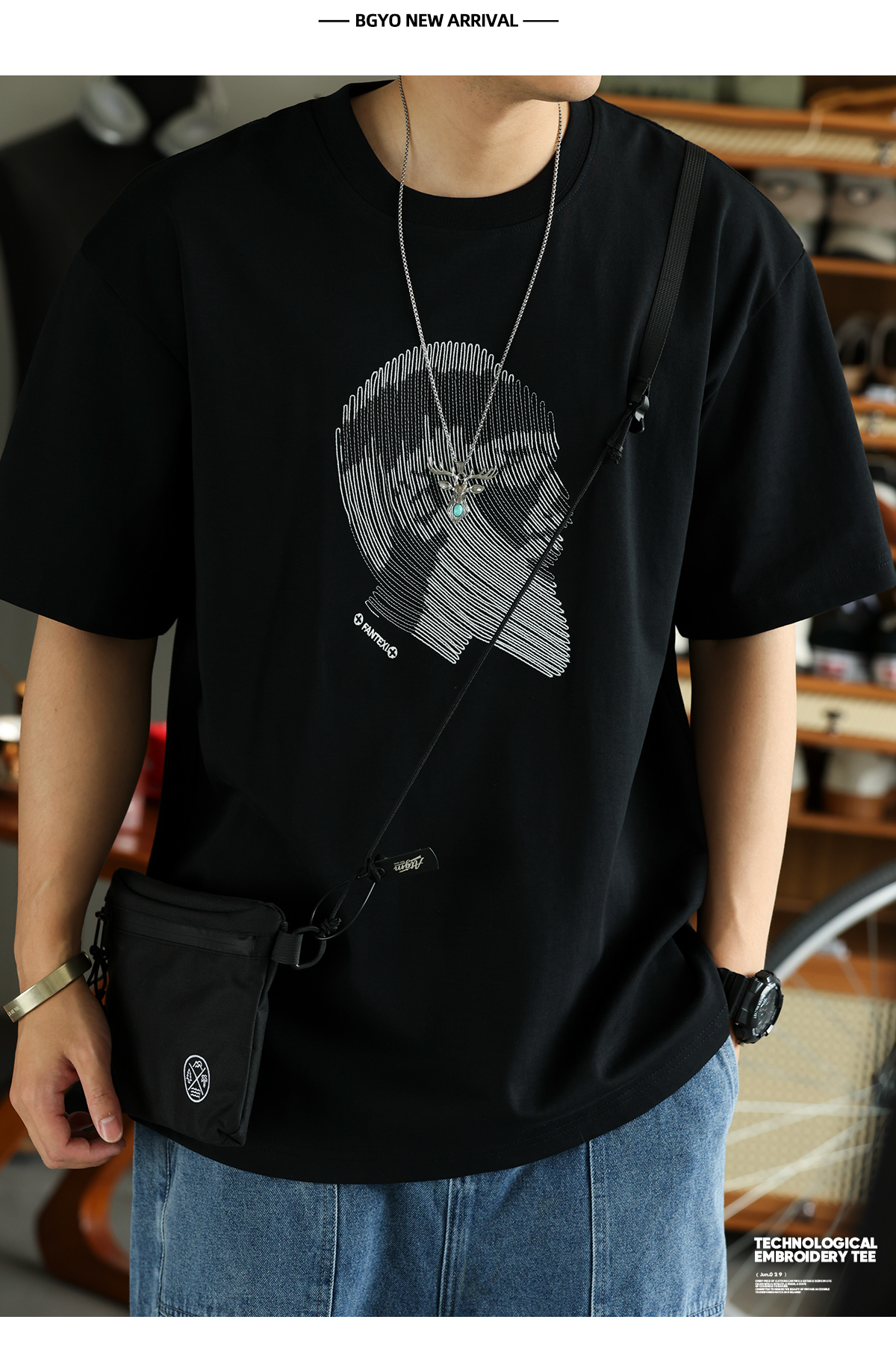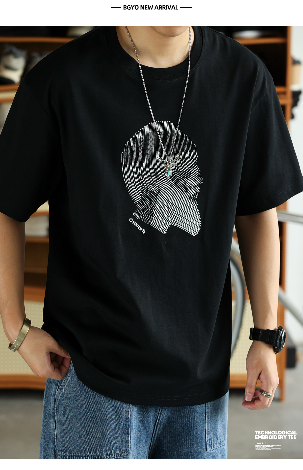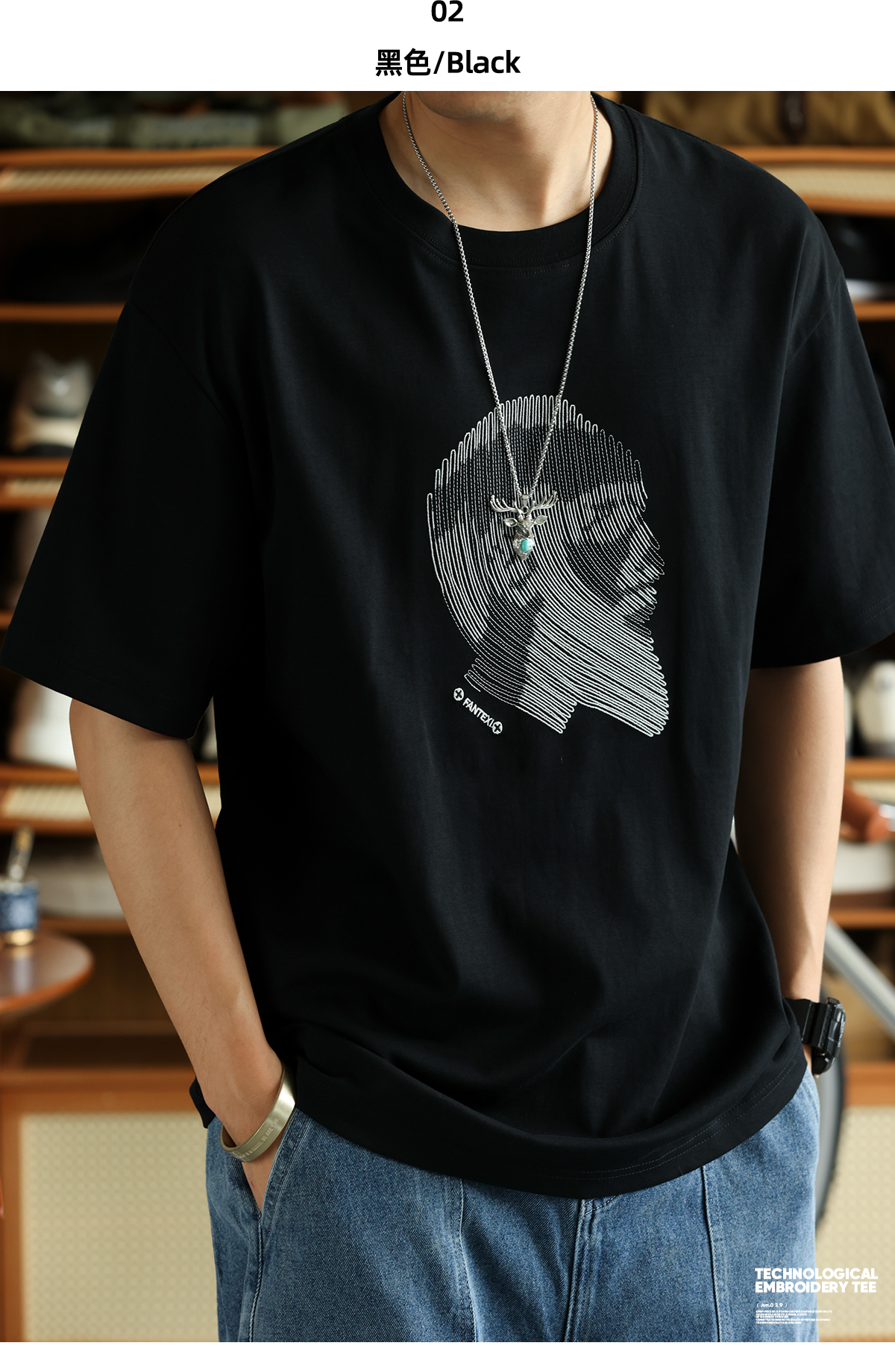 美式休閒人物線條刺繡短袖T恤男寬鬆250g棉混紡打底衫夏