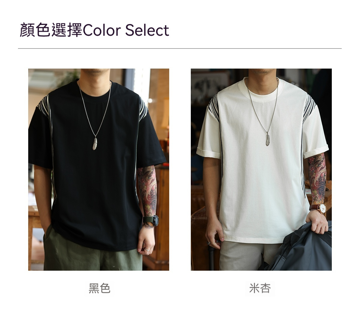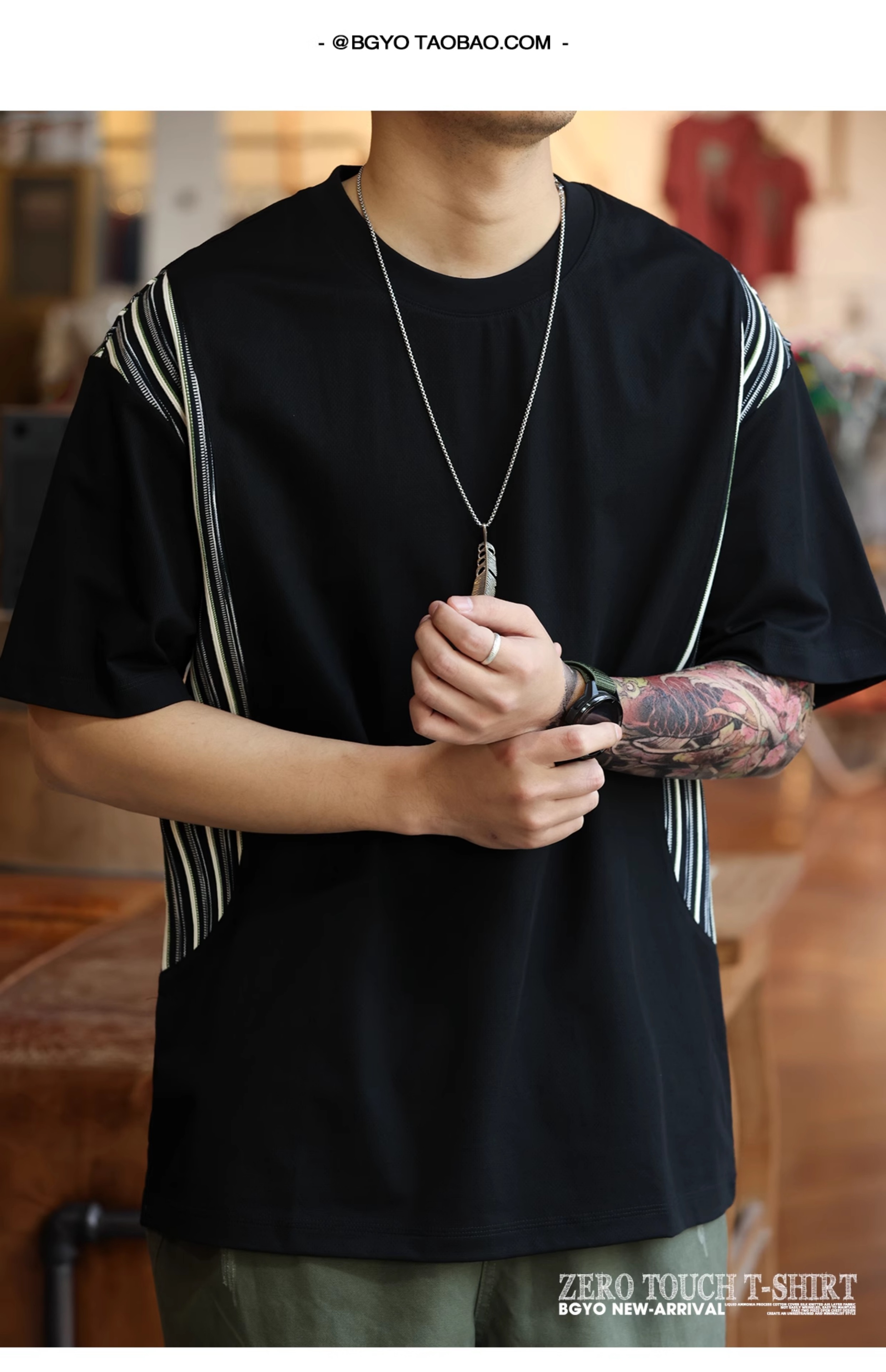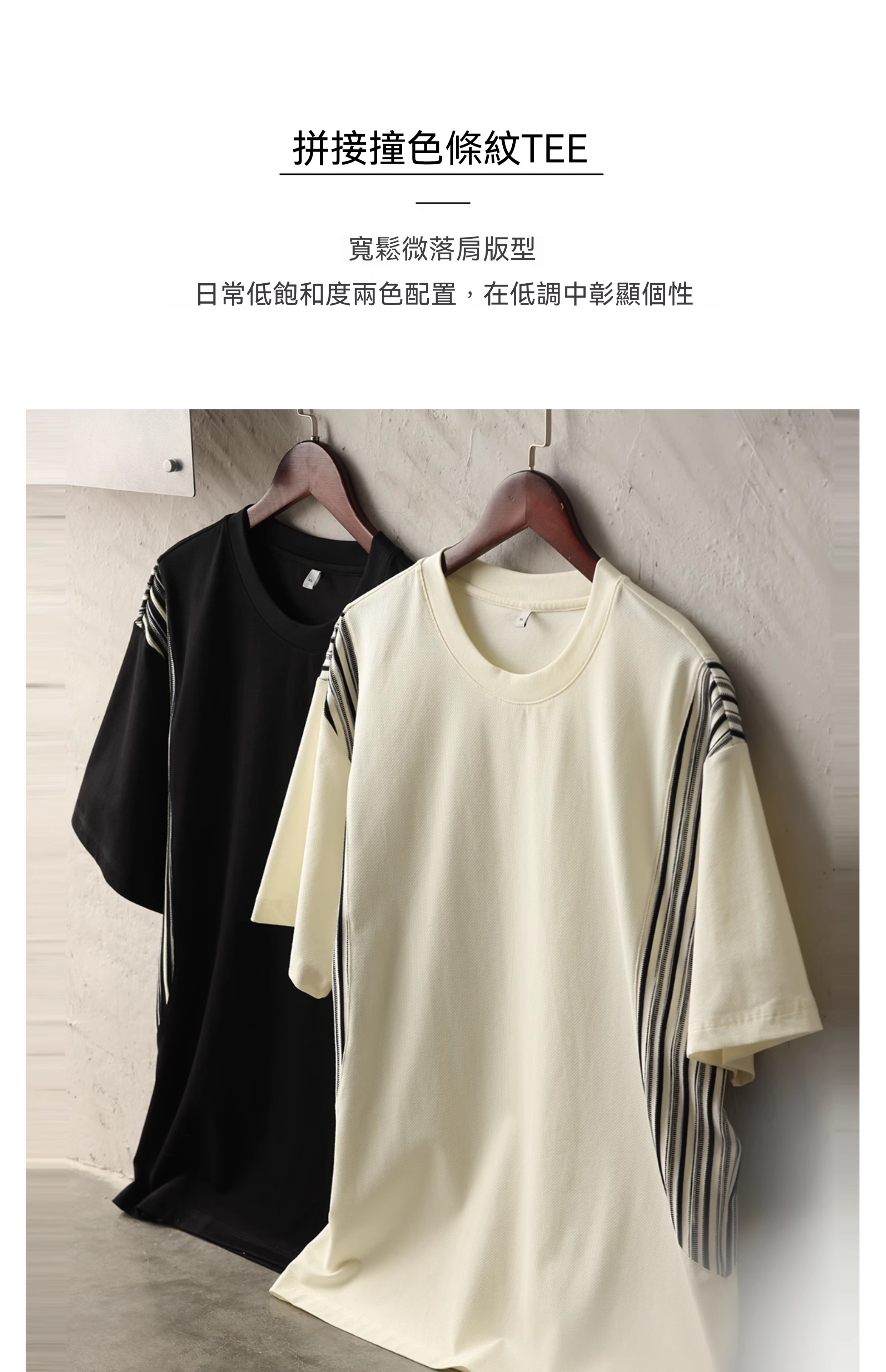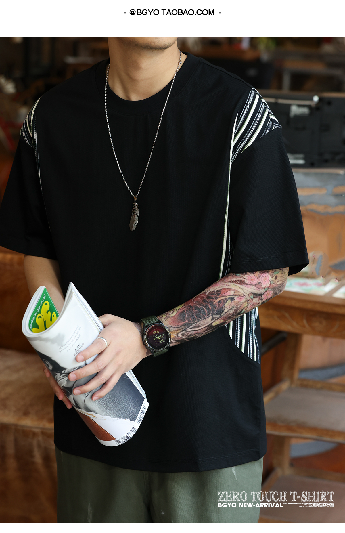 美式休閒提花條紋拼接短袖T恤男寬鬆200g凉感圓領打底衫