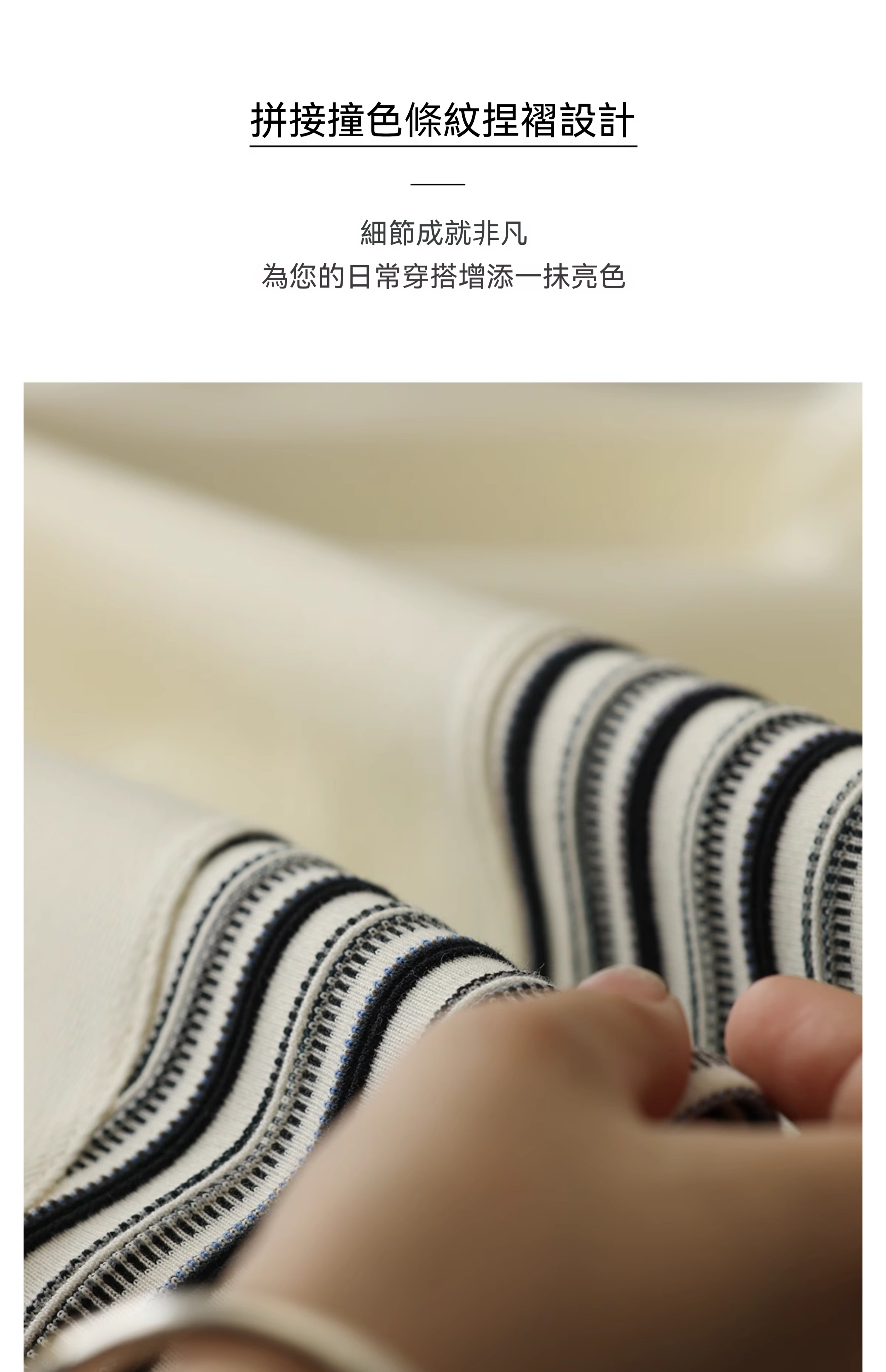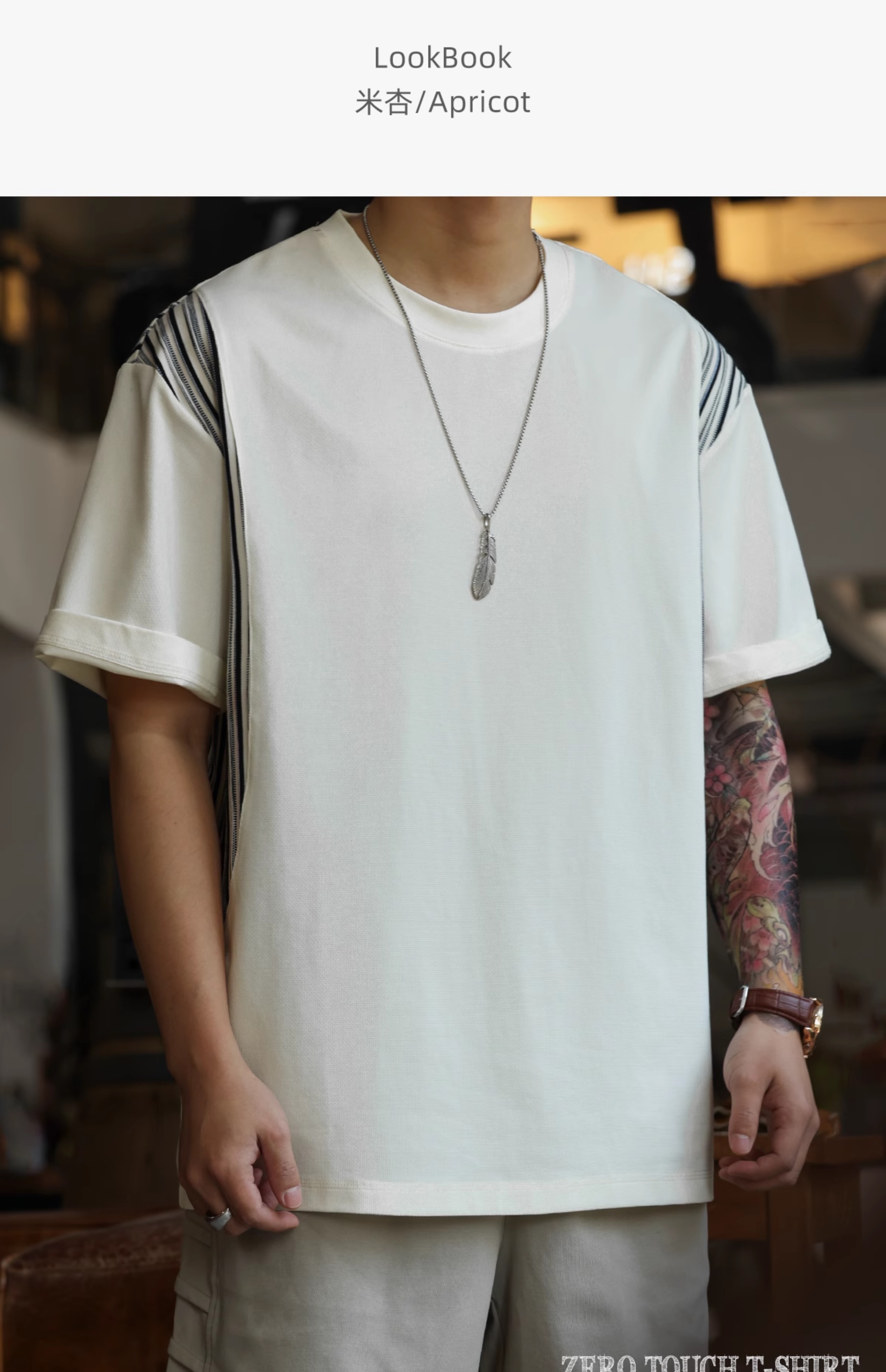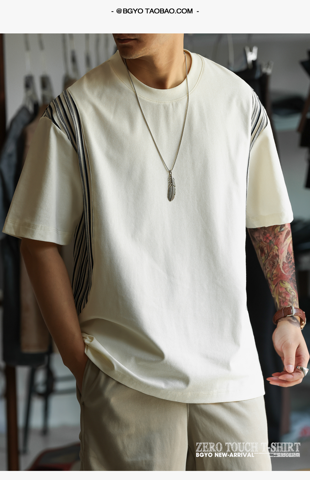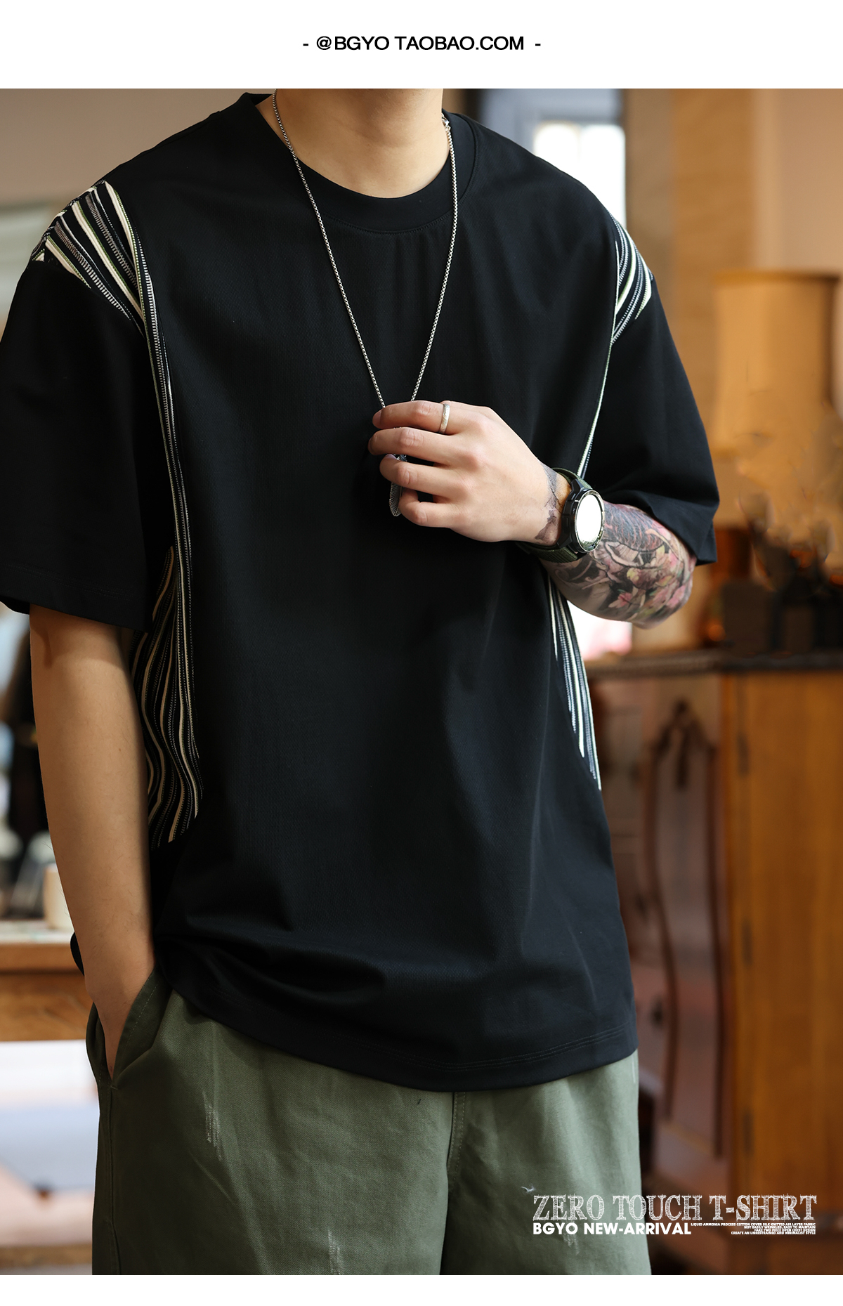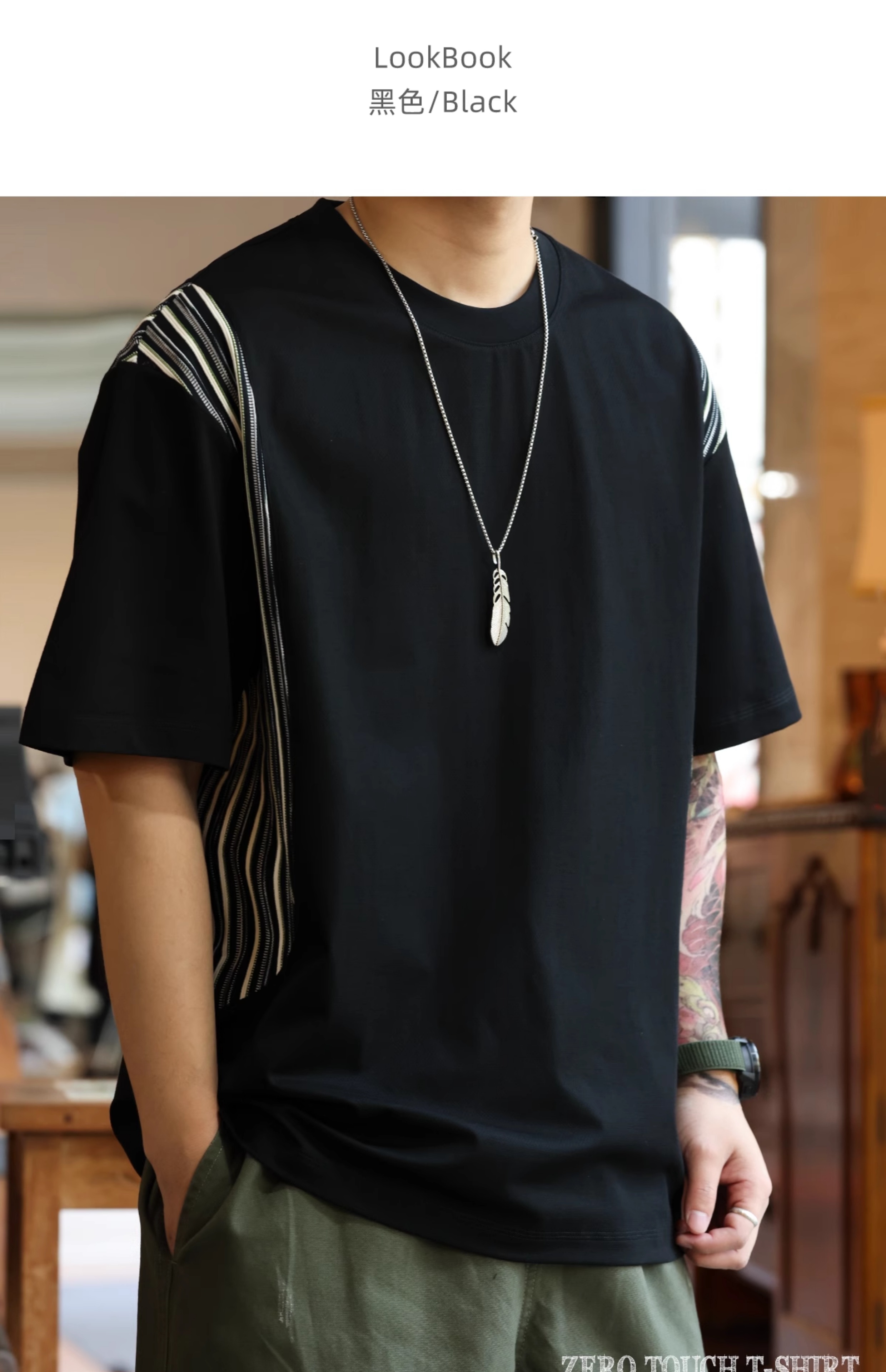 美式休閒提花條紋拼接短袖T恤男寬鬆200g凉感圓領打底衫