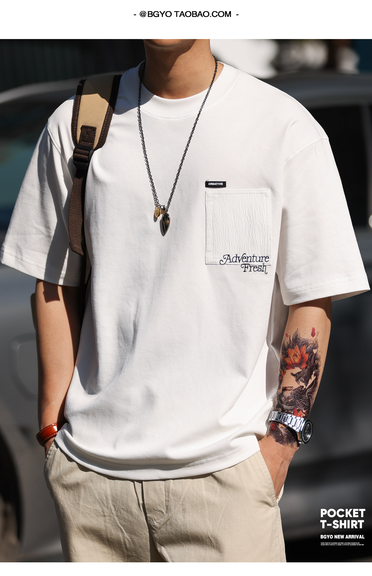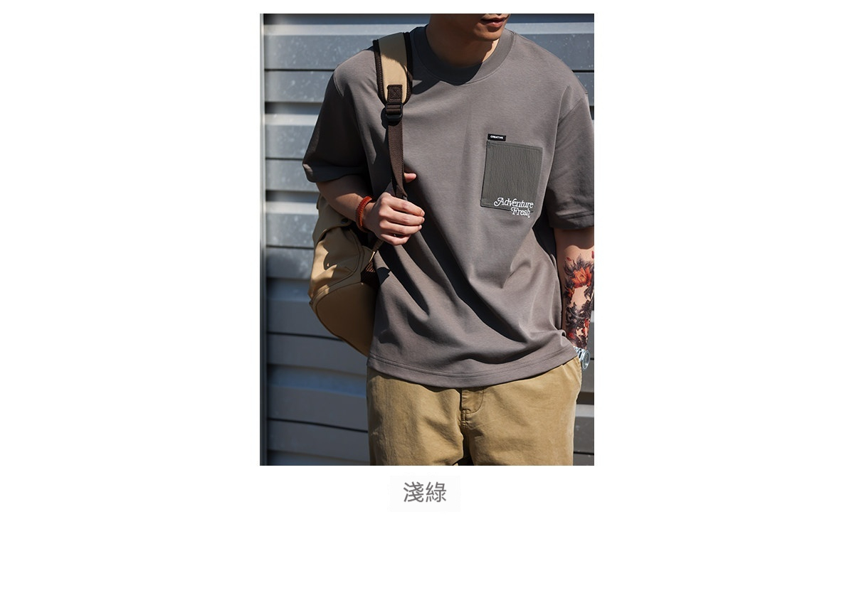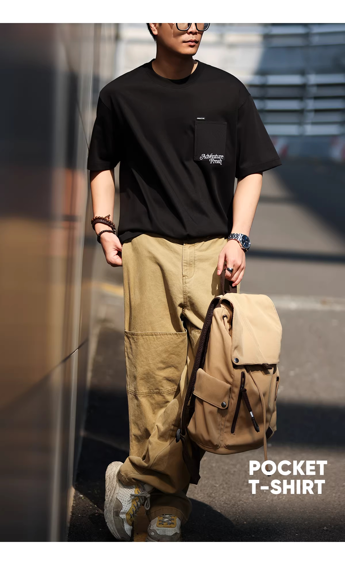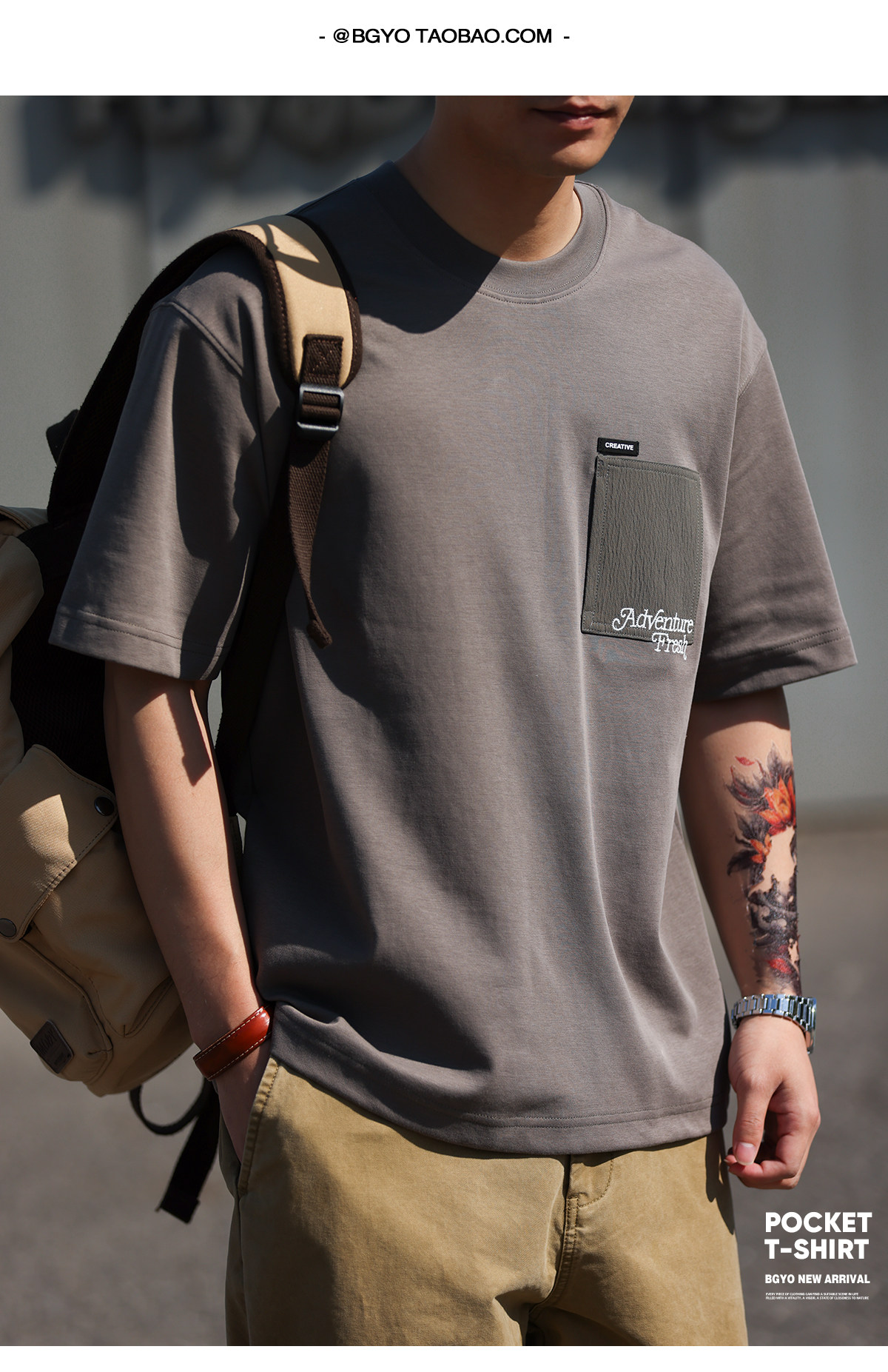 美式休閒立體口袋刺繡短袖T恤男戶外風工裝圓領打底TEE
