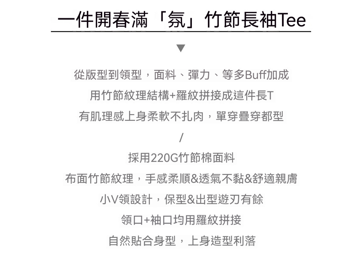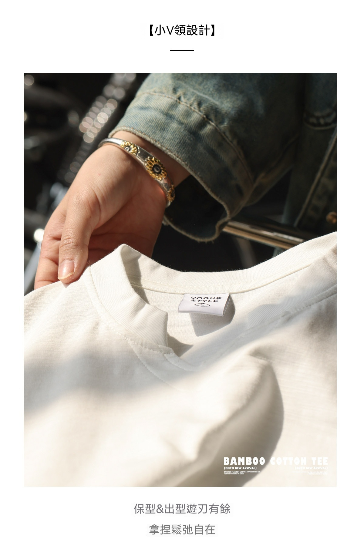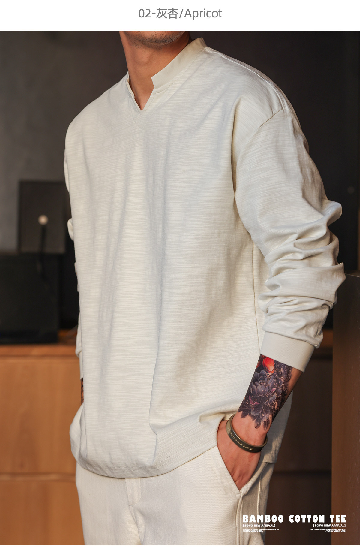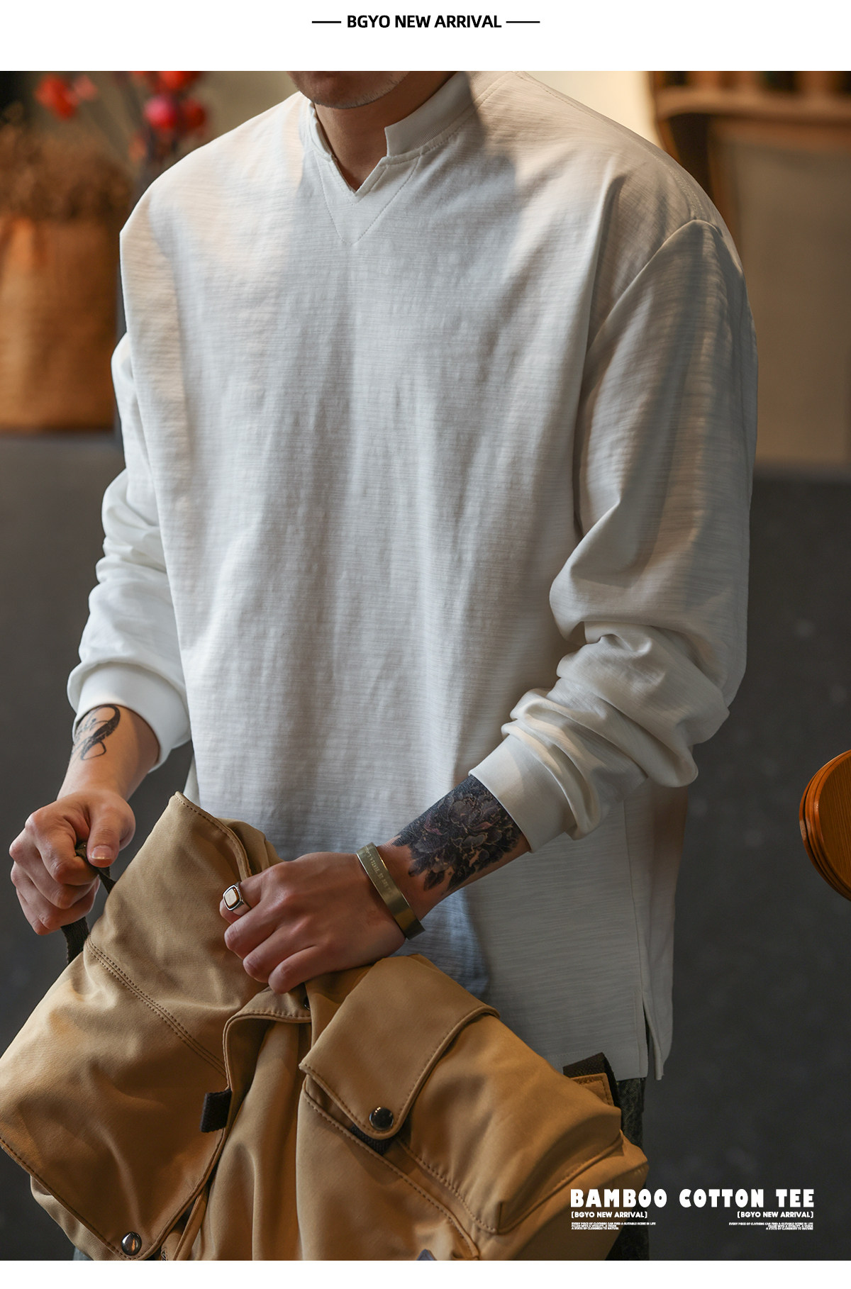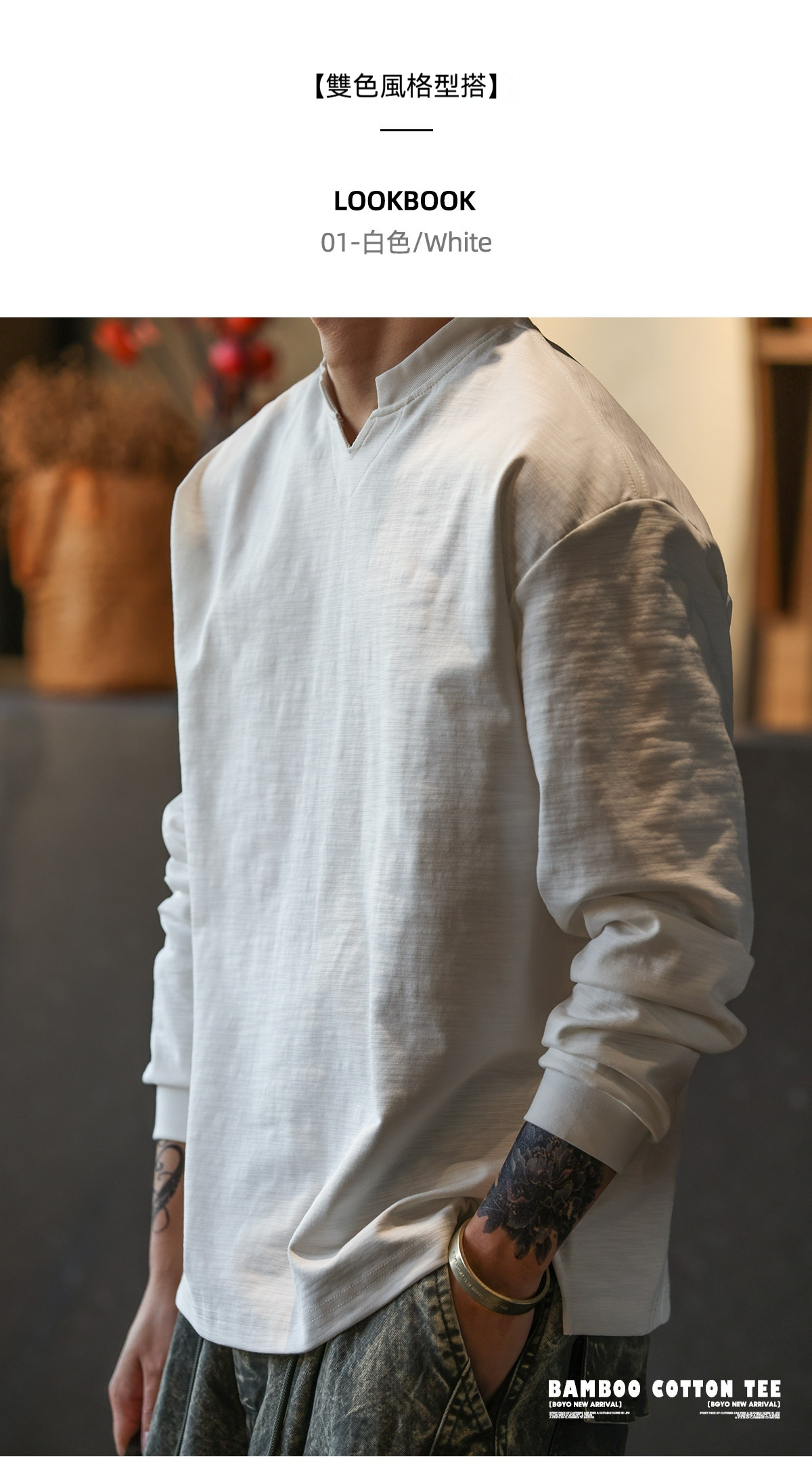 美式休閒竹節紗小V領長袖T恤男寬鬆簡約慵懶感打底衫春
