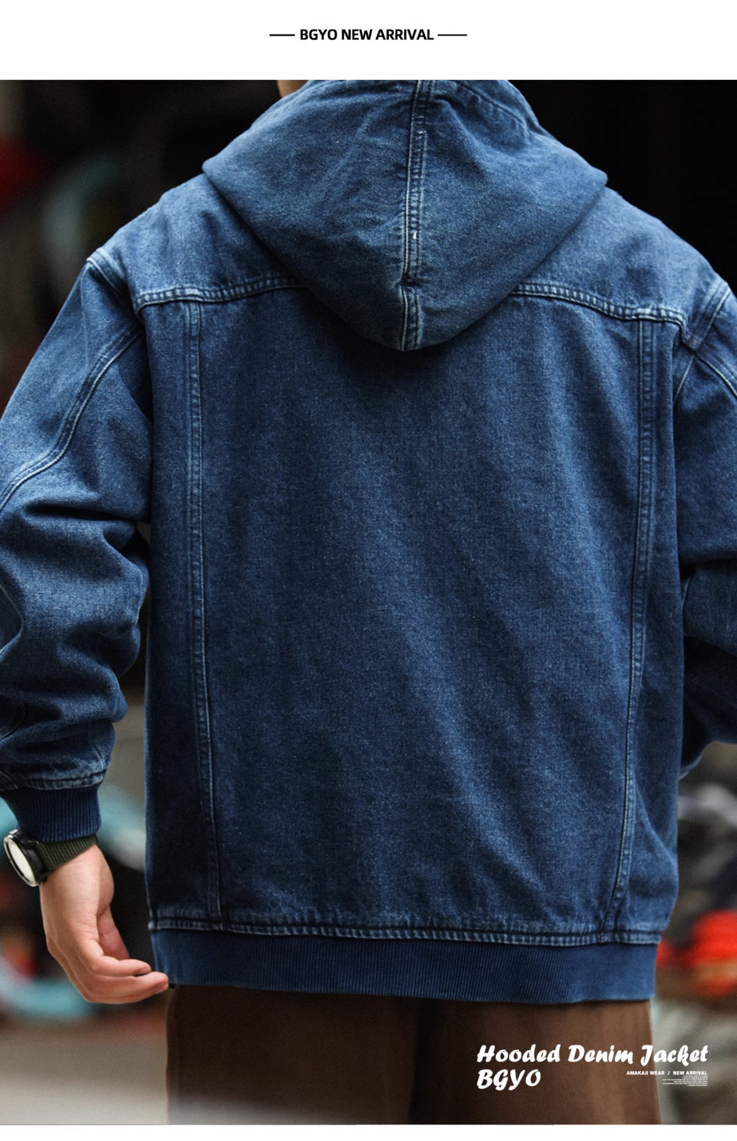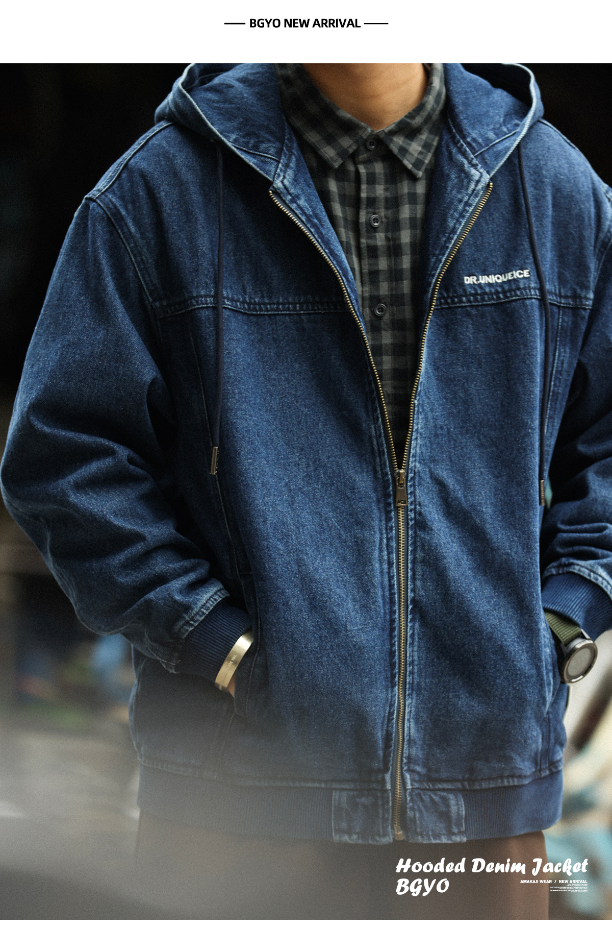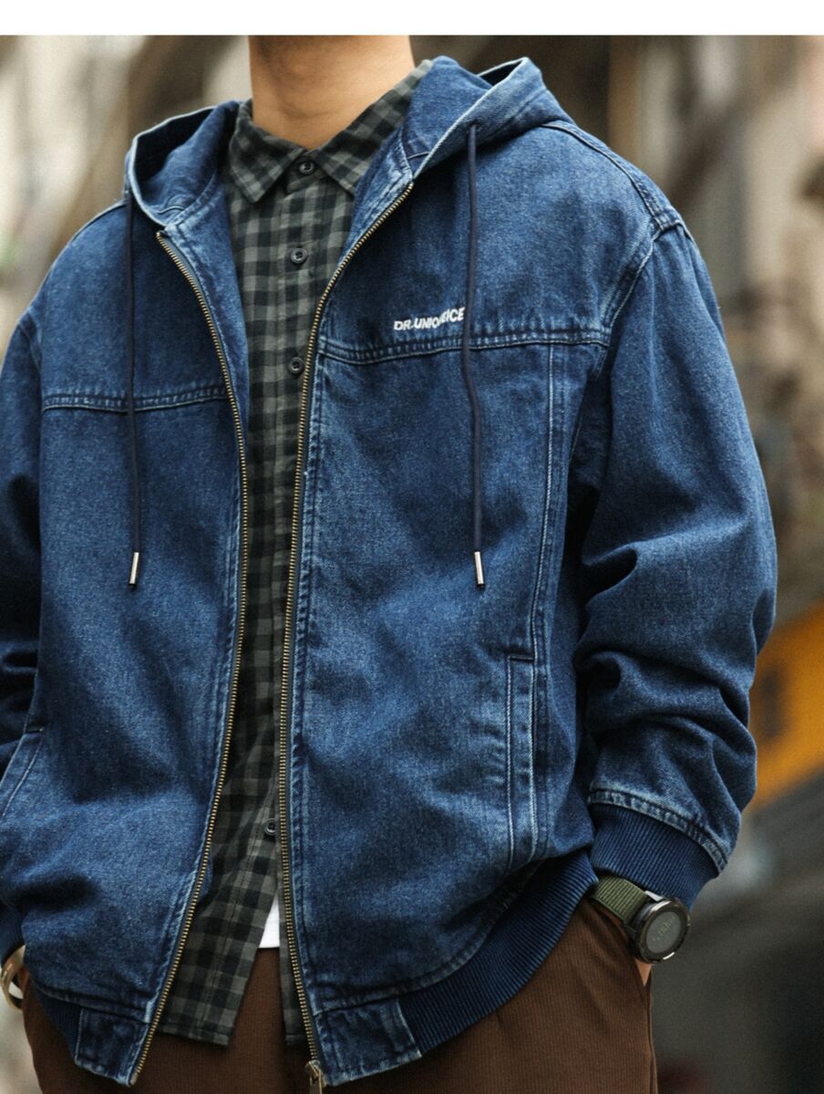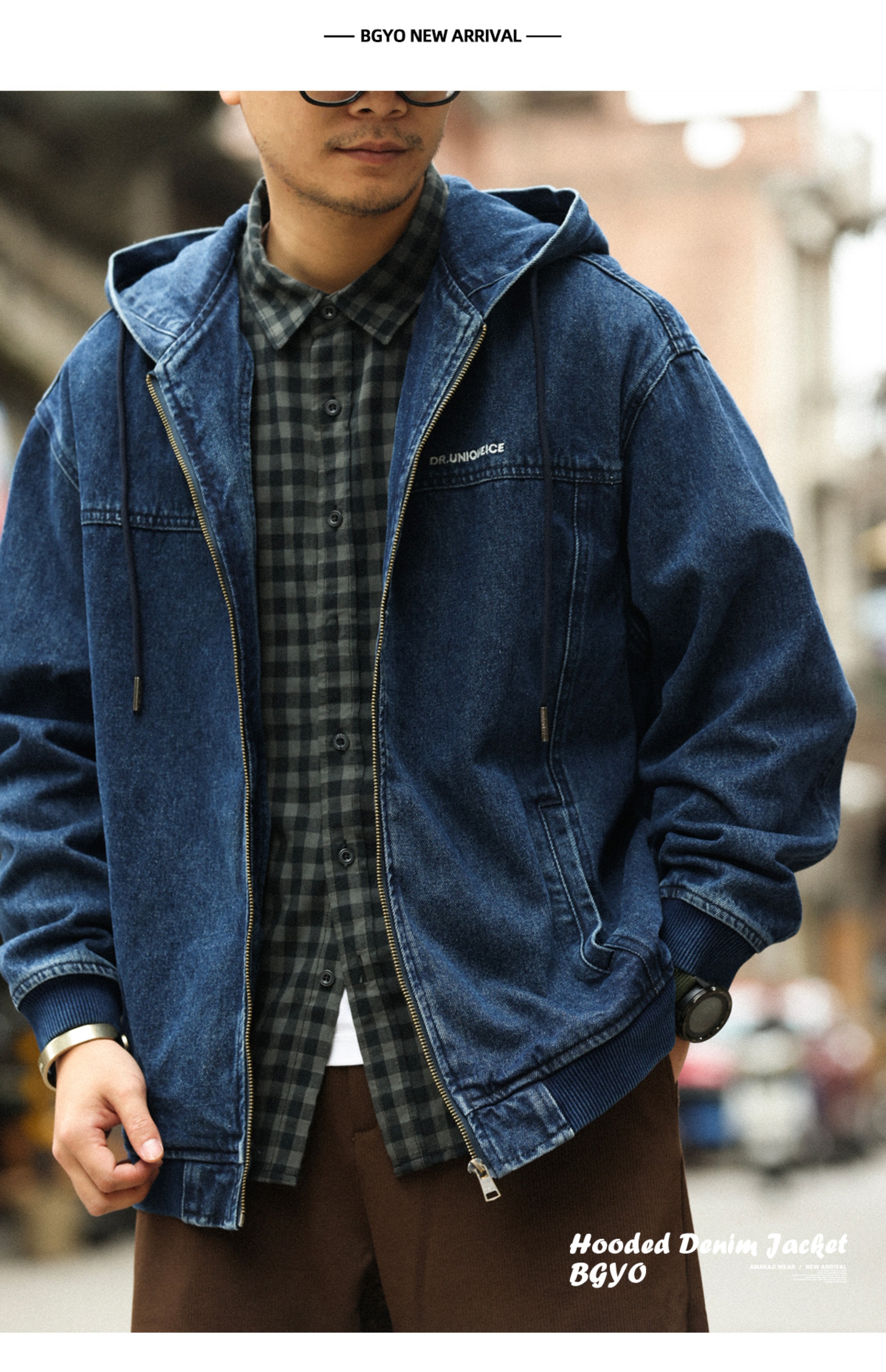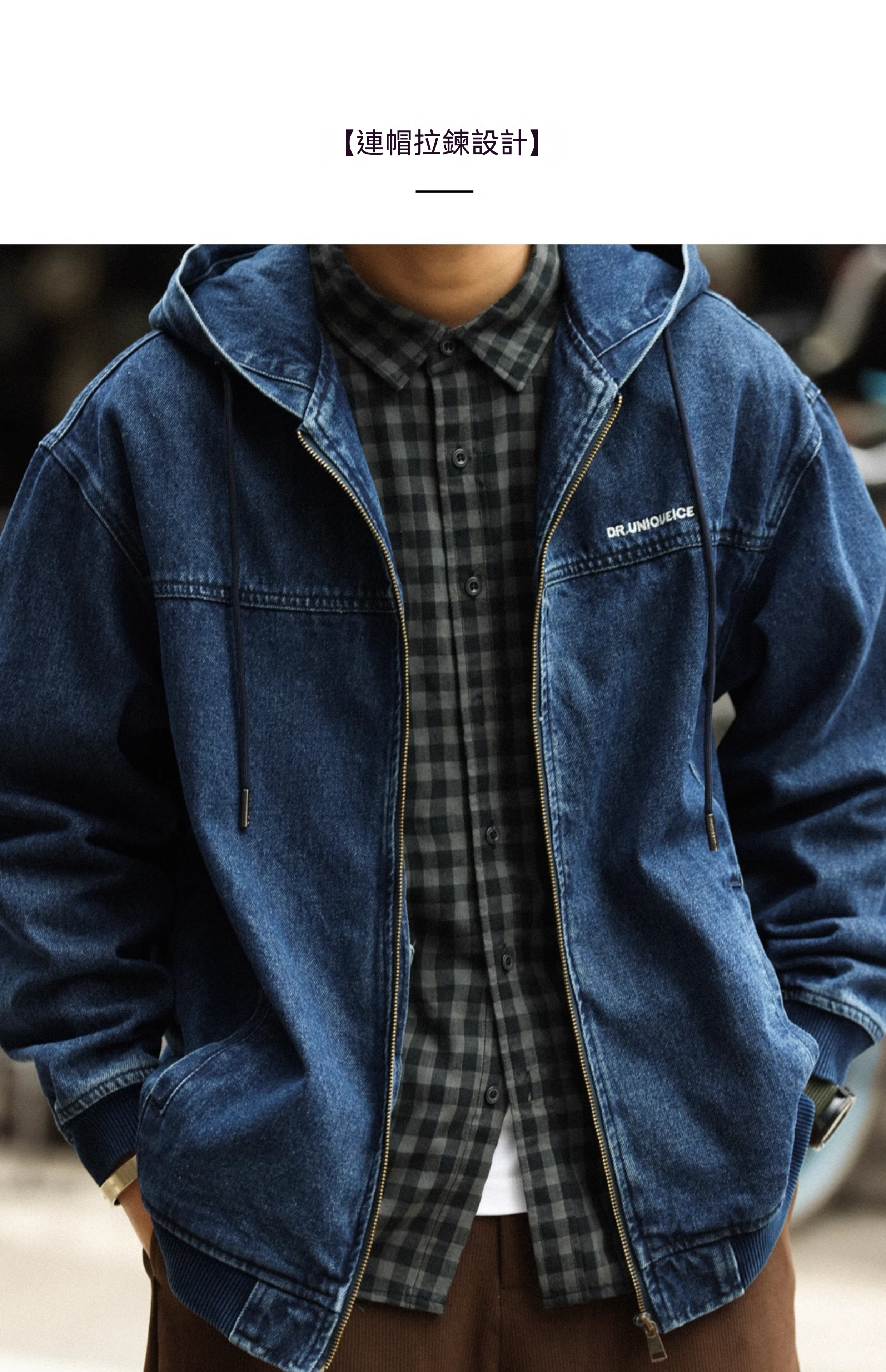美式休閒連帽牛仔外套男寬鬆丹寧水洗重磅拉鍊工裝夾克