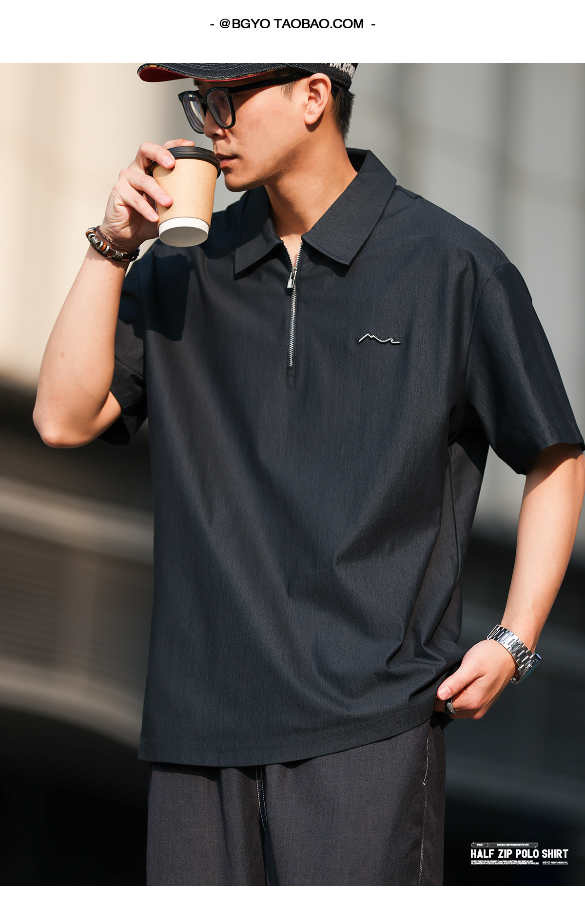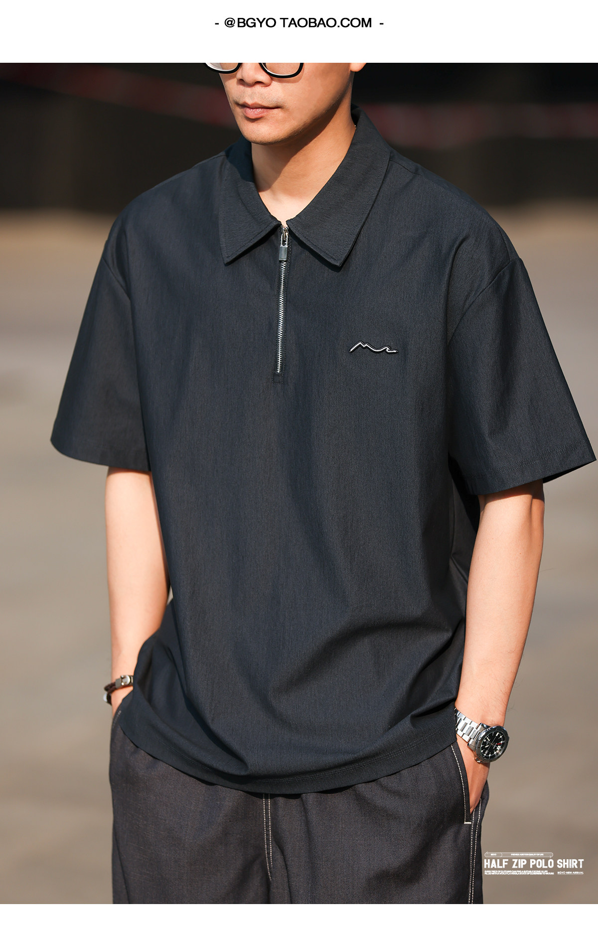 美式休閒200g半拉鍊短袖POLO衫男仿原牛色寬鬆襯衫領T恤
