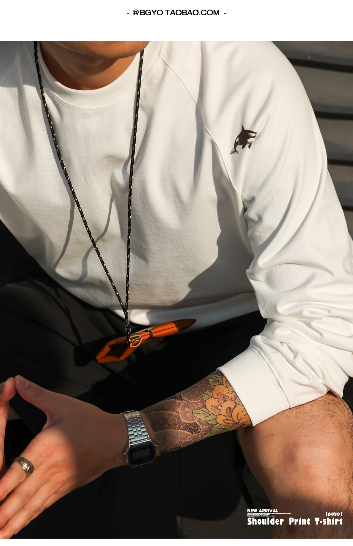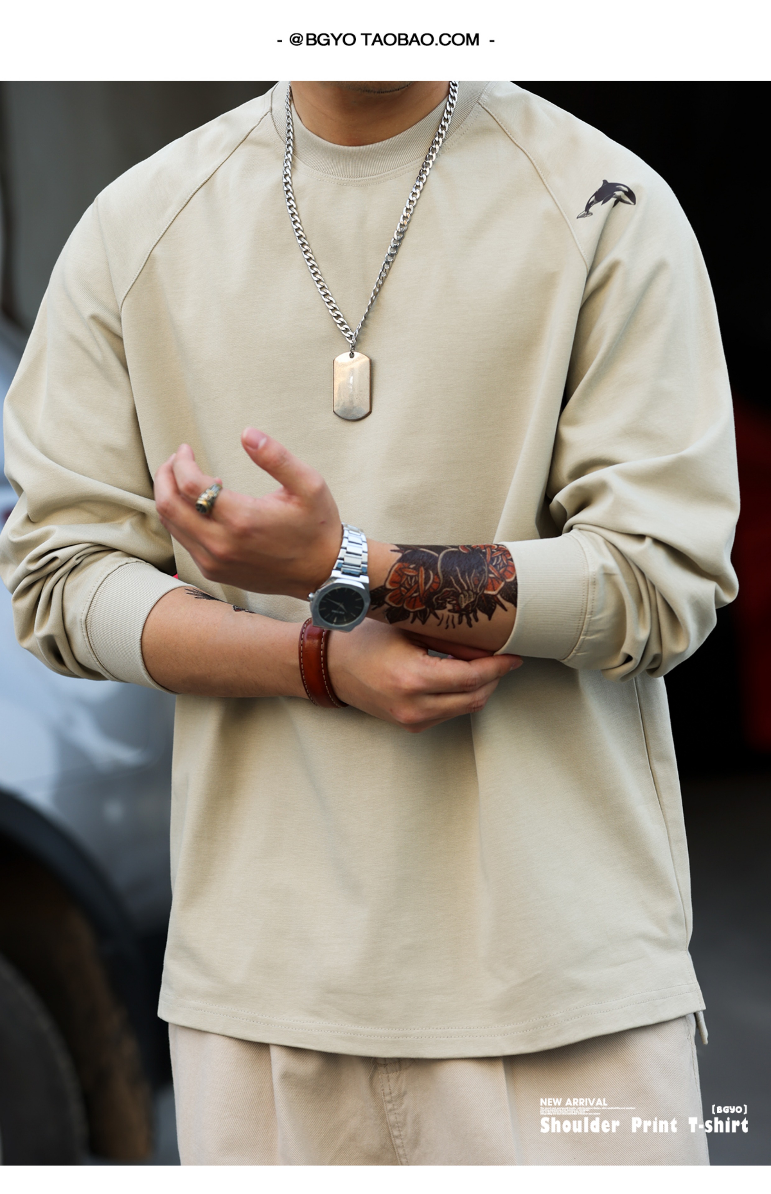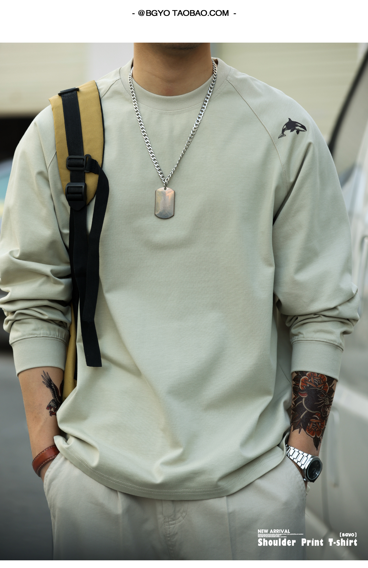 美式休閒300g重磅插肩長袖T恤男鯨魚印花三本針純棉TEE
