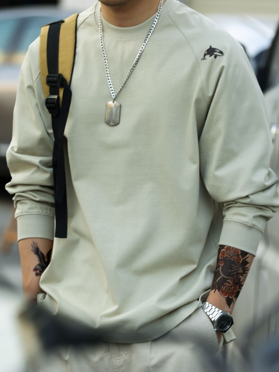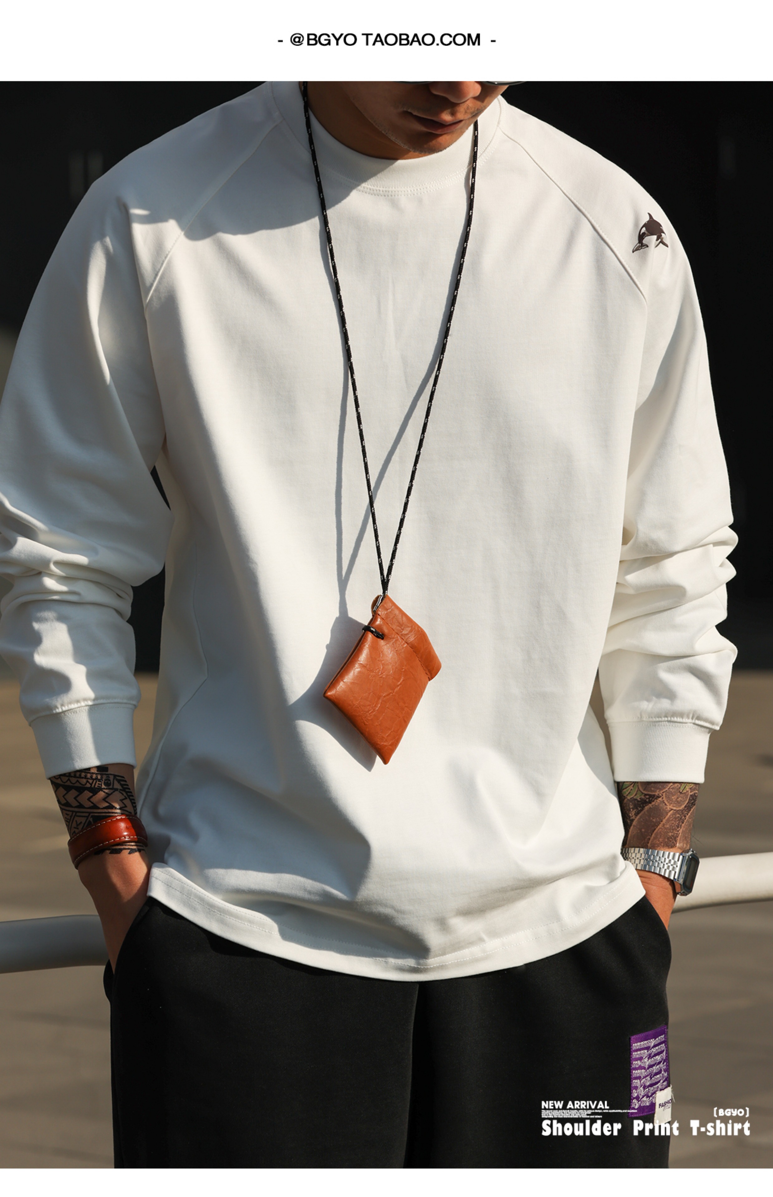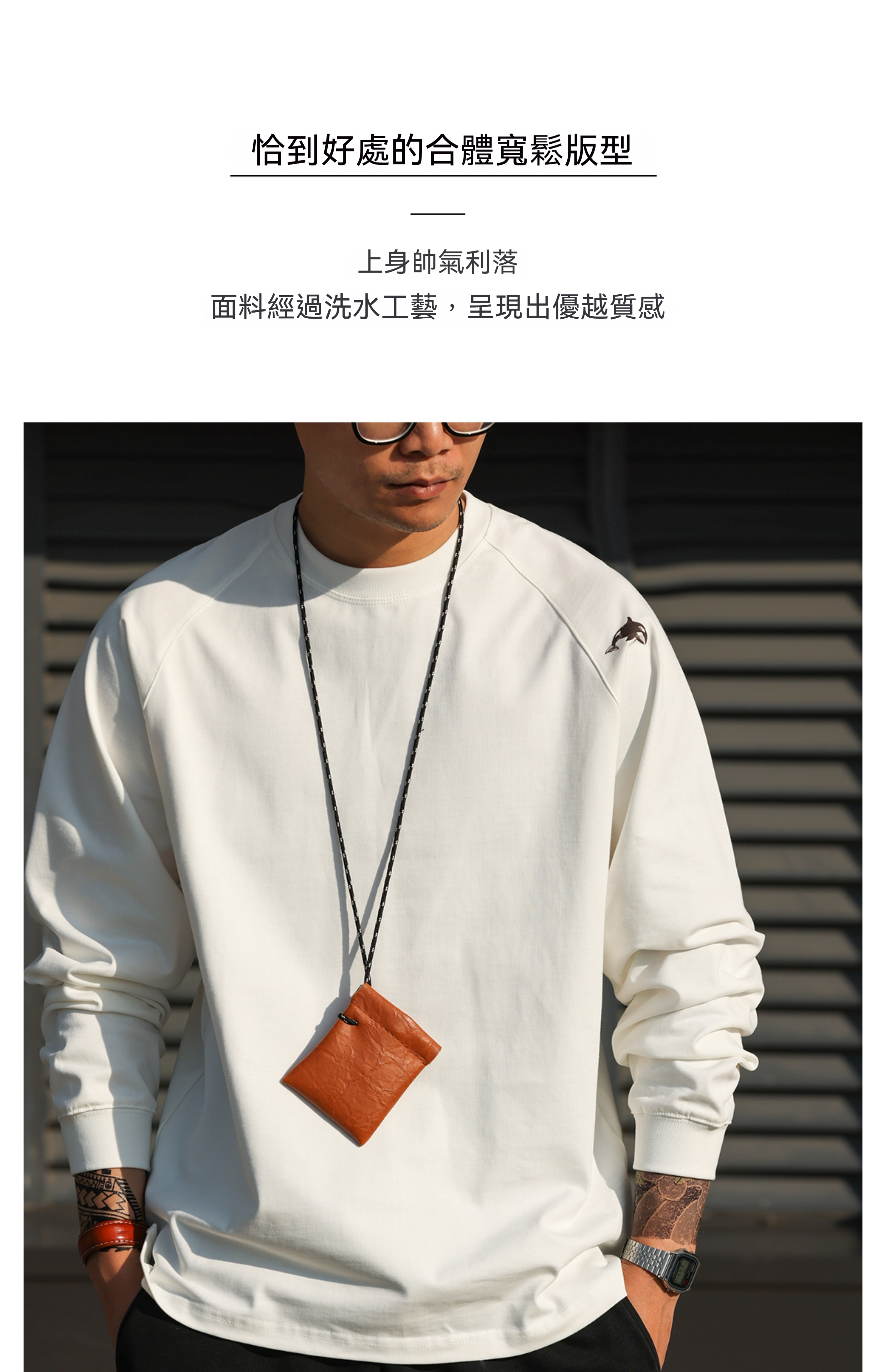 美式休閒300g重磅插肩長袖T恤男鯨魚印花三本針純棉TEE