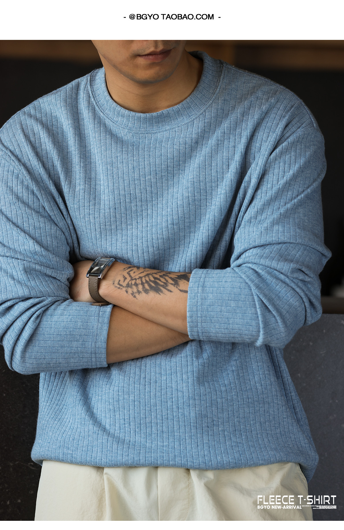 美式坑條肌理感針織T恤男380g重磅彈力暖絨長袖打底TEE