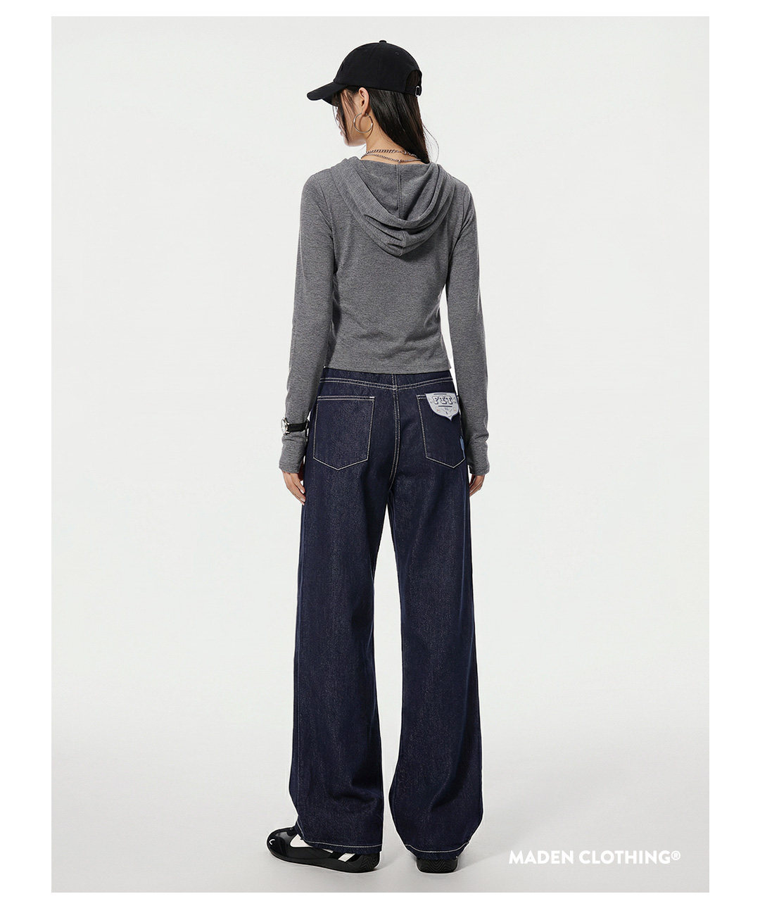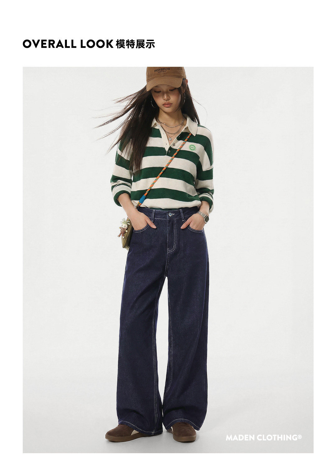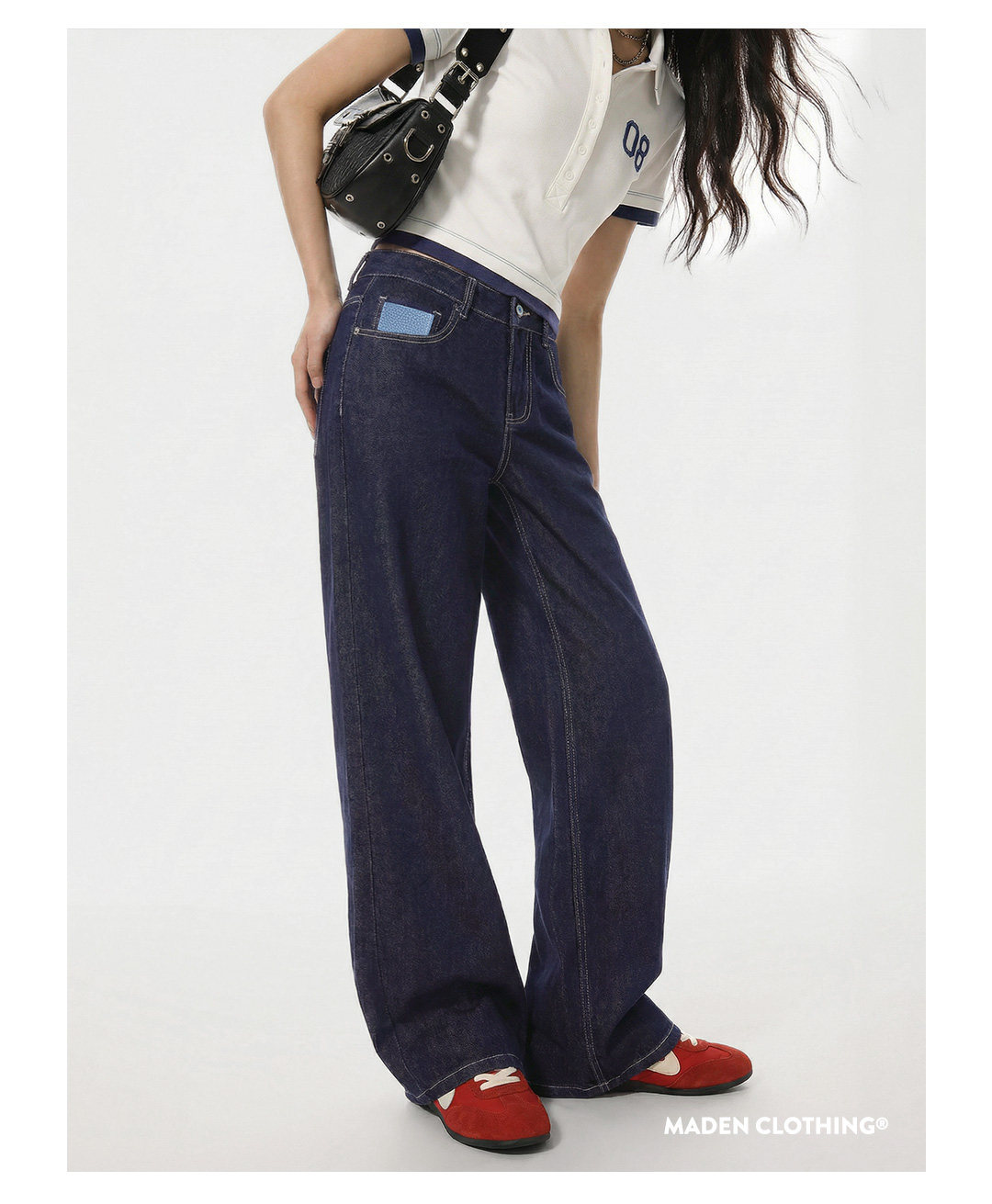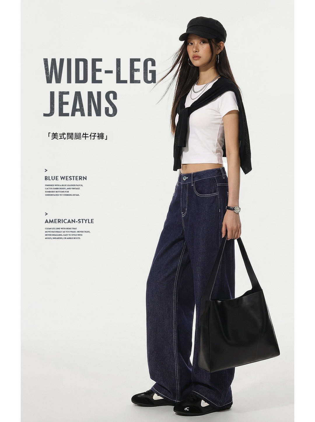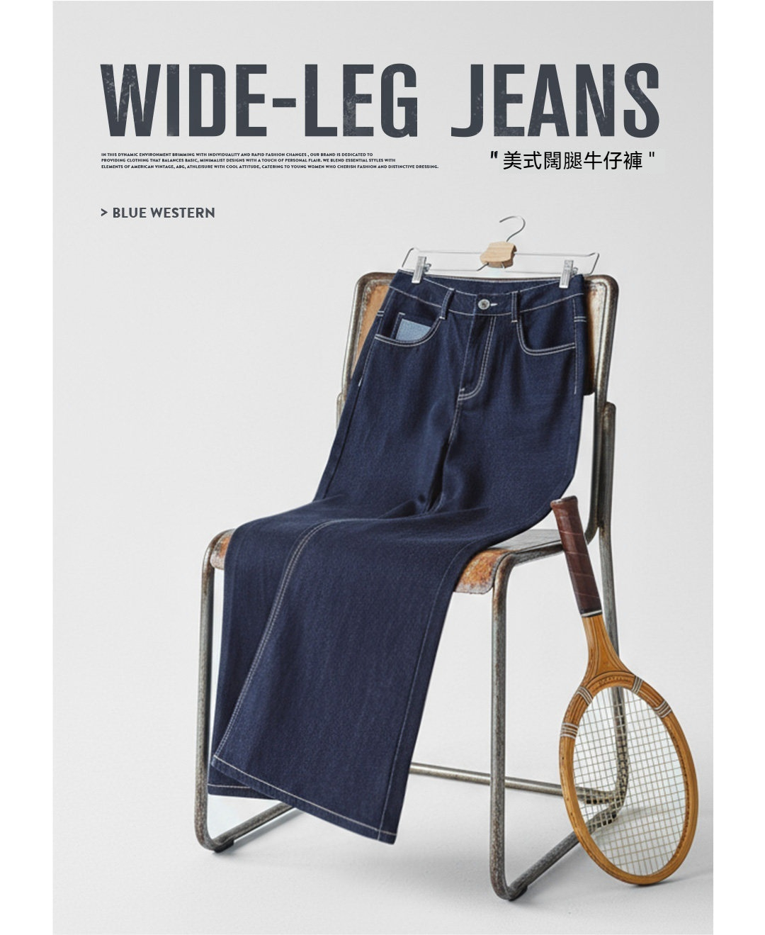 美式復古丹寧藍原色直筒闊腿水洗牛仔褲顯瘦休閒長褲子女士春