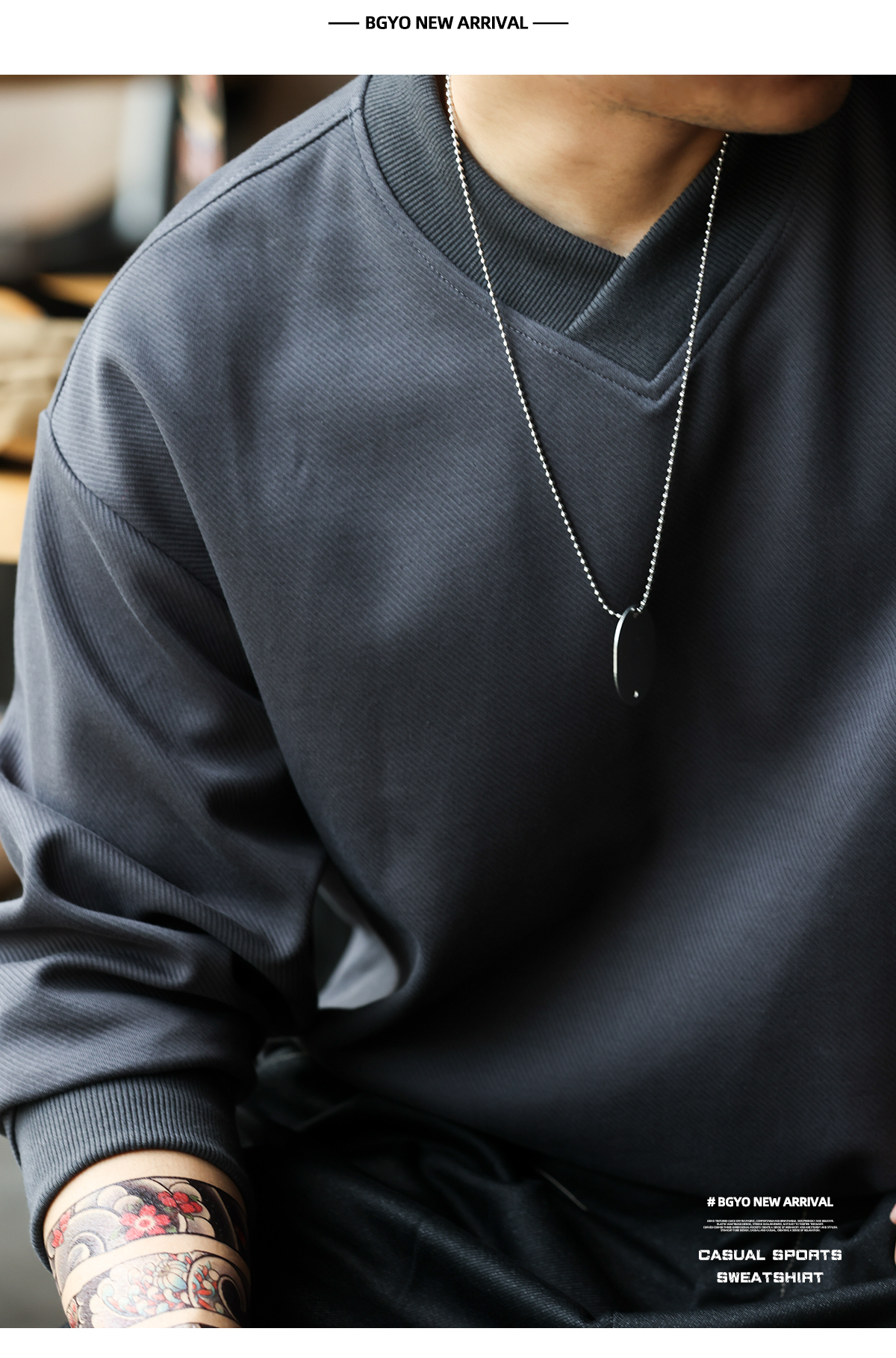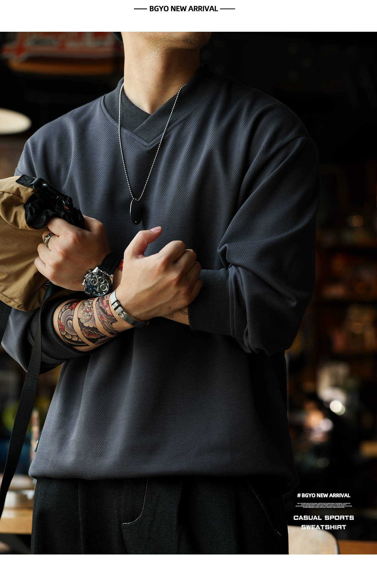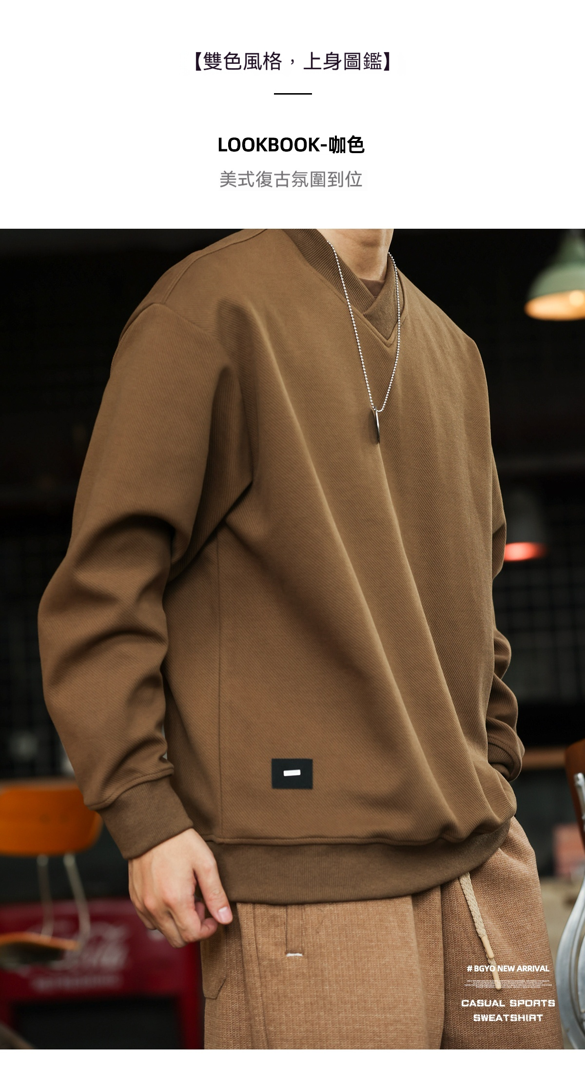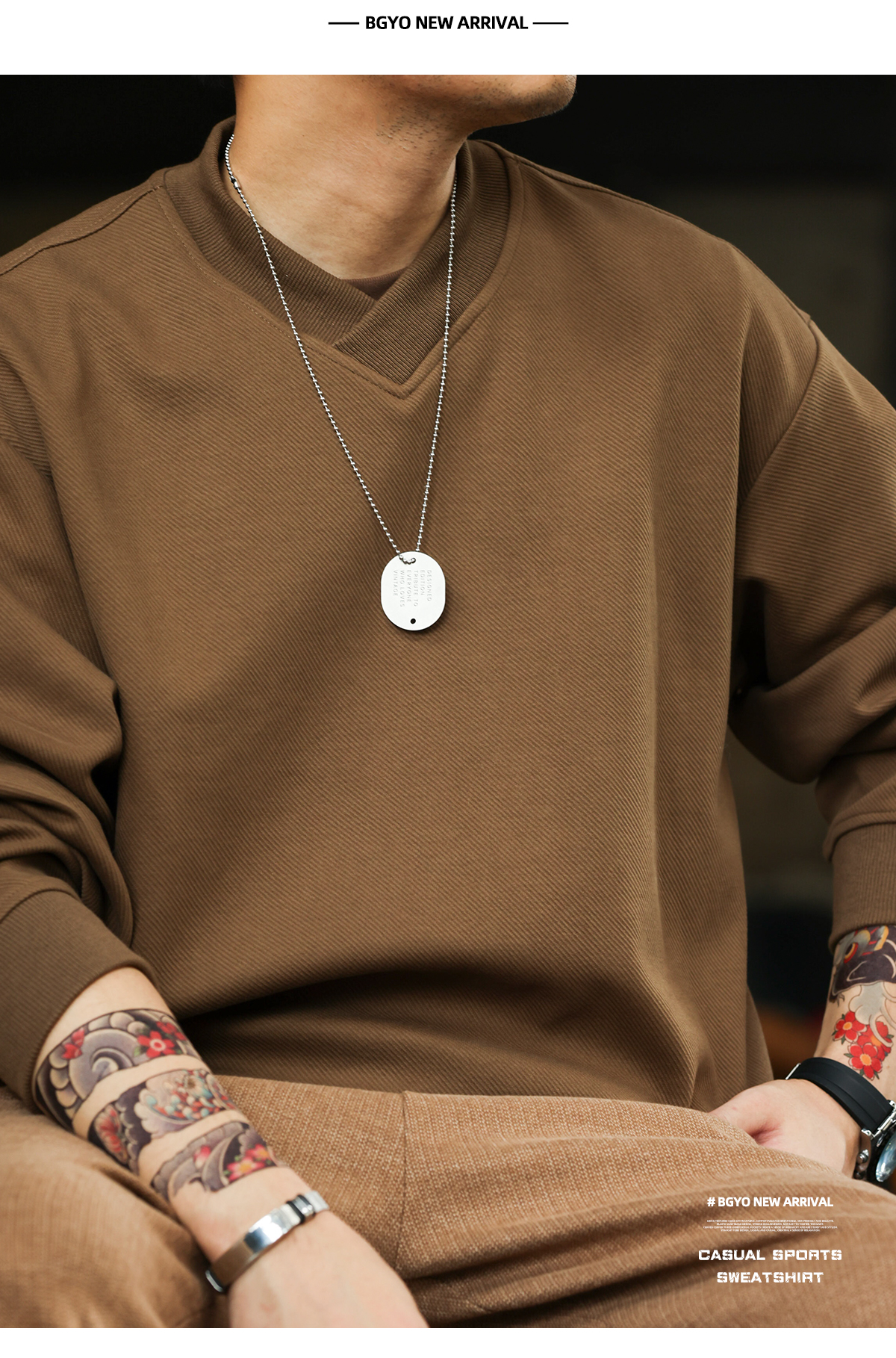 美式復古交疊小V領衛衣男380g斜紋肌理感休閒套頭上衣秋