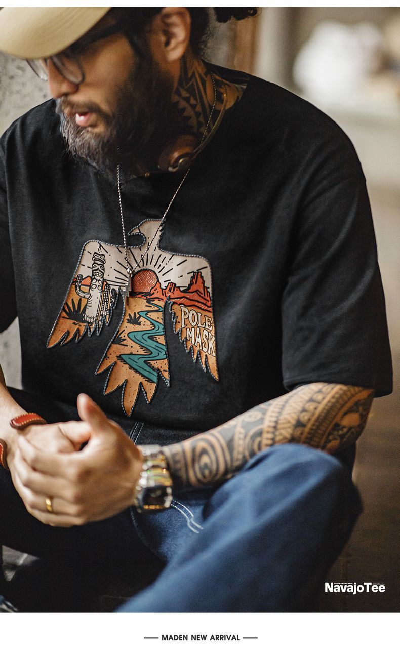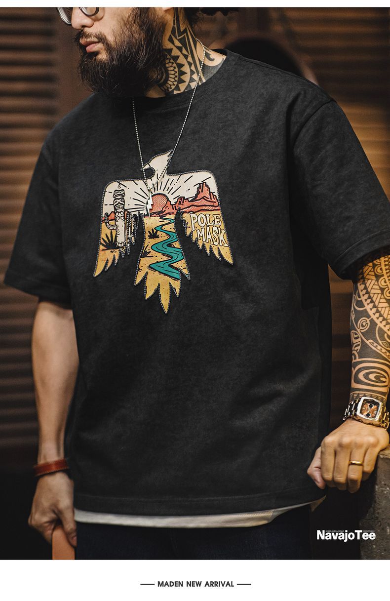 美式復古印第安雷鳥T恤棉重磅民族風刺繡印花短袖男夏季