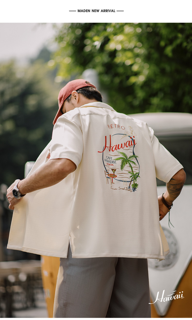 美式復古夏威夷刺繡短袖襯衫竹節紋垂感古巴領襯衣男夏季
