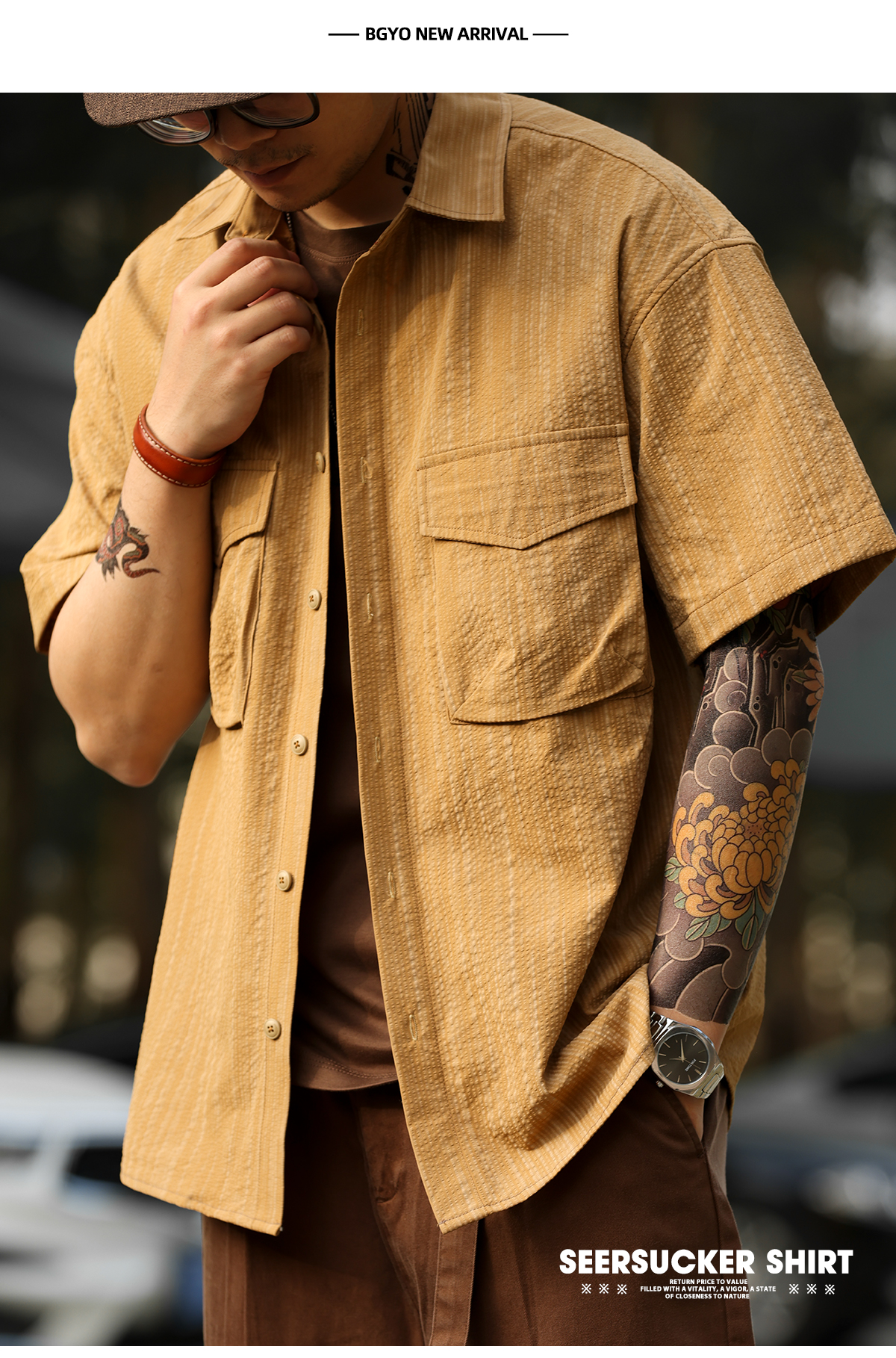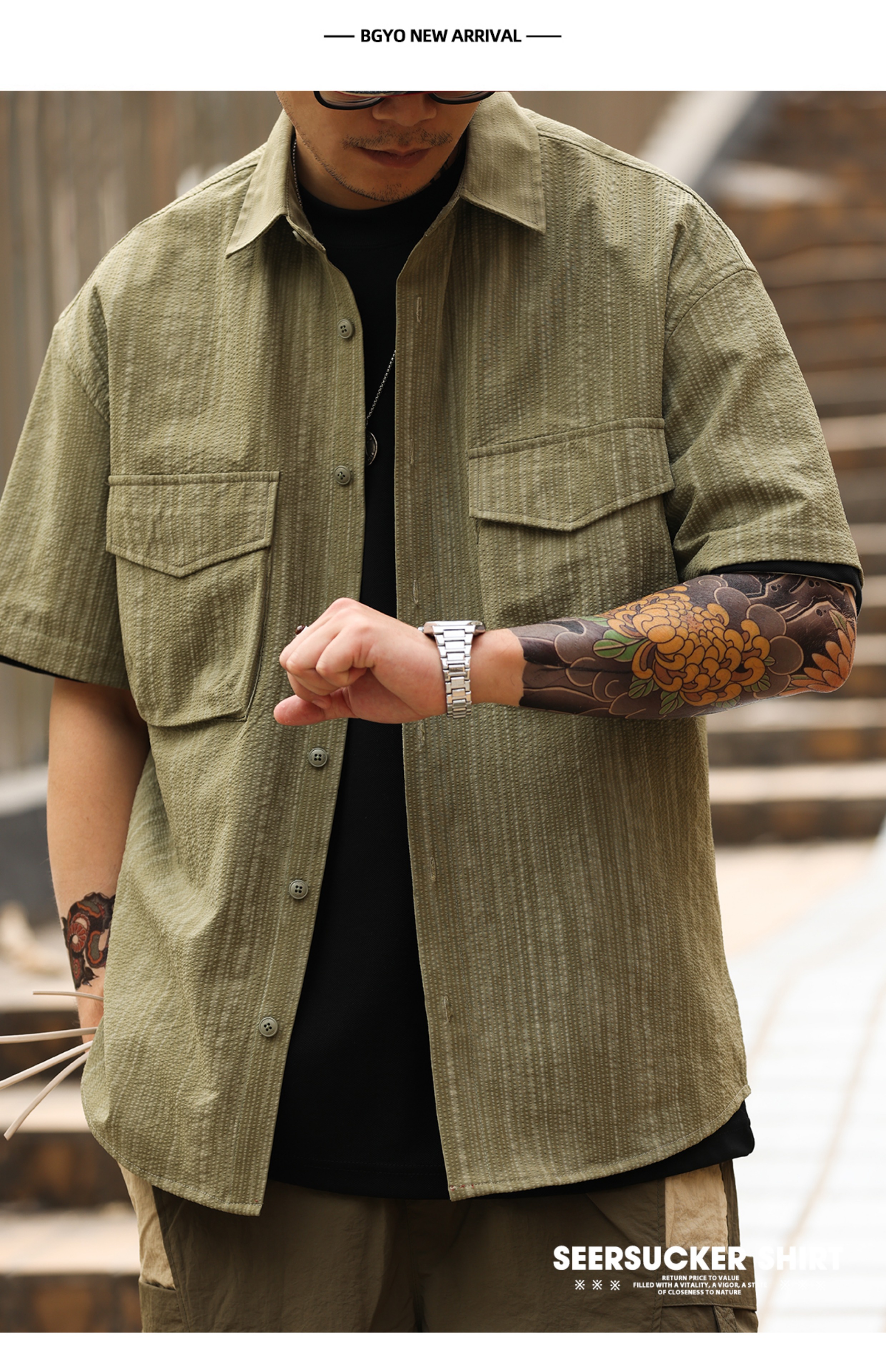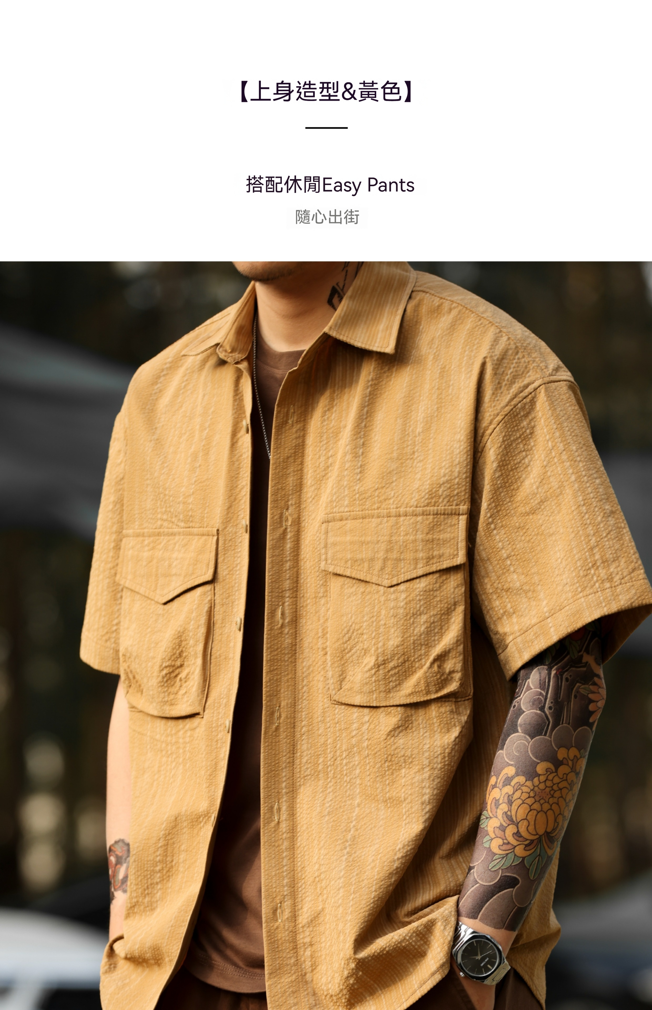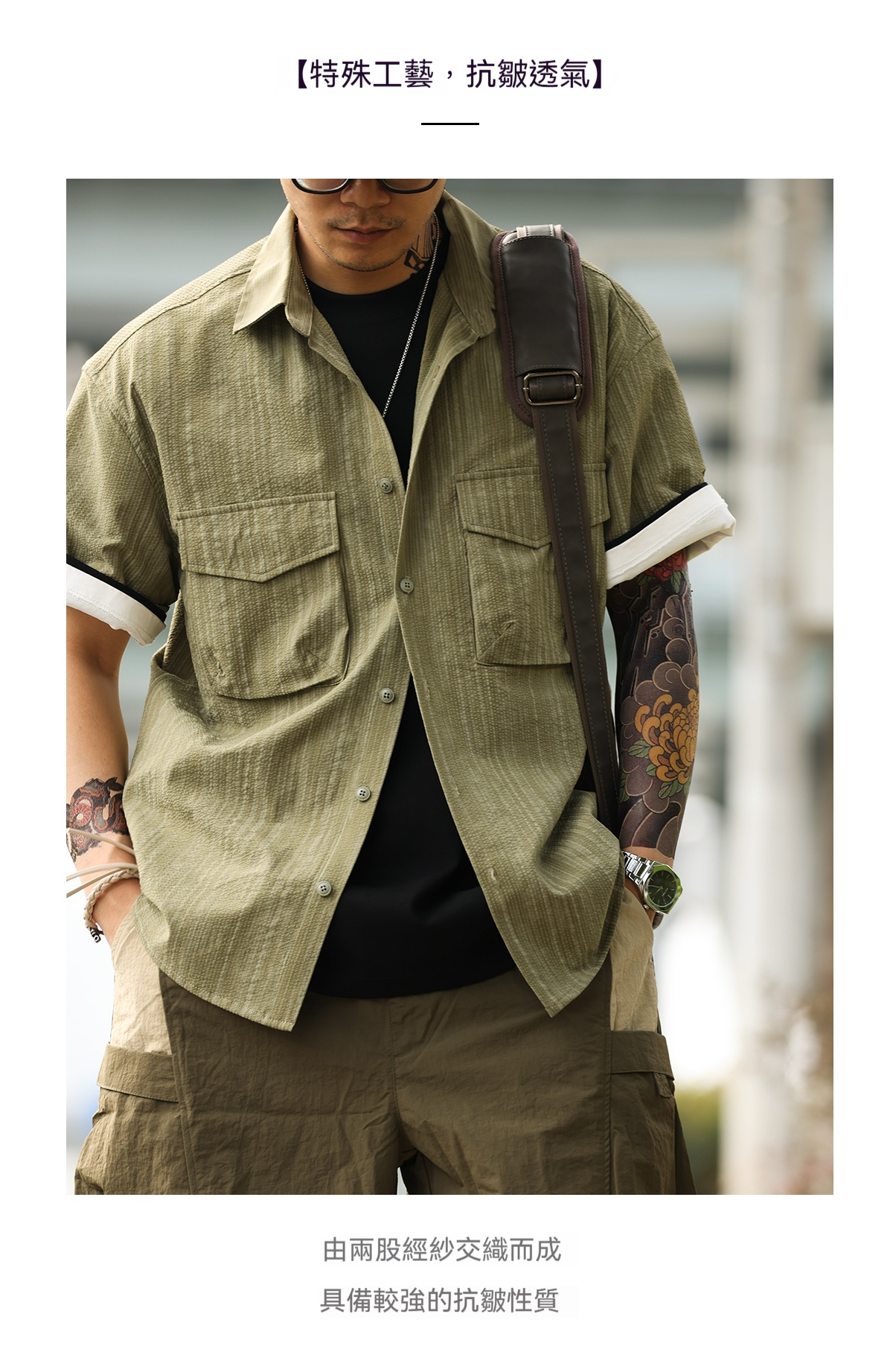 美式復古泡泡紗短袖襯衫男雙口袋暗紋翻領120g工裝襯衣