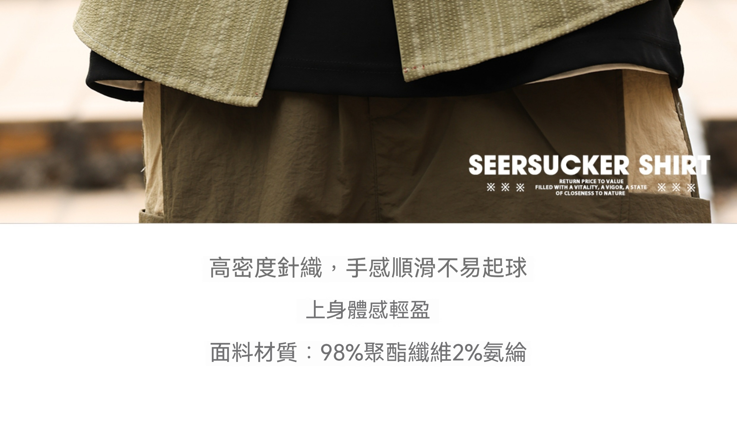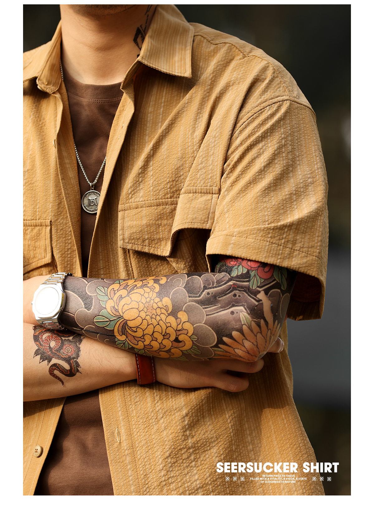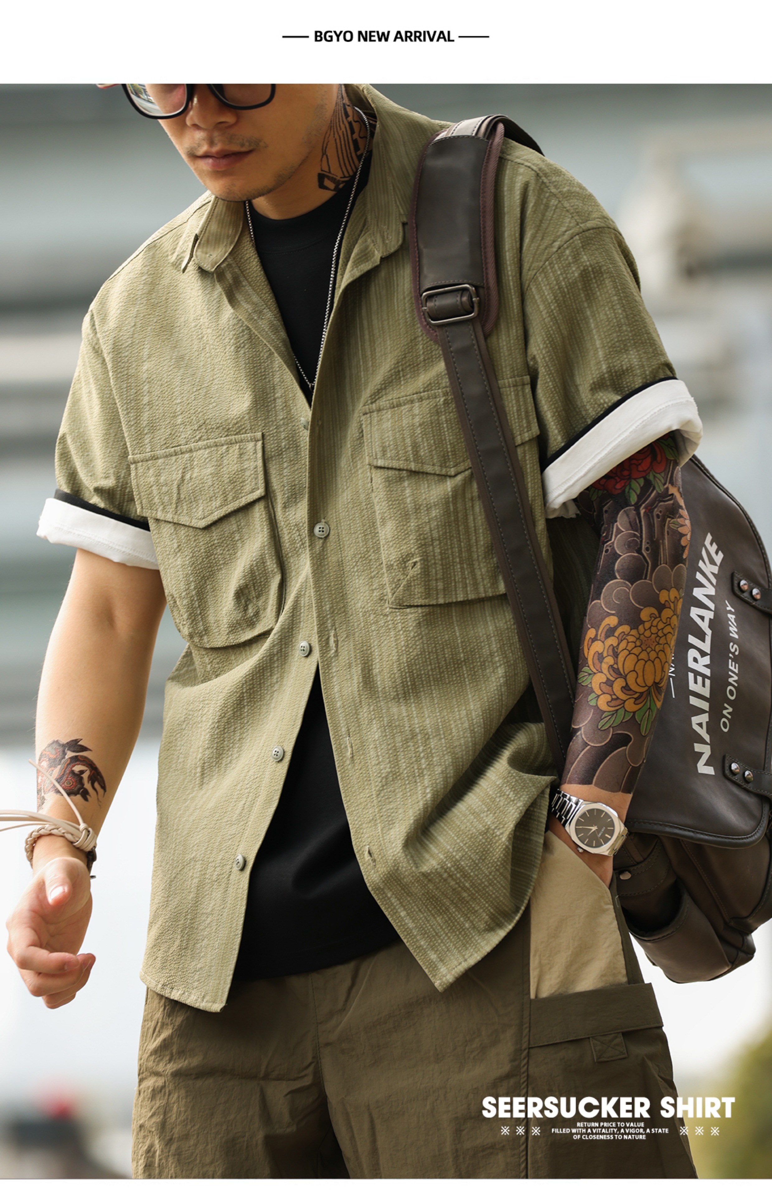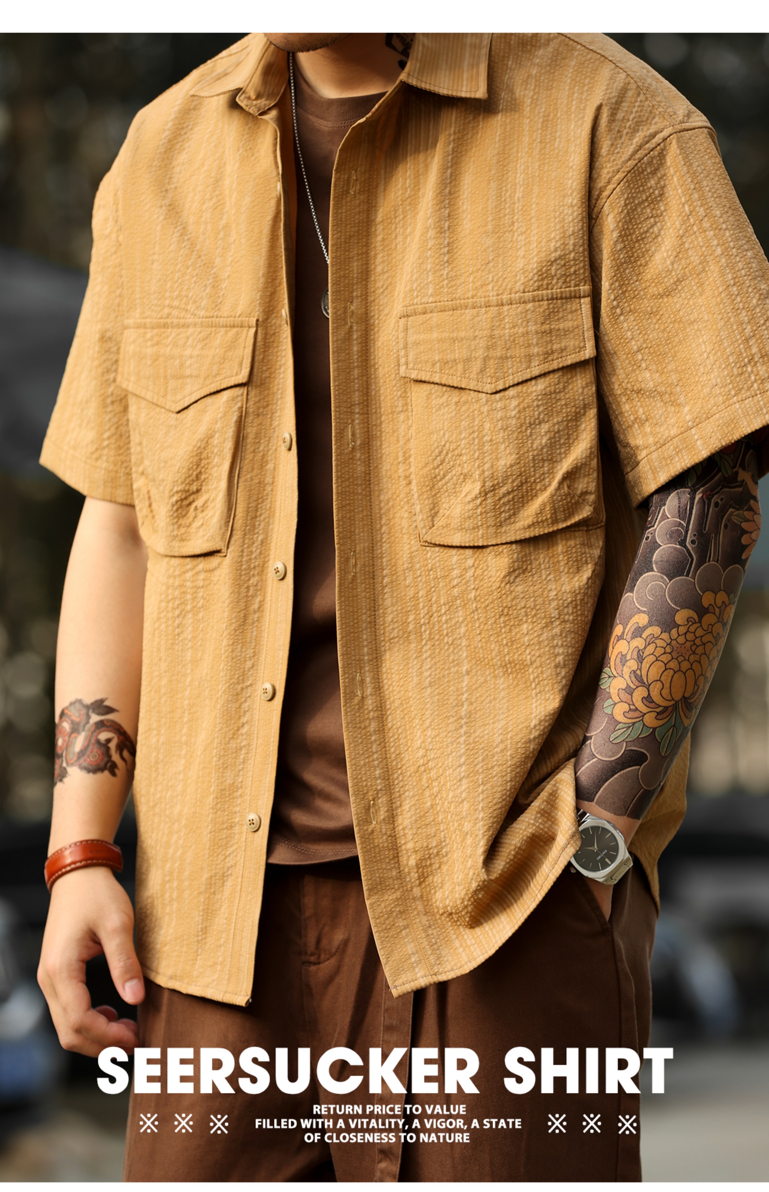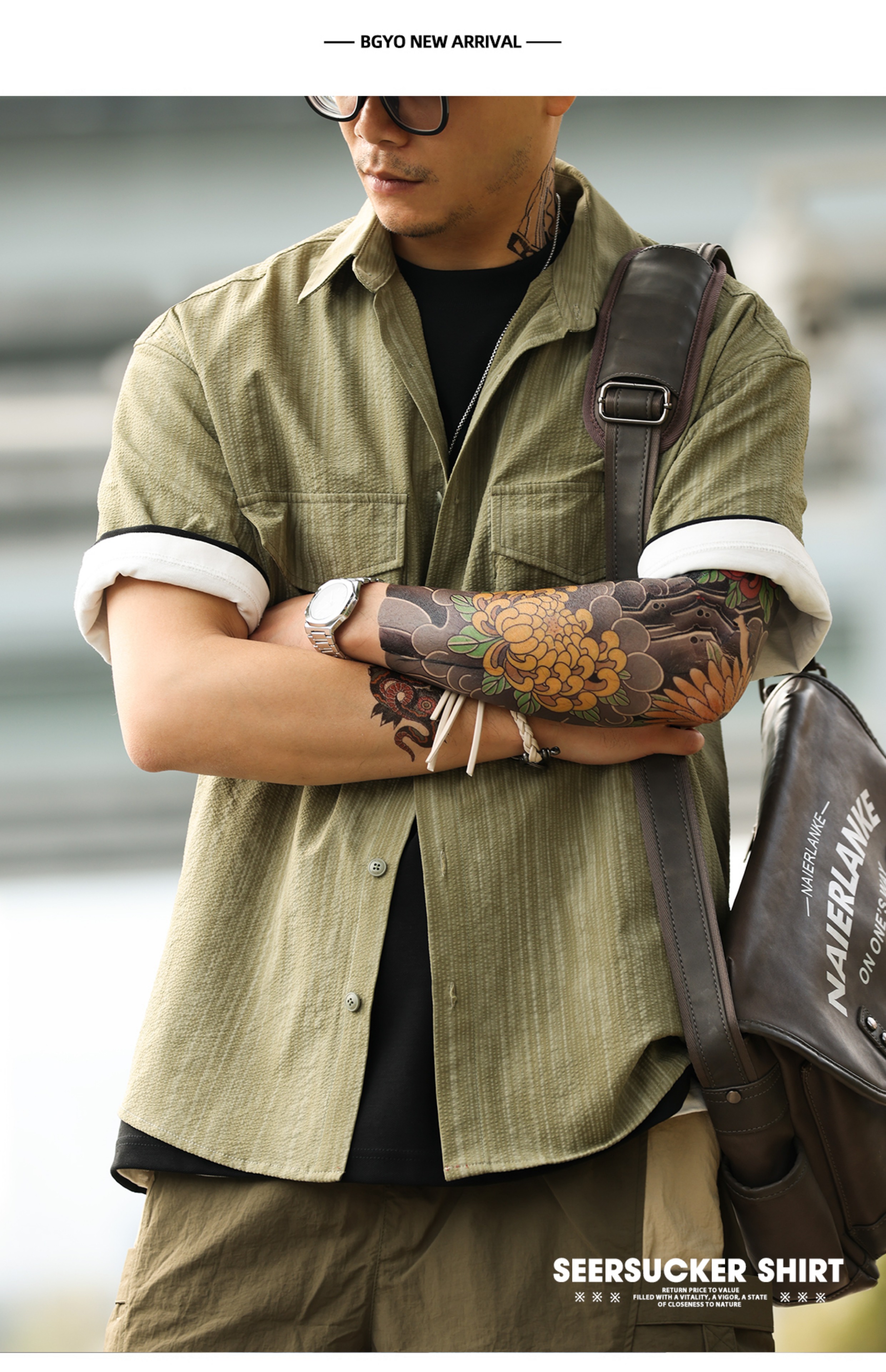 美式復古泡泡紗短袖襯衫男雙口袋暗紋翻領120g工裝襯衣