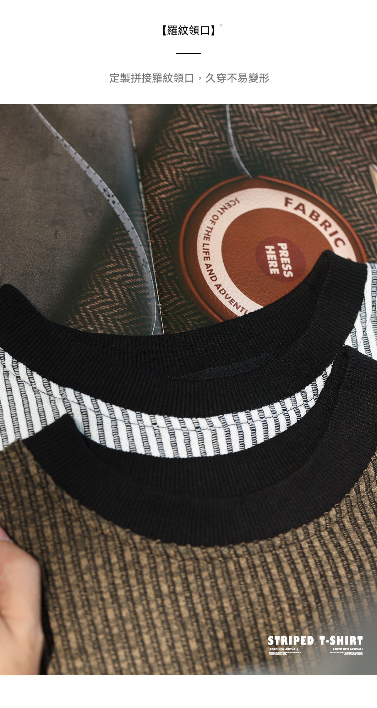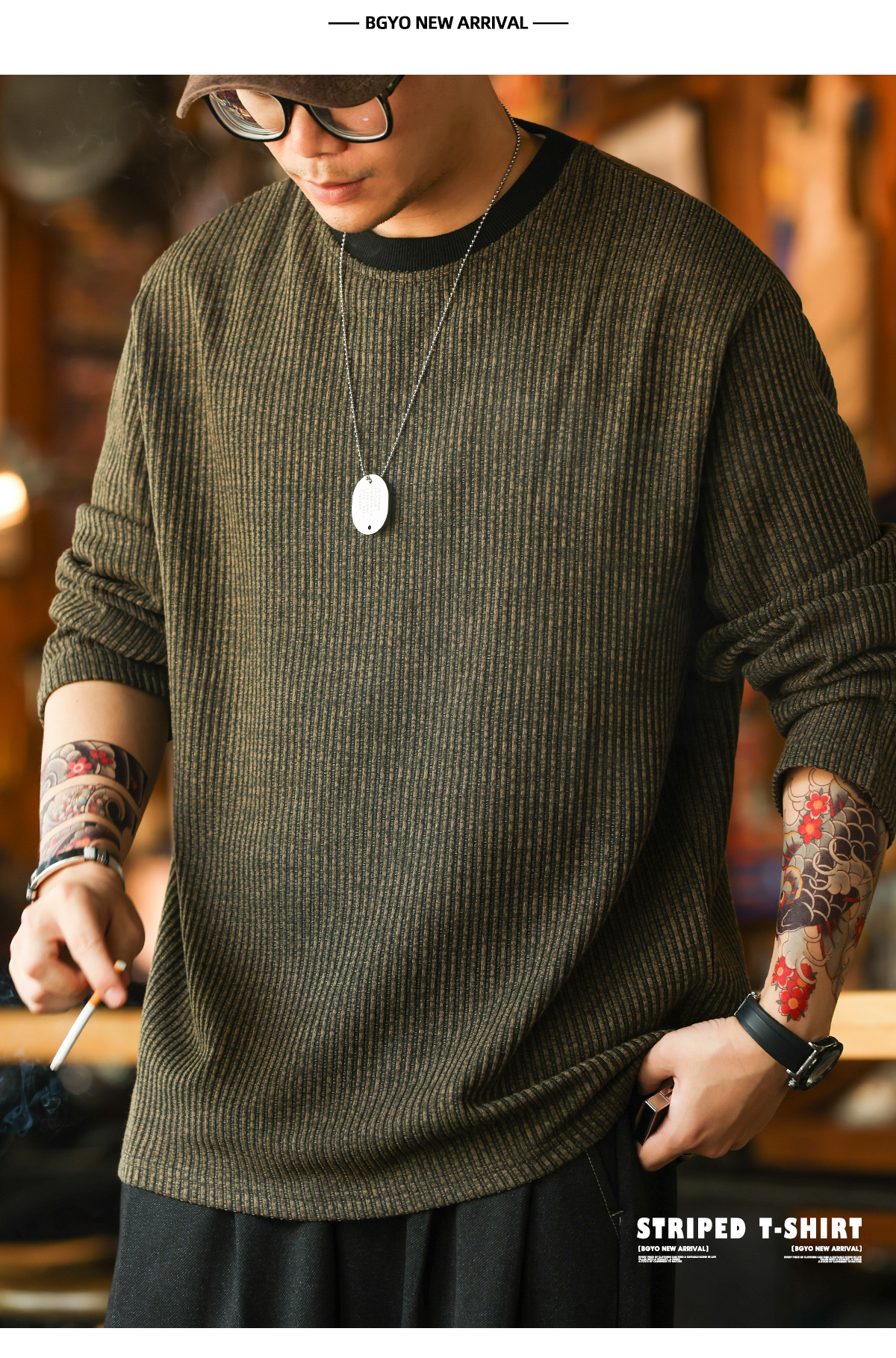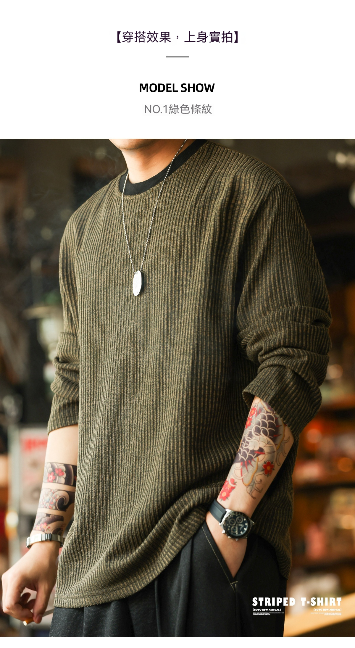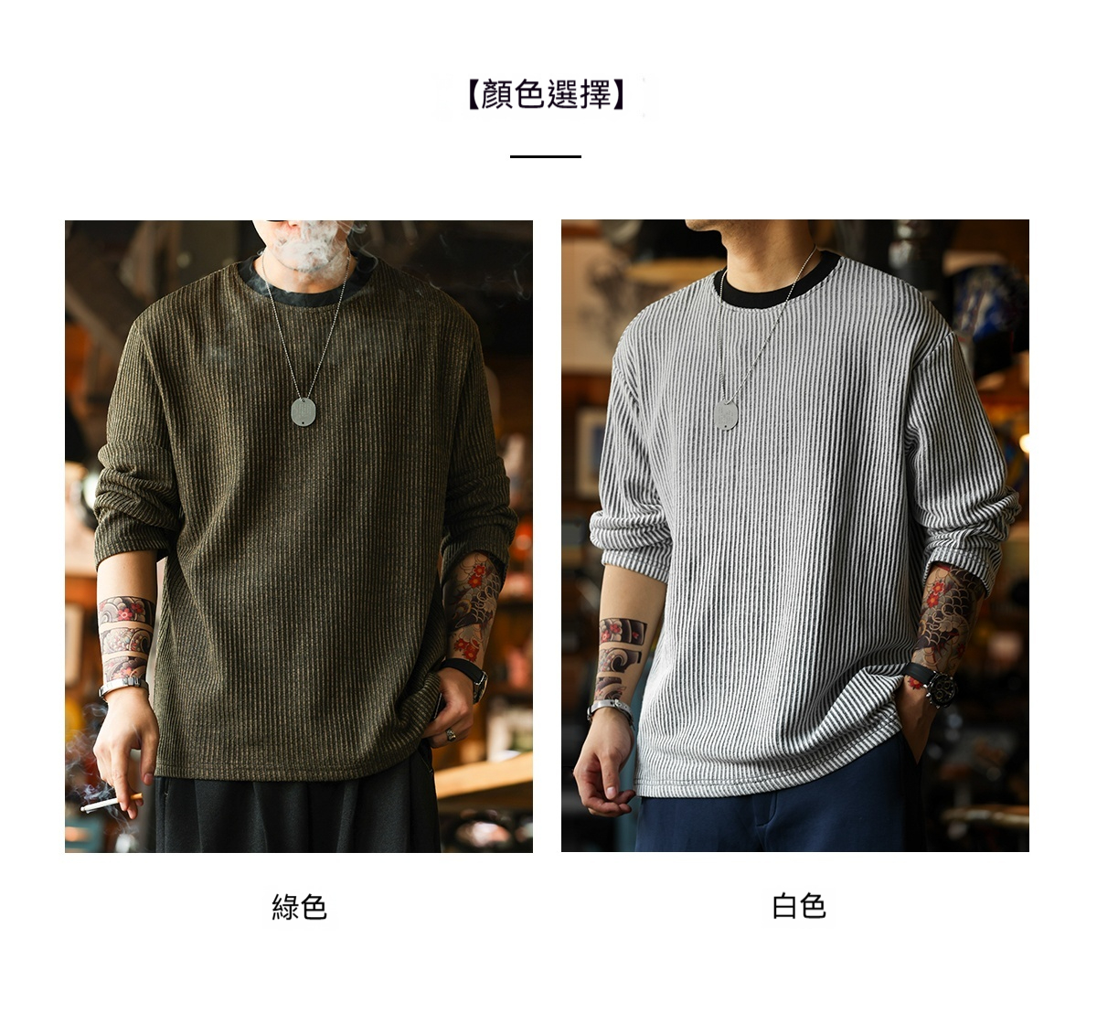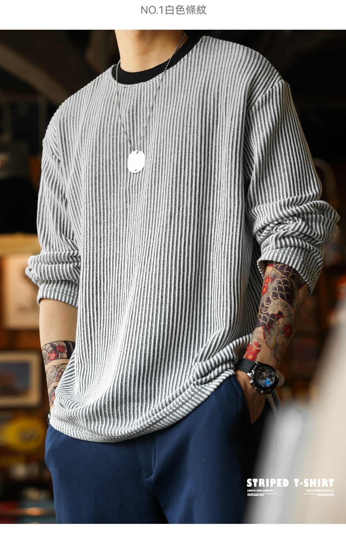 美式復古豎坑條肌理長袖T恤男撞色圓領慵懶感休閒上衣秋