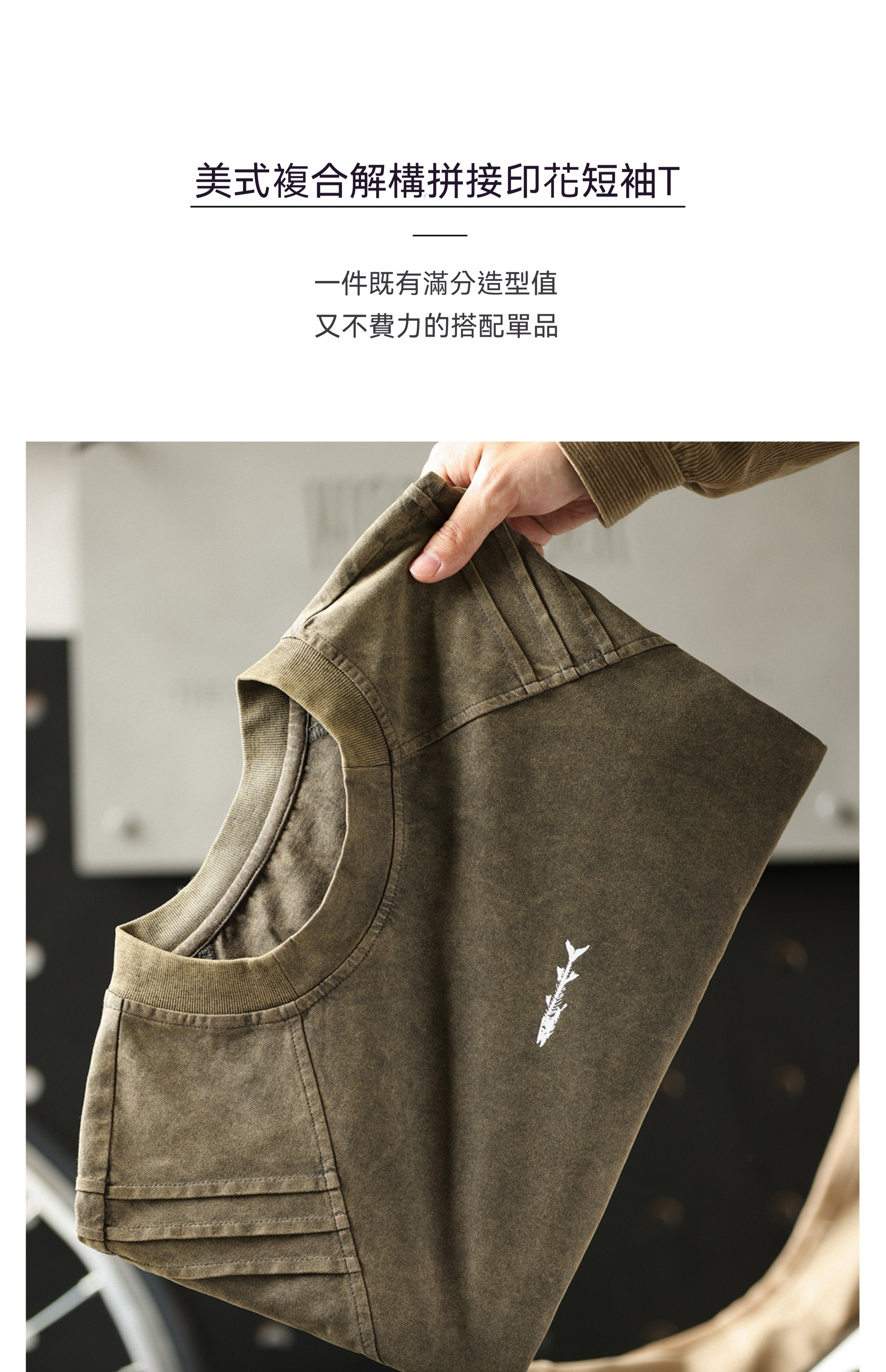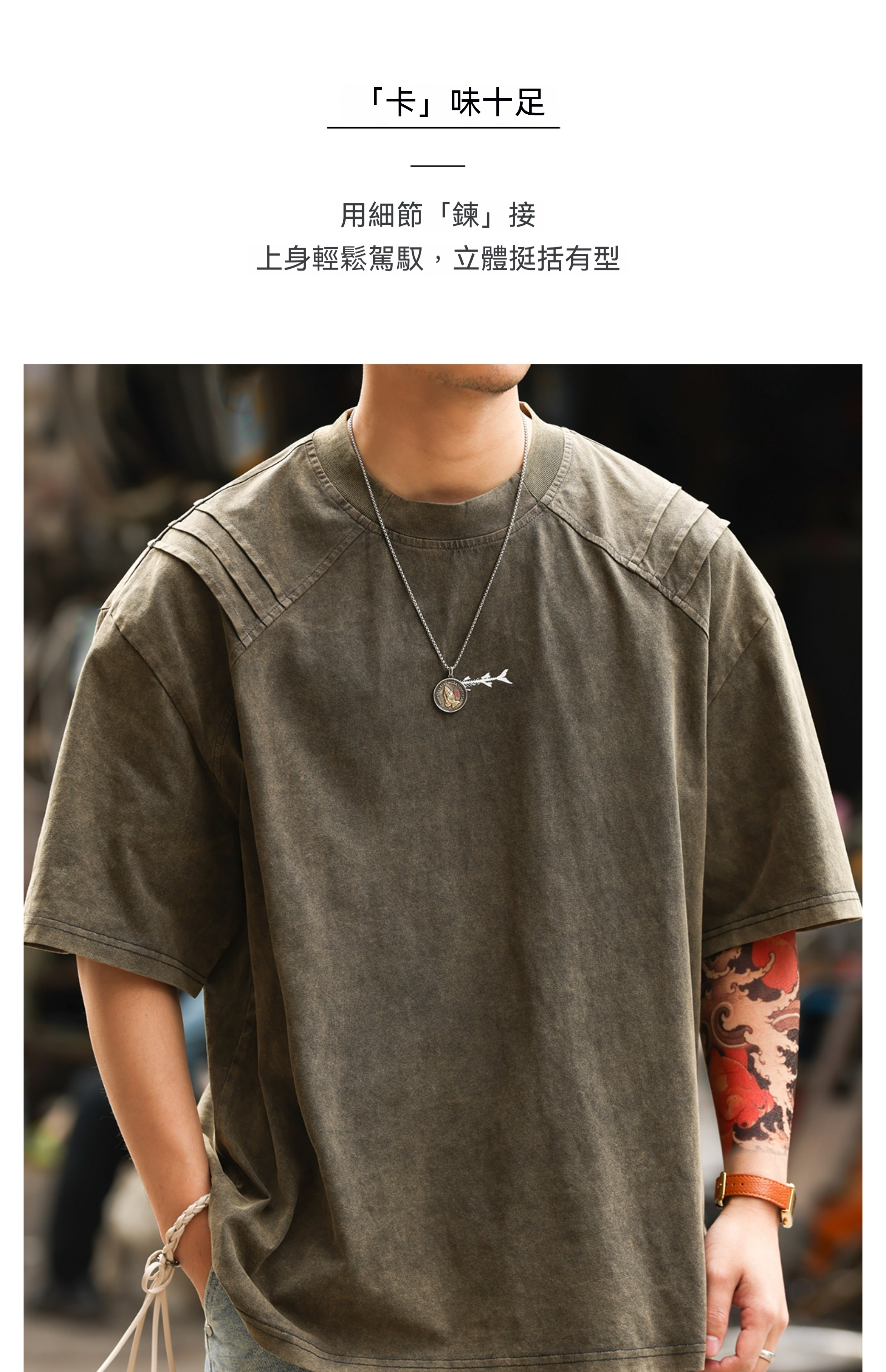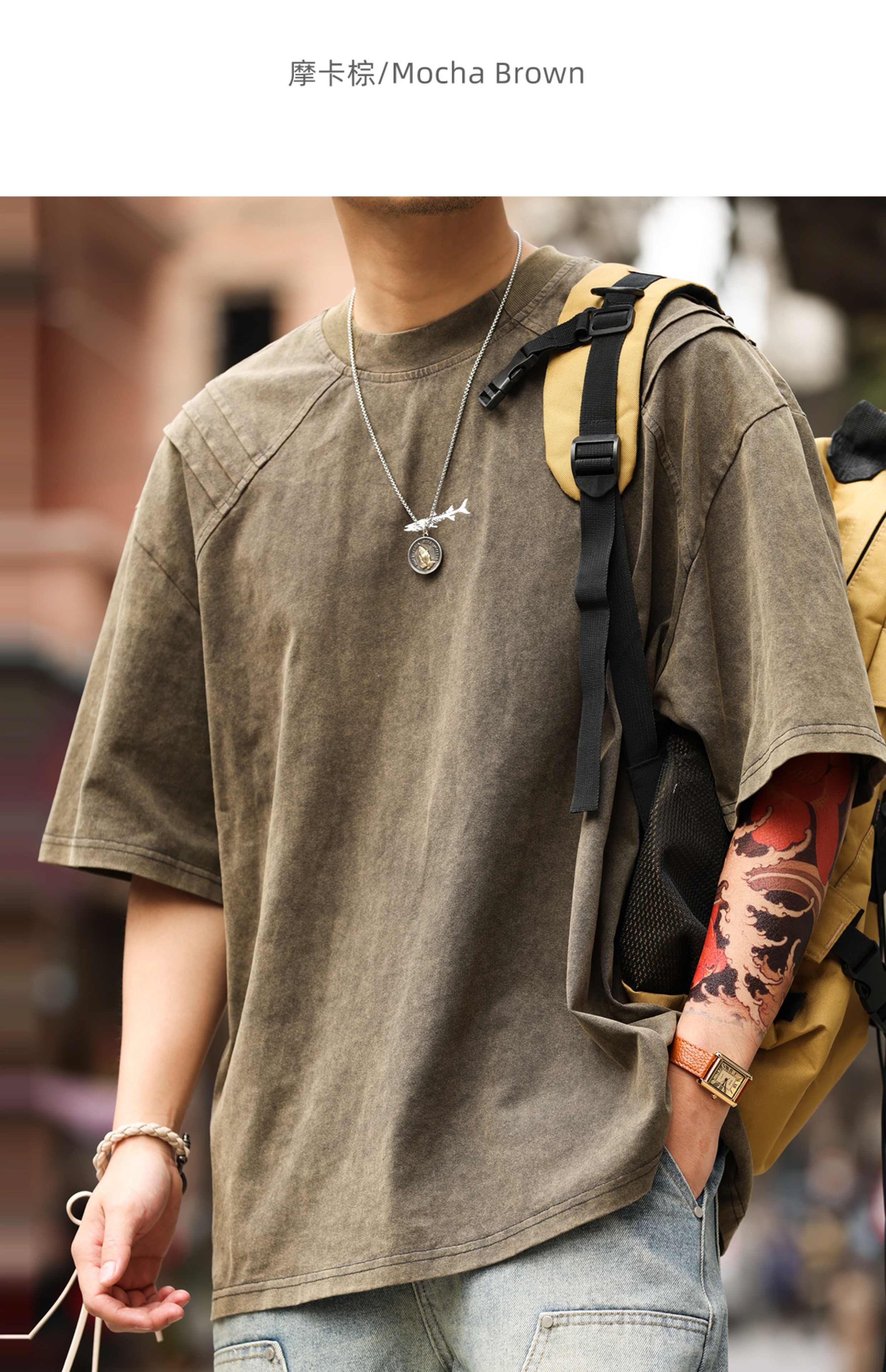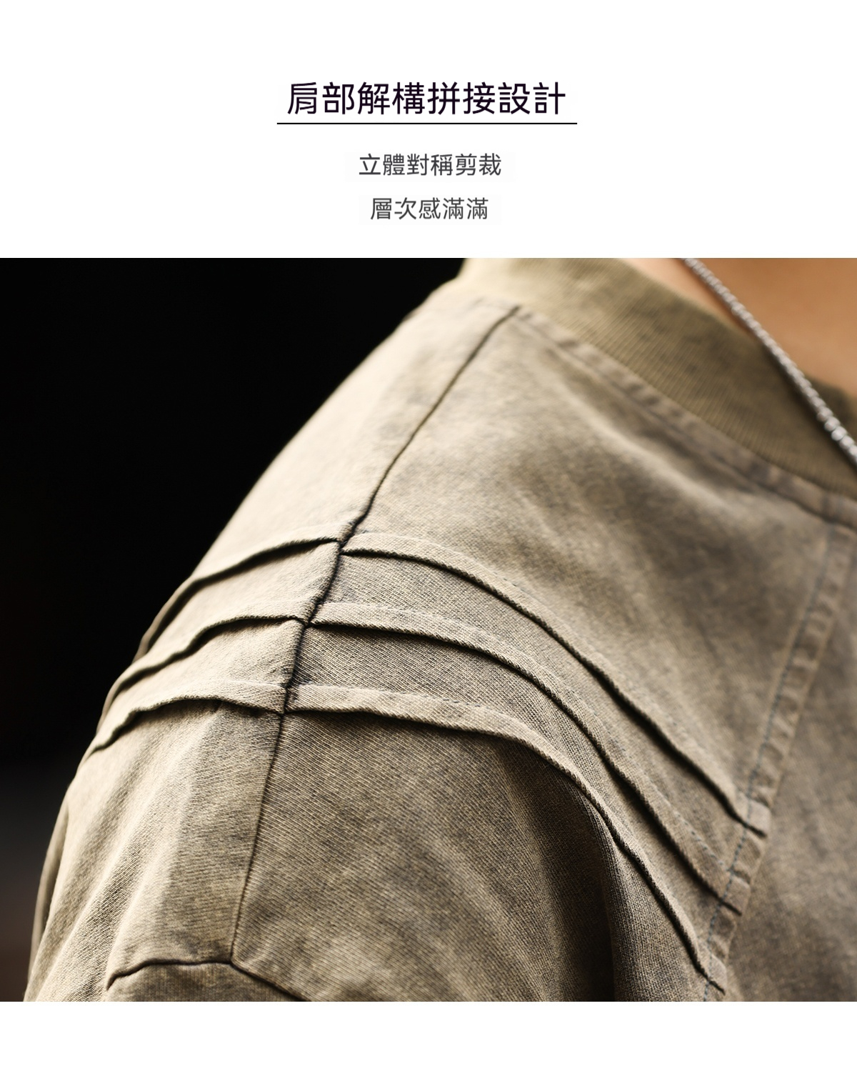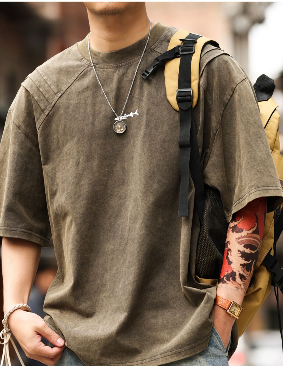 美式復古鯊魚腮設計短袖T恤男225g成服染色做舊硬漢上衣
