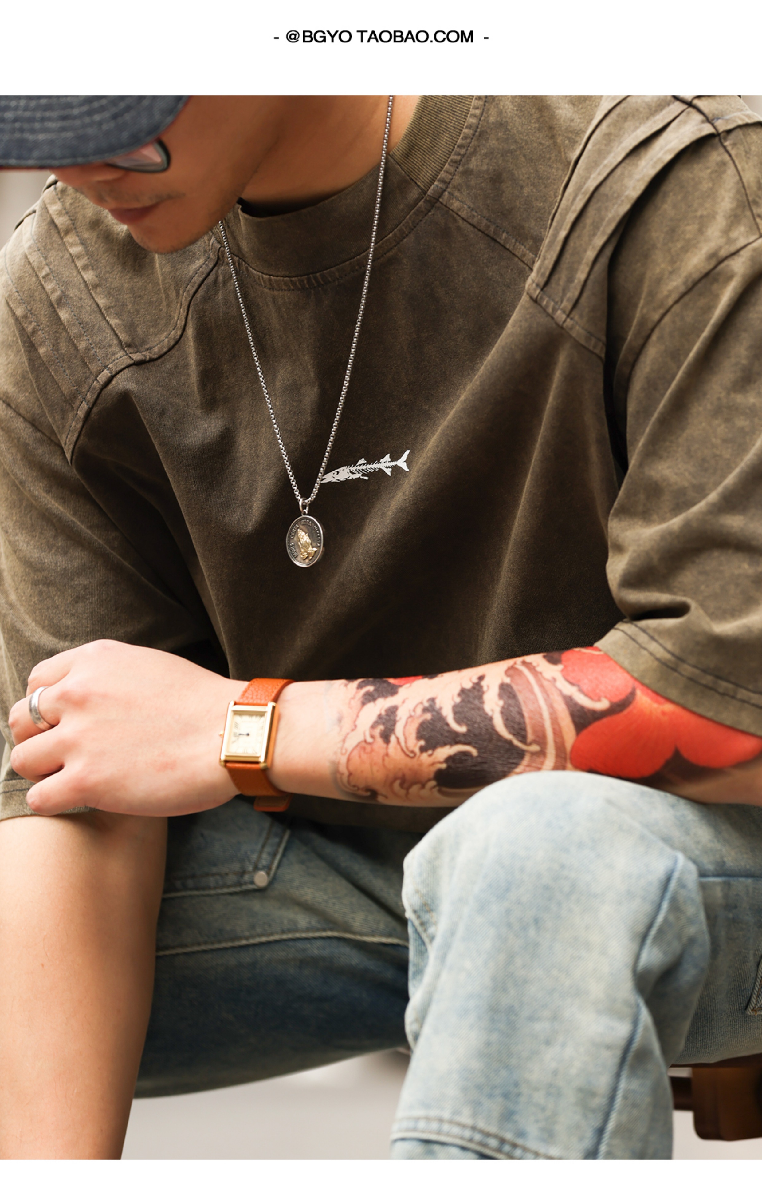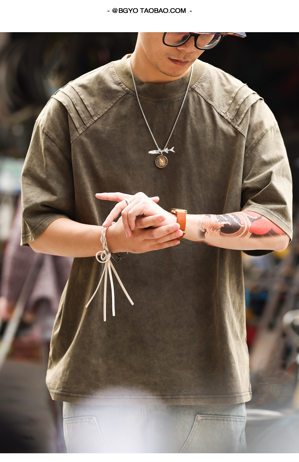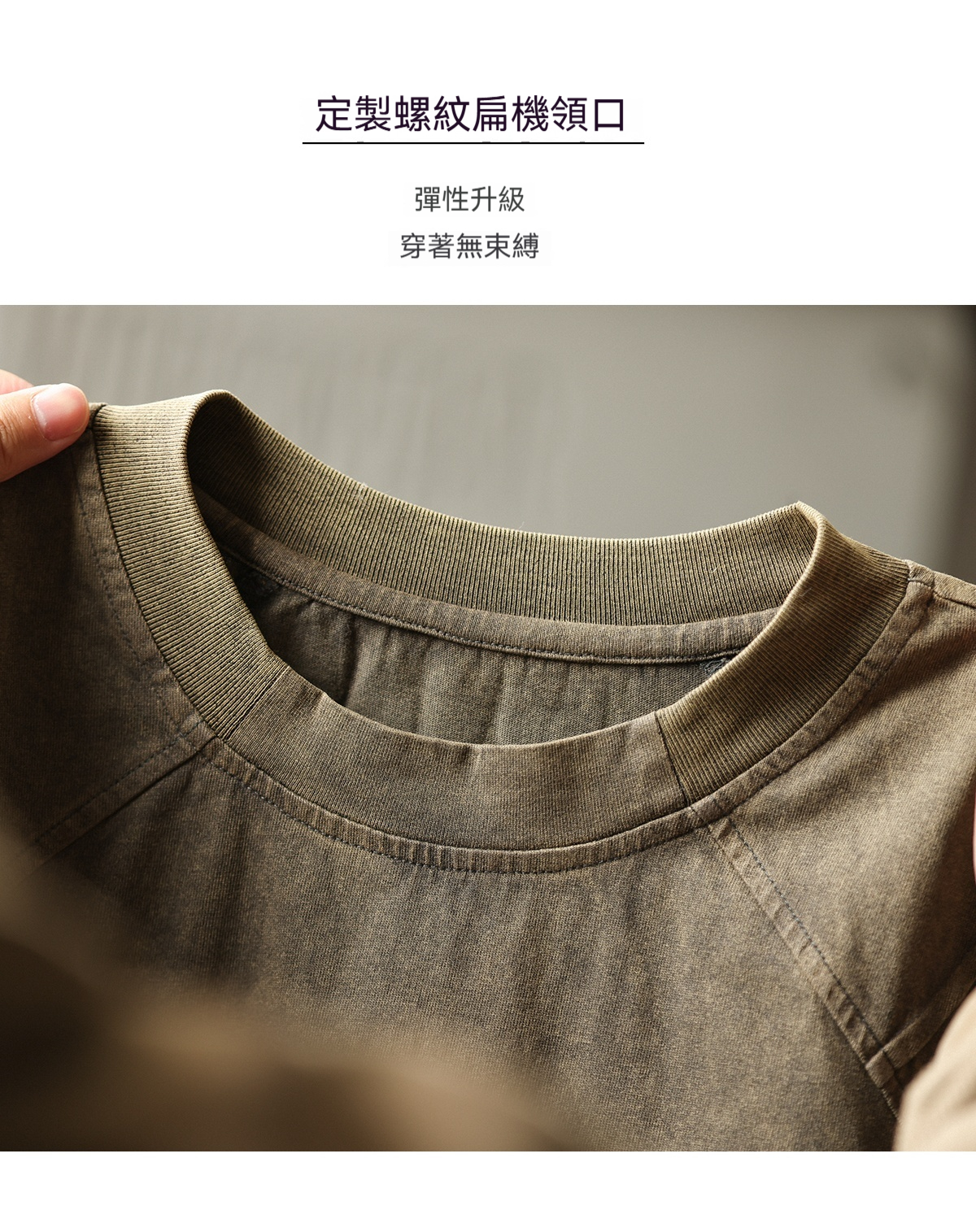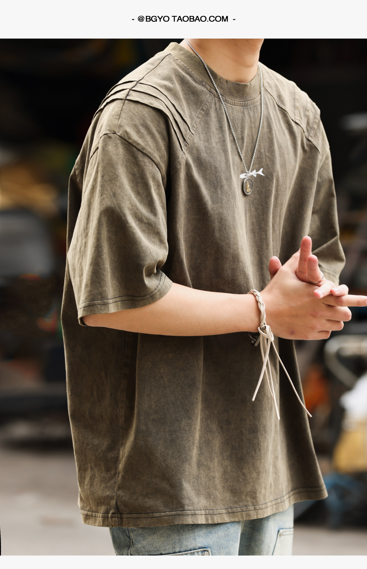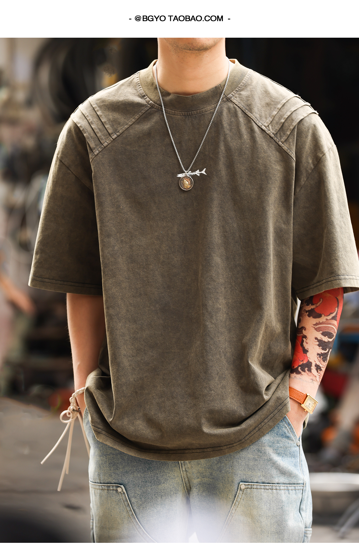美式復古鯊魚腮設計短袖T恤男225g成服染色做舊硬漢上衣